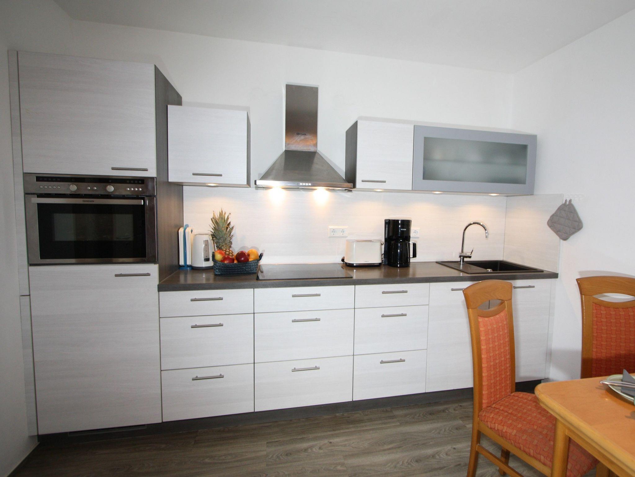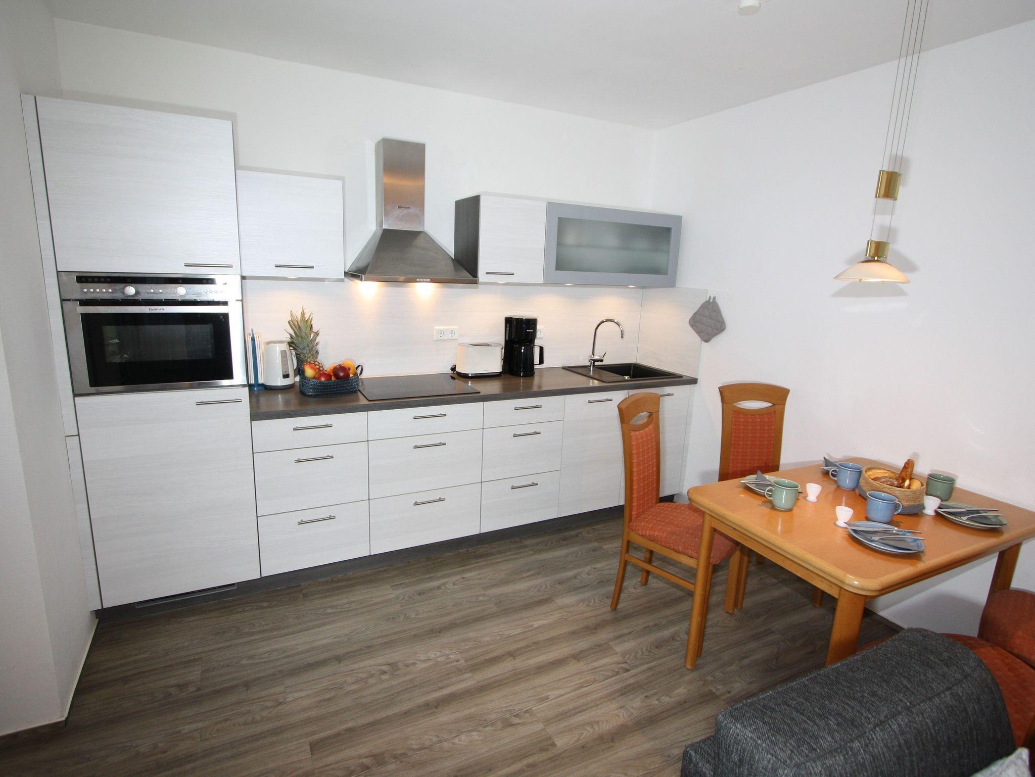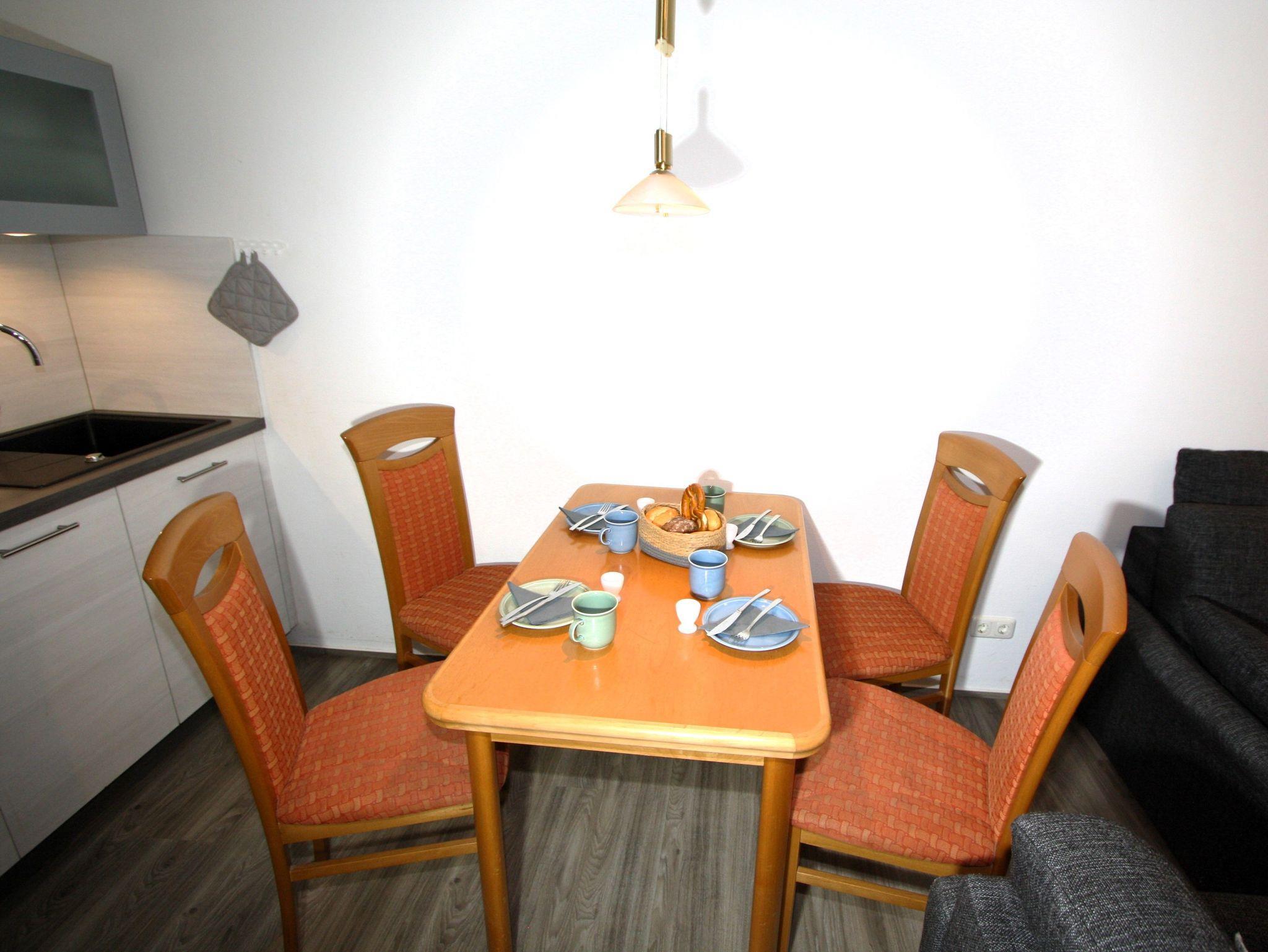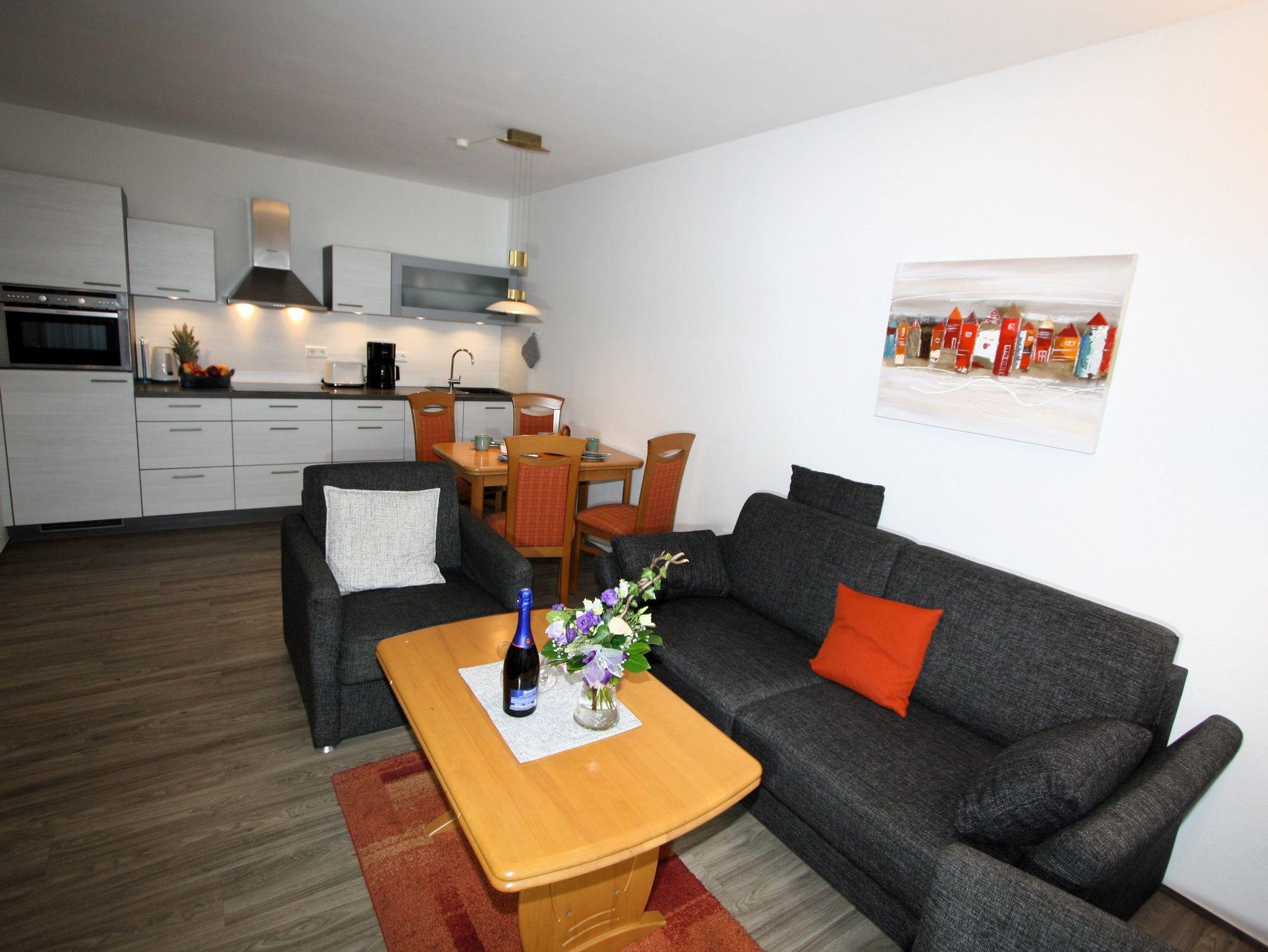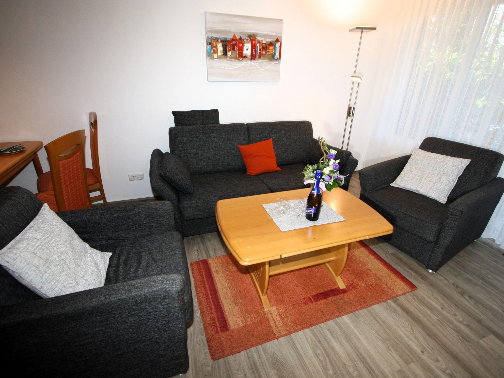 Hier wohnen Sie in einem ruhigen 2-Zimmer-Appartement für bis zu 4 Personen auf ca. 48 m² Wohnfläche im Erdgeschoss.Die Wohnung hat einen Schlafraum mit Doppelbett und der Möglichkeit, ein Babybett dazuzustellen. Im Wohnzimmer befindet sich ein separater Essplatz mit ausziehbarem Esstisch und einer voll ausgestatteten Küchenzeile. Zwei weitere Schlafplätze sind auf einer bequemen Doppelbettcouch vorhanden.