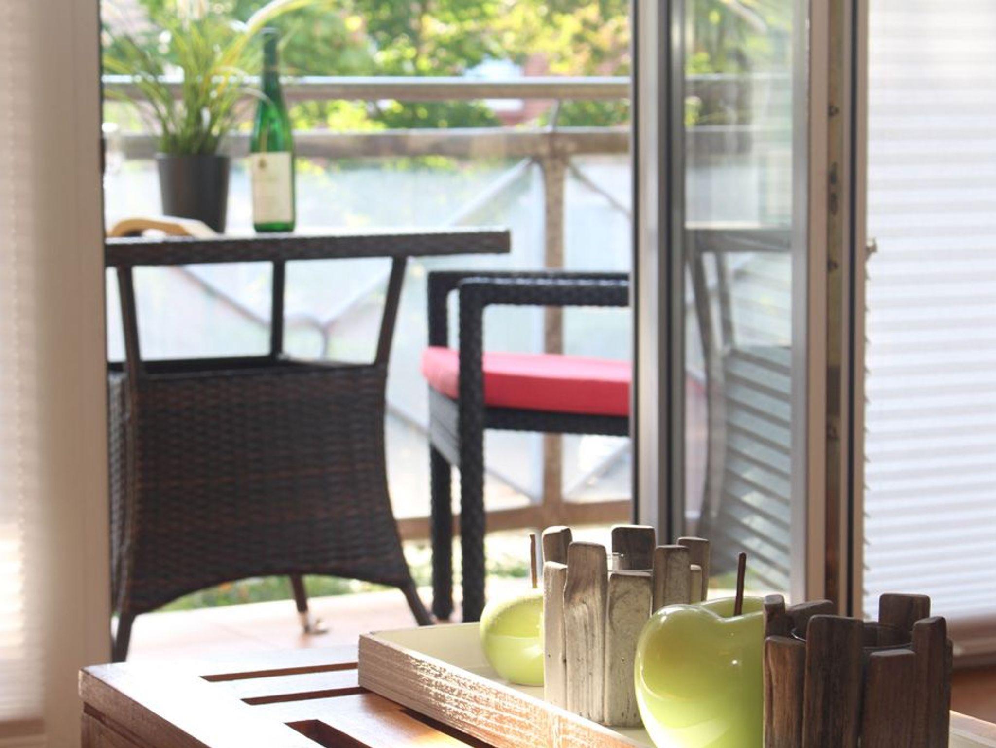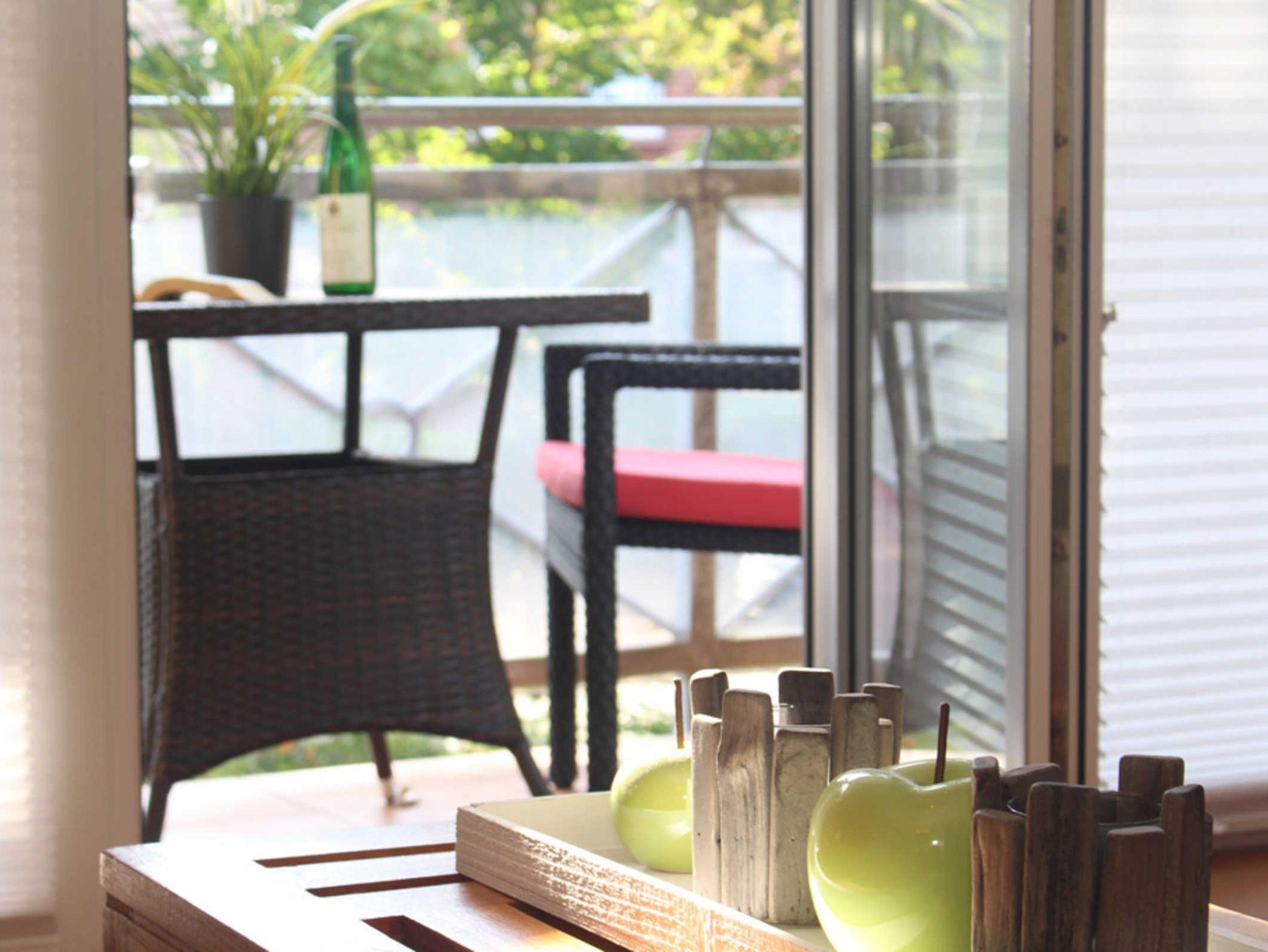 An das mit einem Satelliten-TV, einer Stereoanlage und einer Schlafcouch ausgestattete Wohnzimmer schließt sich ein schöner Südbalkon mit Gartenmöbeln an.