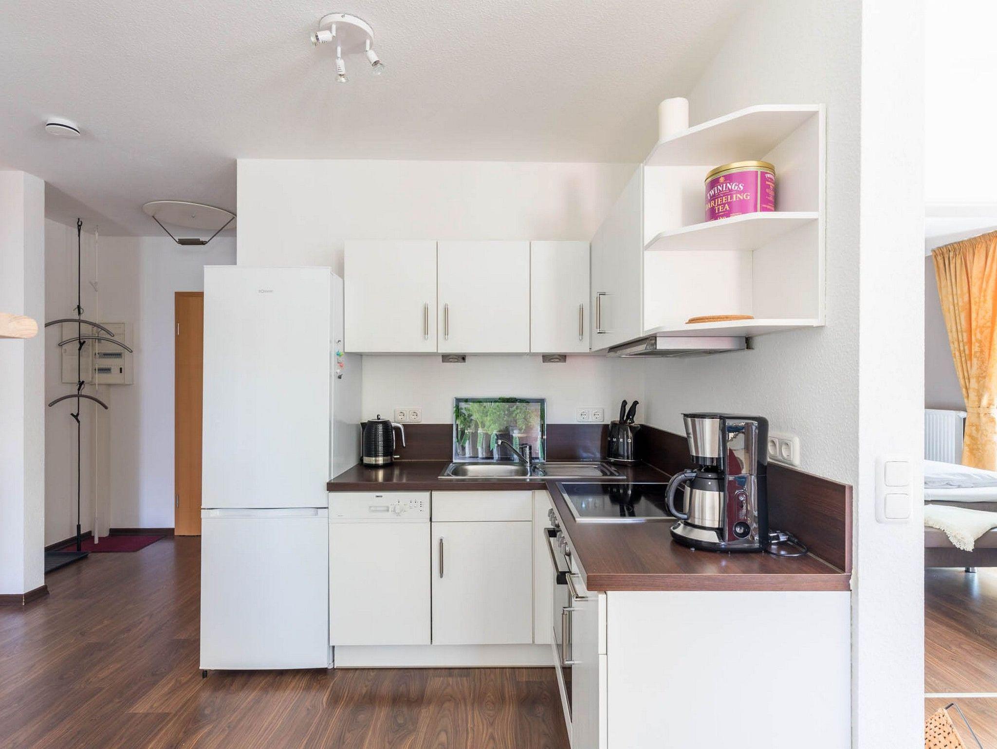 Die moderne, offene Küche ist mit allem eingerichtet, was man benötigt, um kulinarische Gaumenfreuden zu zaubern, z. B. Herd und Backofen sowie Spülmaschine.