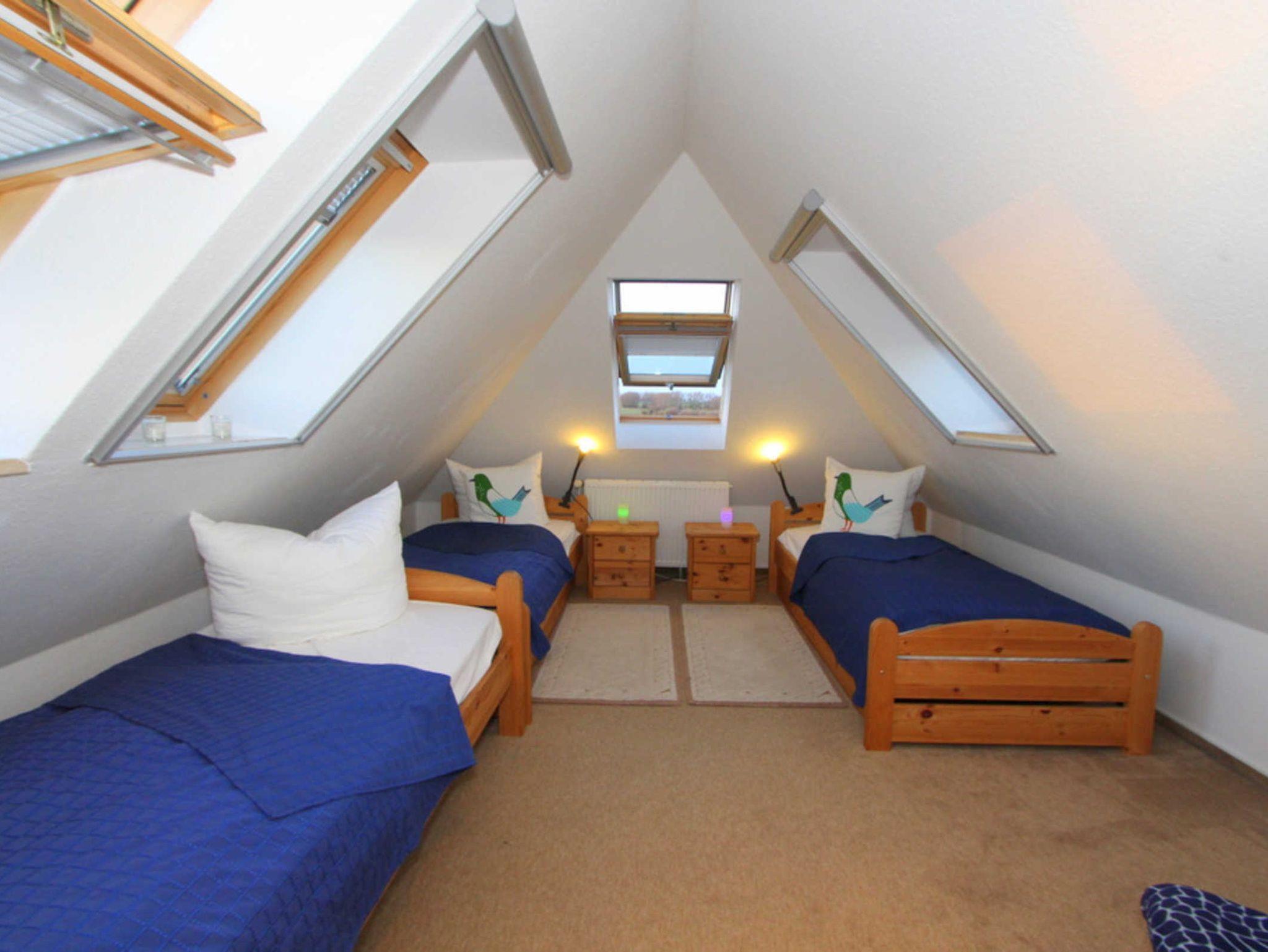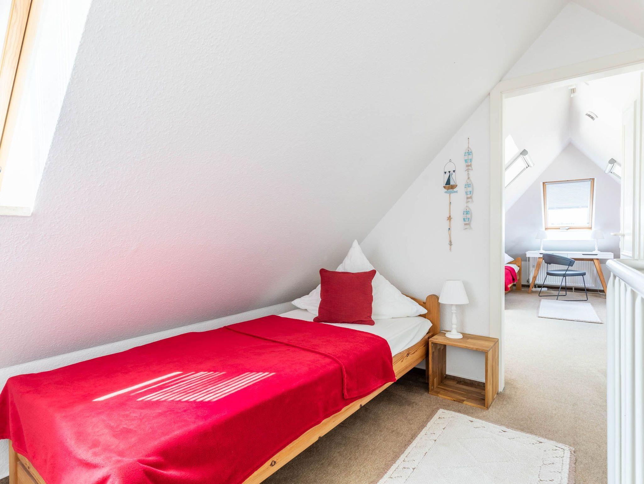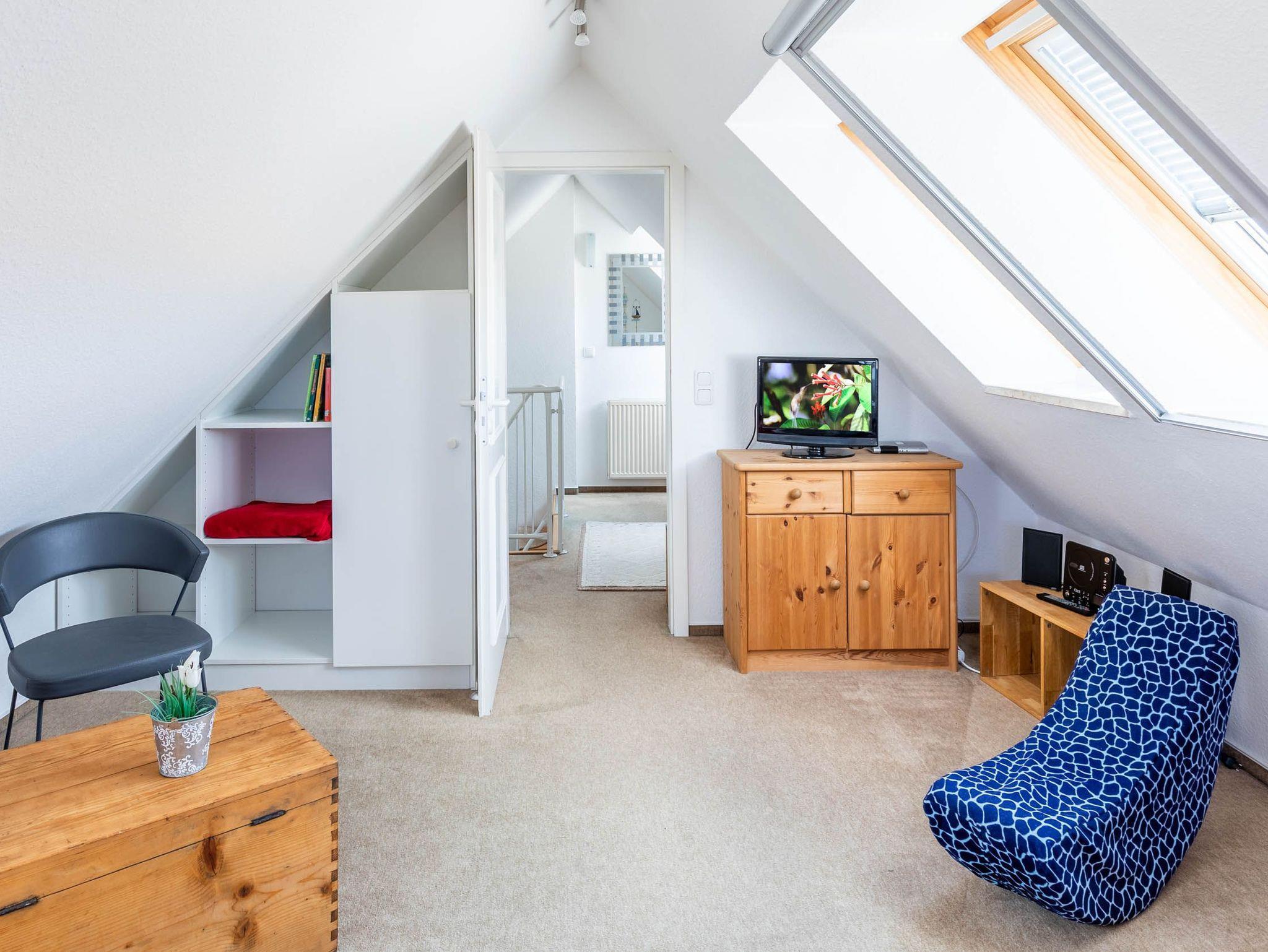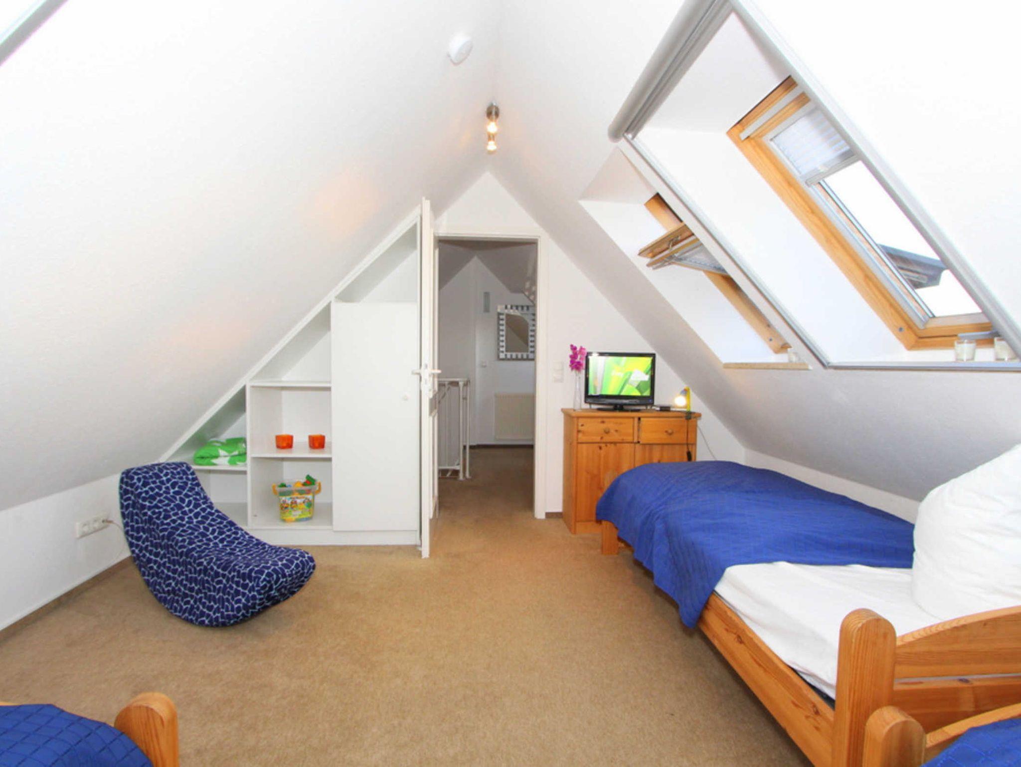 In der zweiten Wohnebene, im Dachgeschoss befindet sich das Kinder-/ Gästezimmer mit 3 Einzelbetten. Das Zimmer ist ebenfalls mit einem Fernseher ausgestattet, der mit dem Streamingdienst Waipu ergänzt wurde.