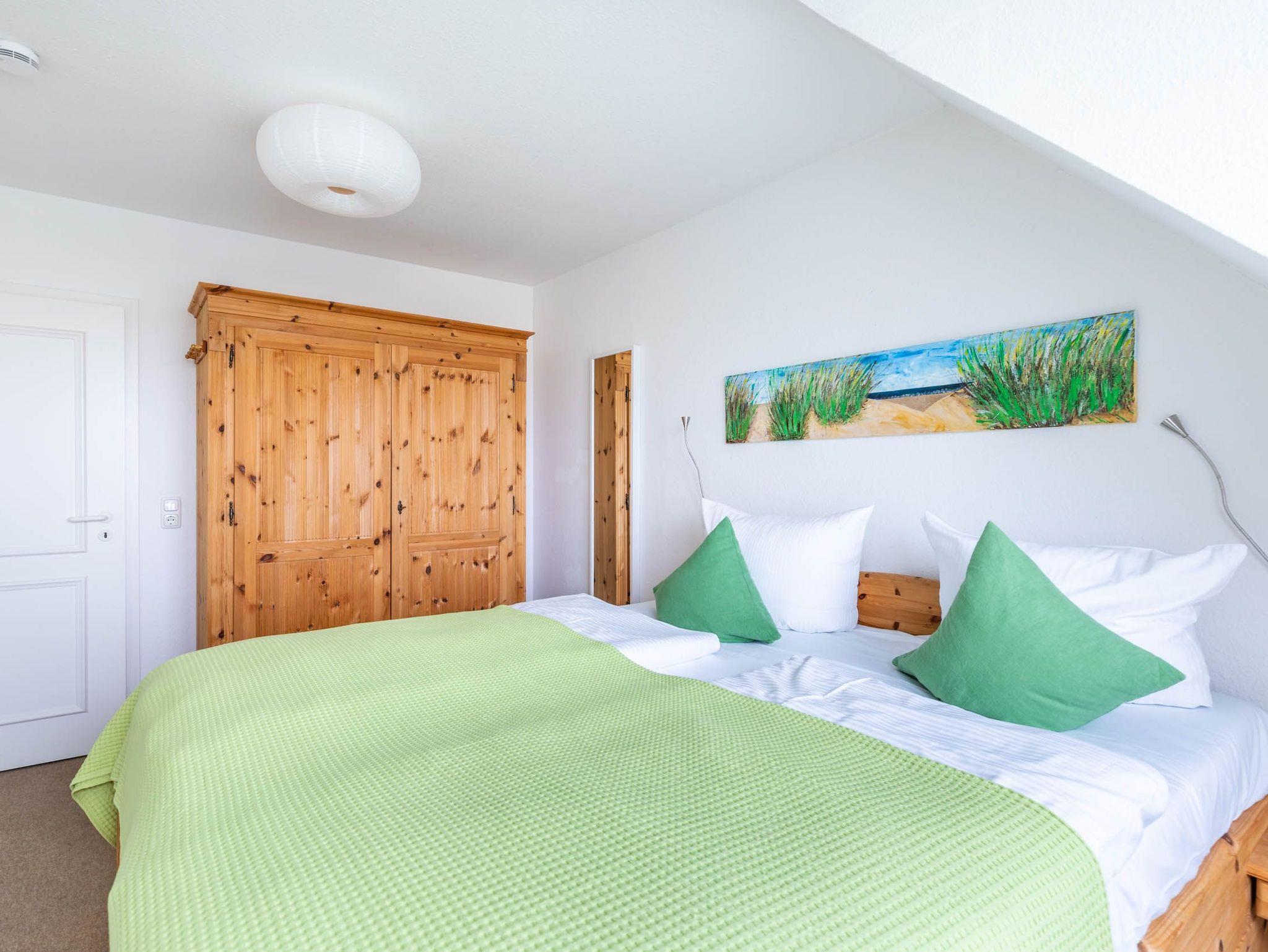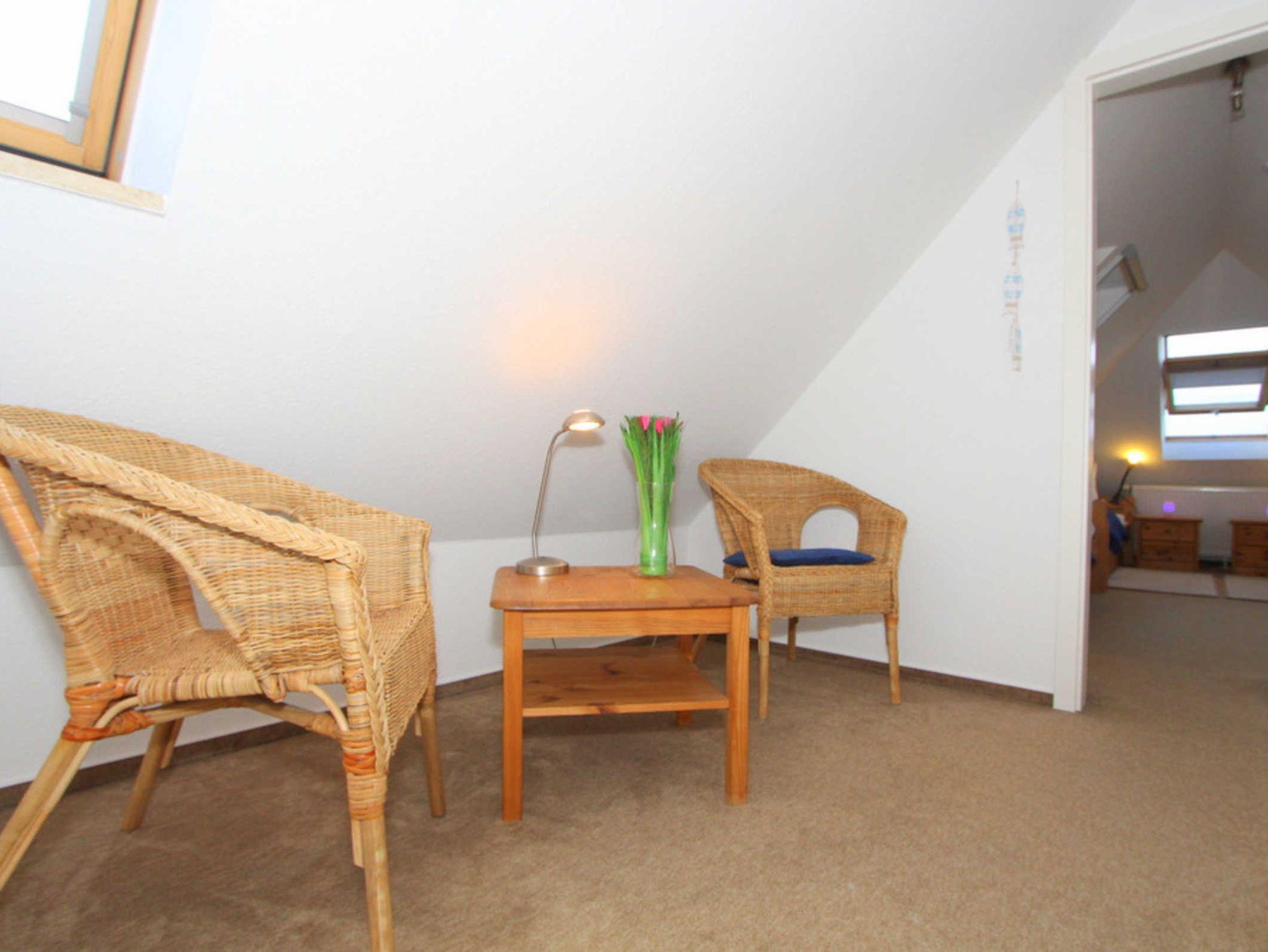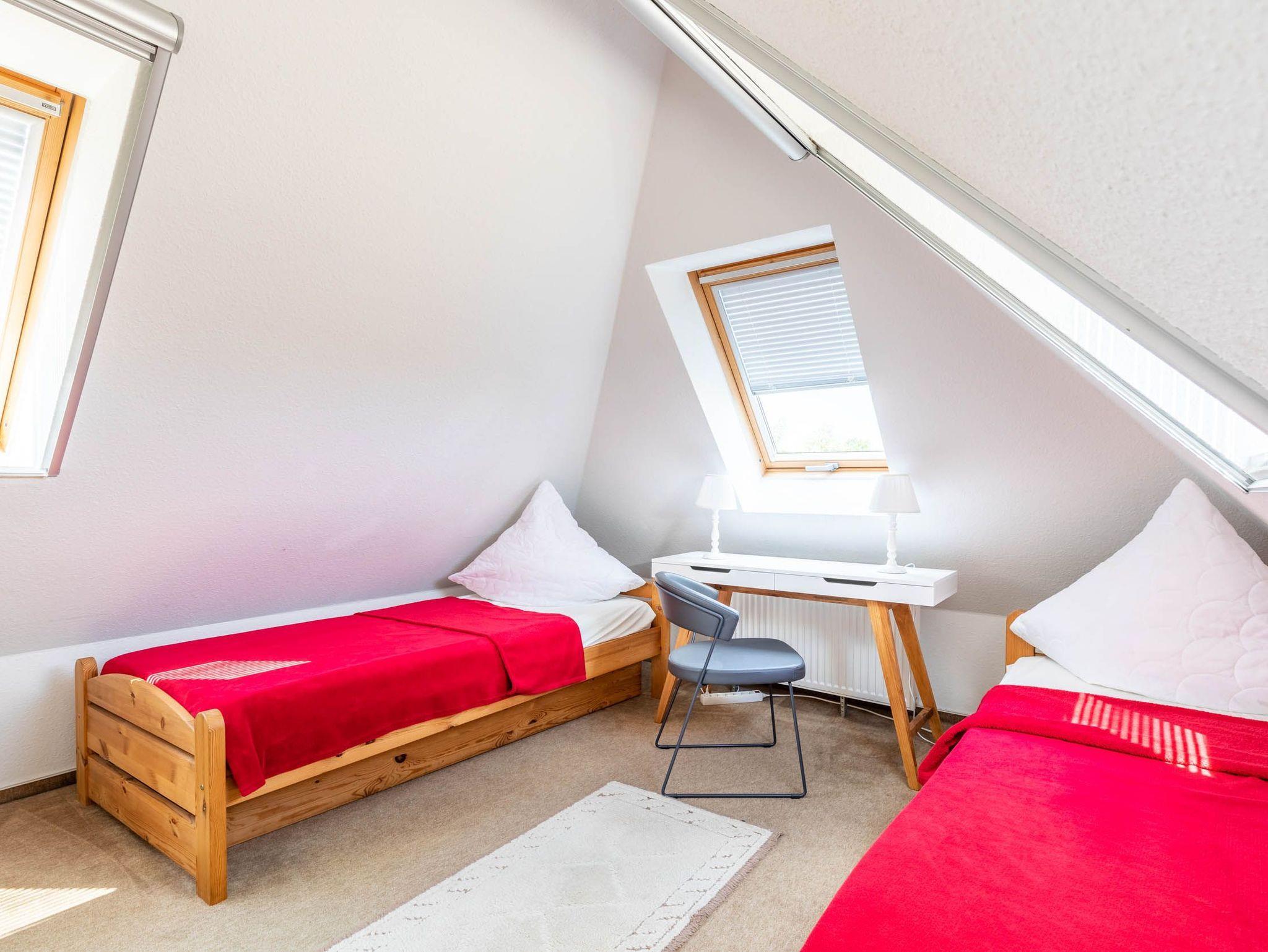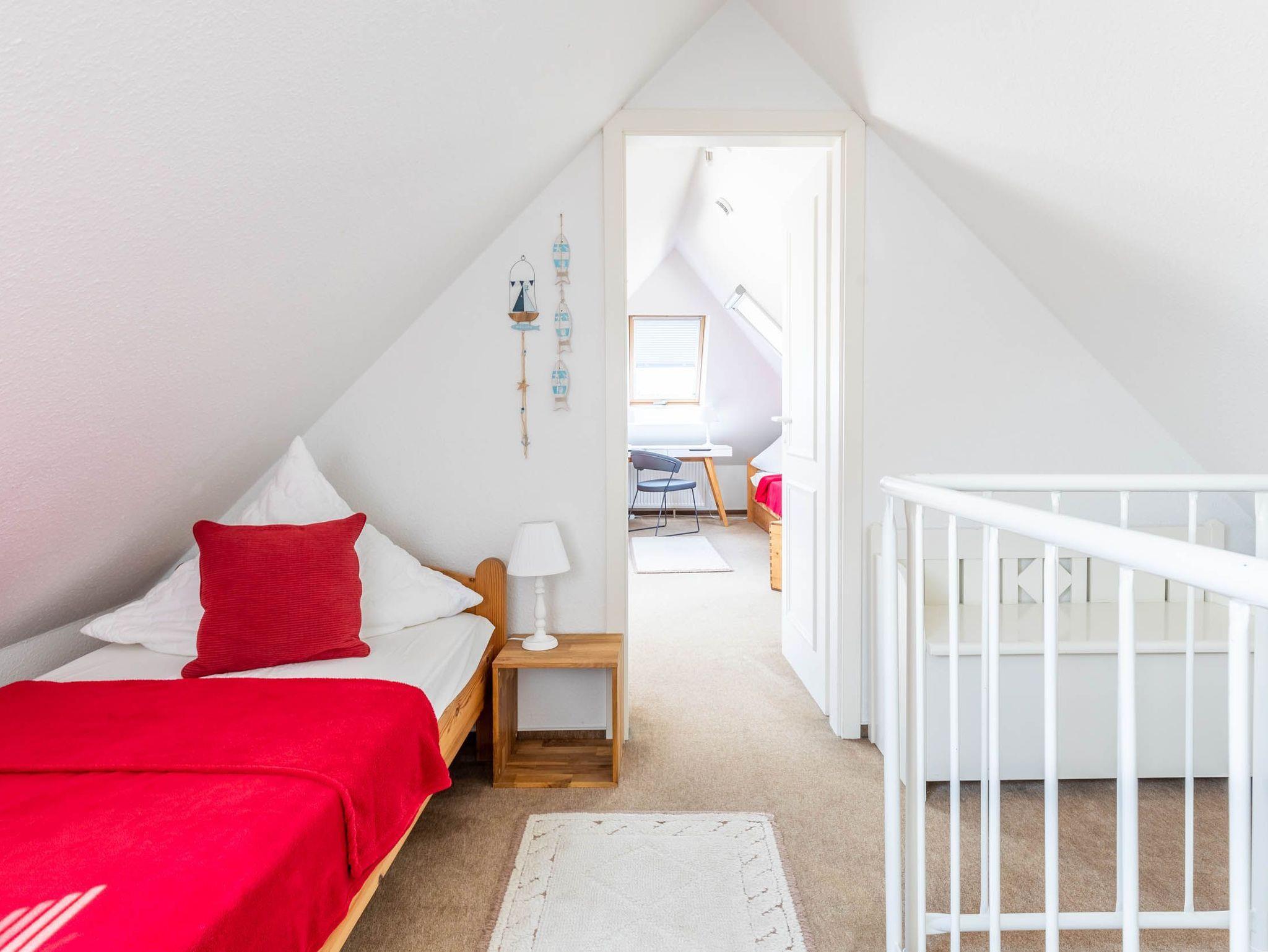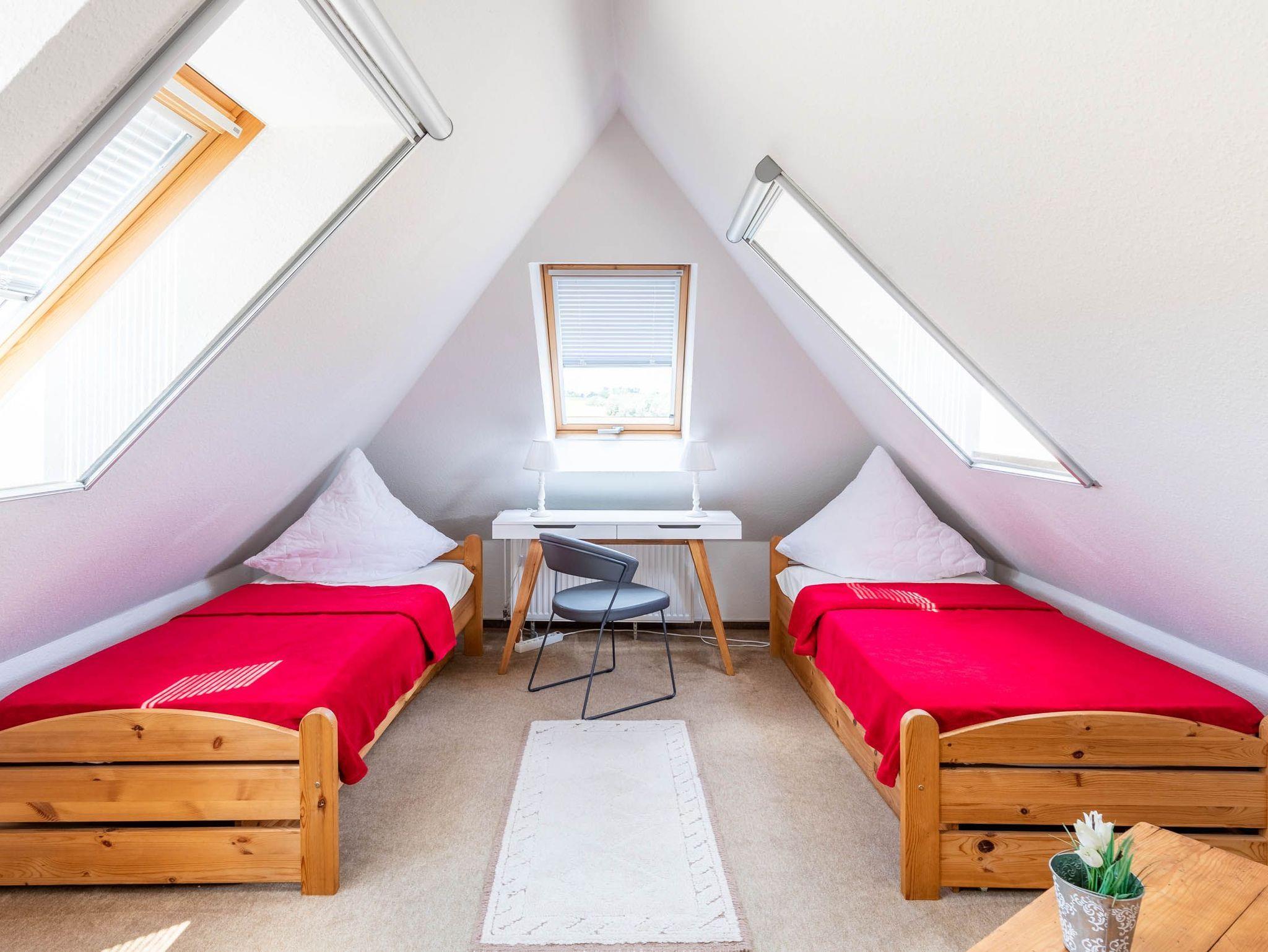 In der zweiten Wohnebene, im Dachgeschoss befindet sich das Kinder-/ Gästezimmer mit 3 Einzelbetten. Das Zimmer ist ebenfalls mit einem Fernseher ausgestattet, der mit dem Streamingdienst Waipu ergänzt wurde.