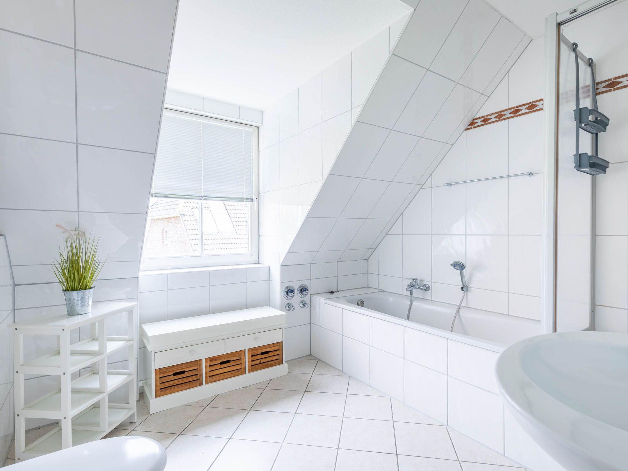 Das hellgeflieste Bad mit Fenster bietet neben einer Dusche und einem WC auch eine Badewanne zum Entspannen.