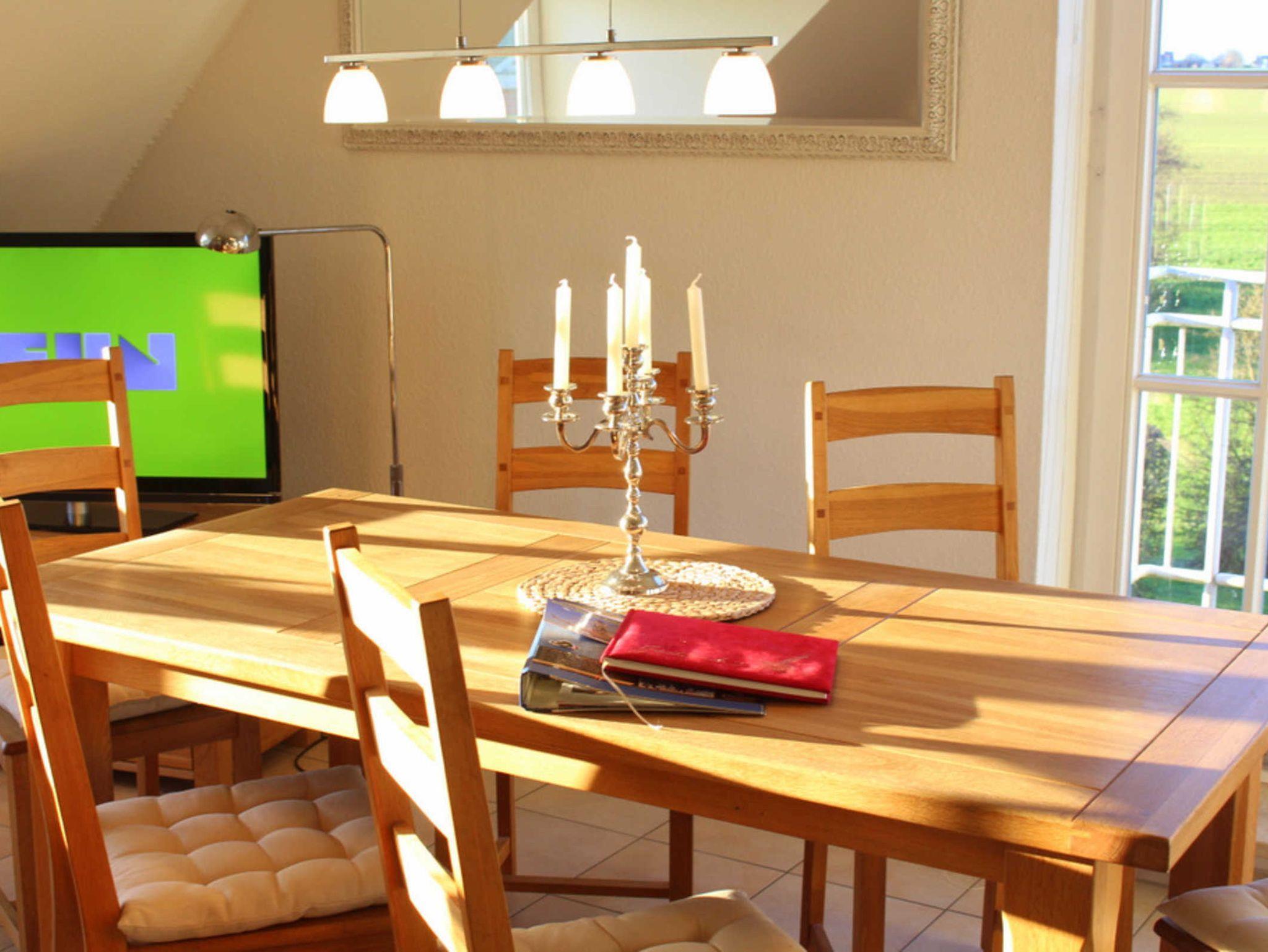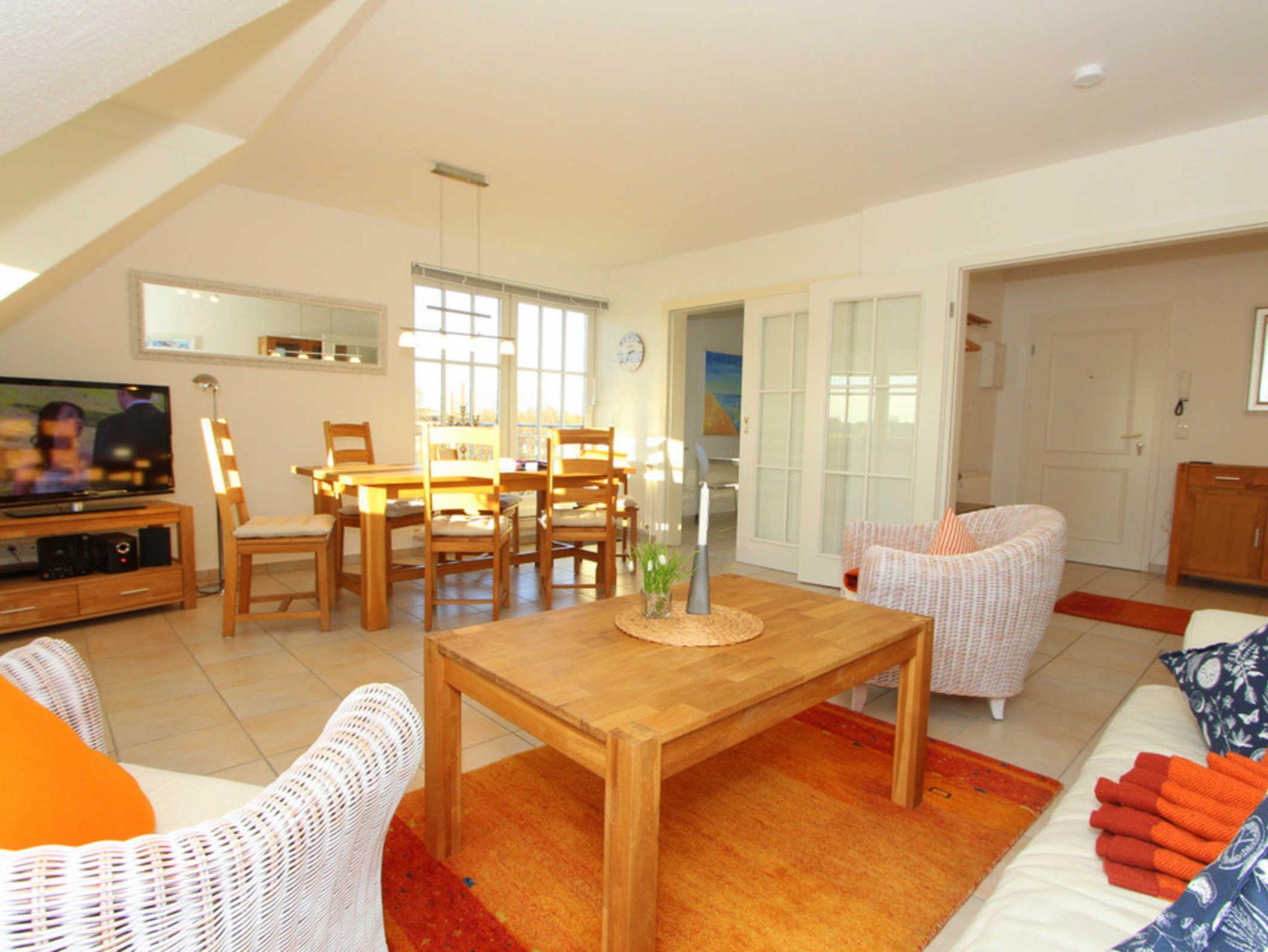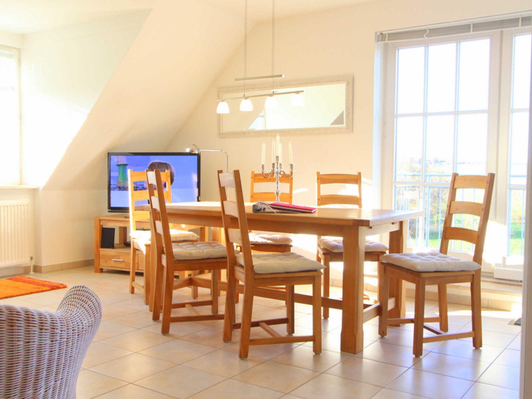 In der ersten Wohnebene befindet sich ein großer Wohnbereich mit einer Schlafcouch für 2 Personen und Flatscreen-TV. Hier kann - neben dem Satellitenfernsehen - das TV-Programm alternativ auch über den Streamingdienst Waipu gestreamt werden. An der Essecke finden alle Gäste Platz, um z.B. die Mahlzeiten einnehmen zu können.