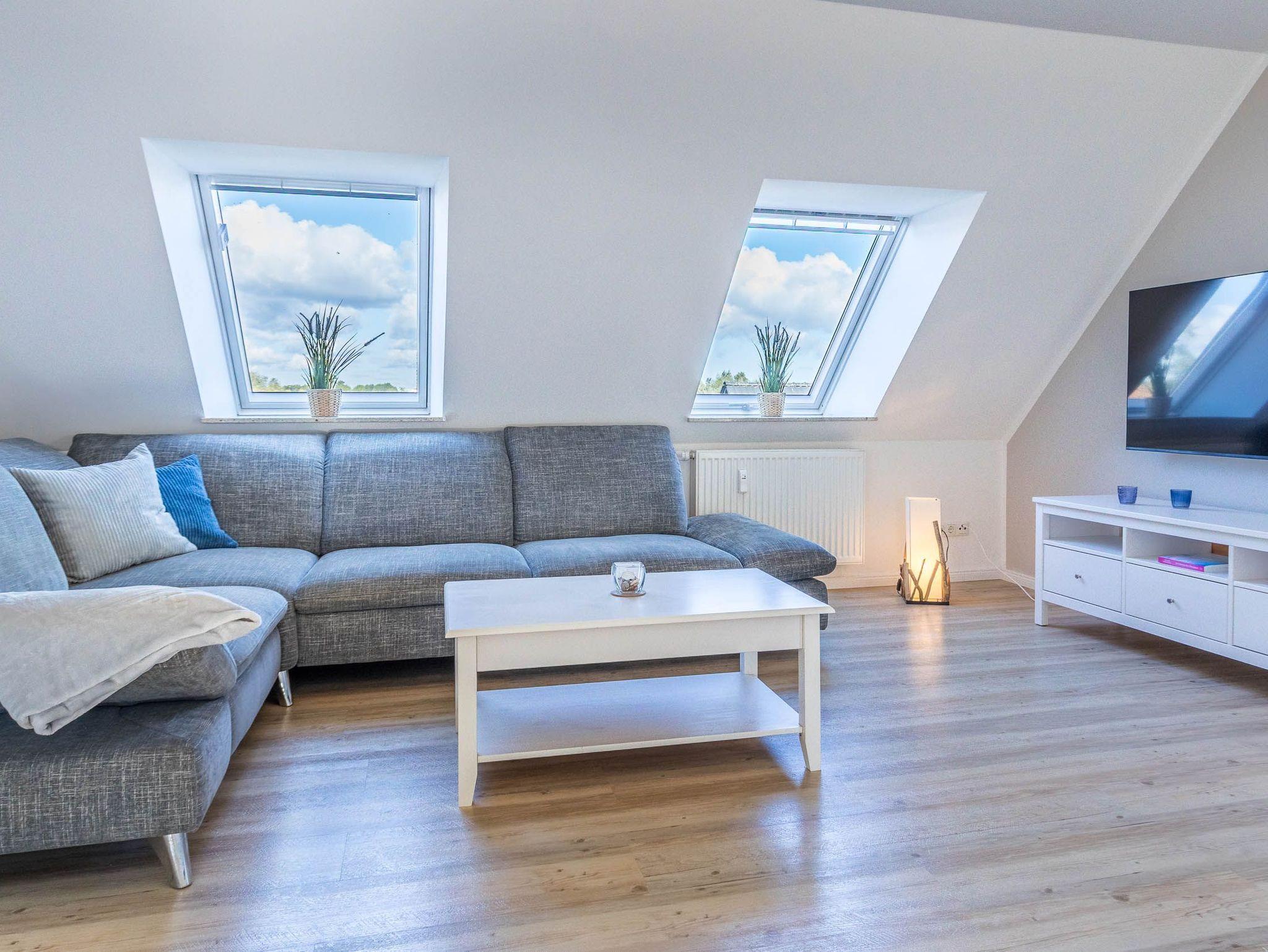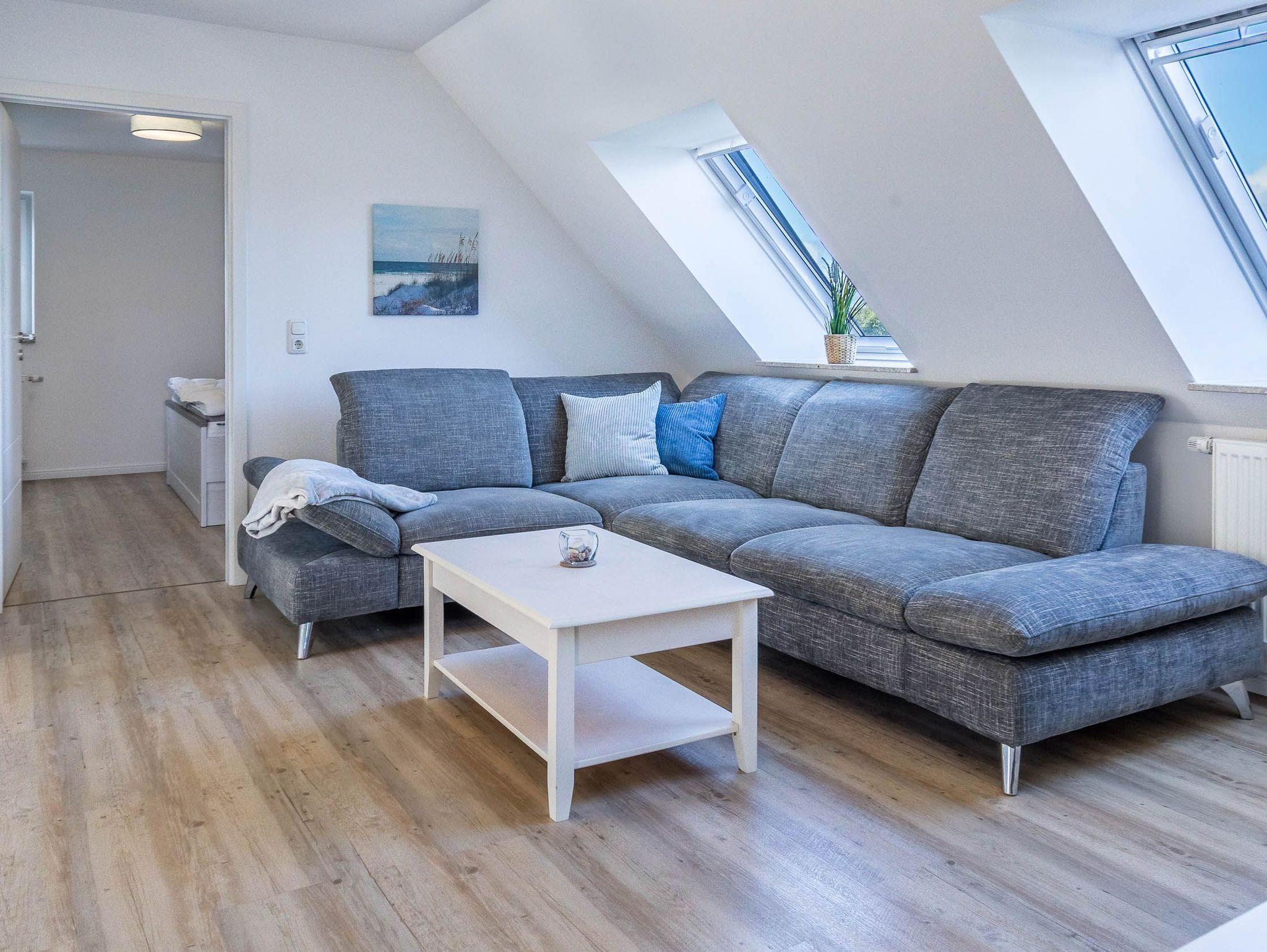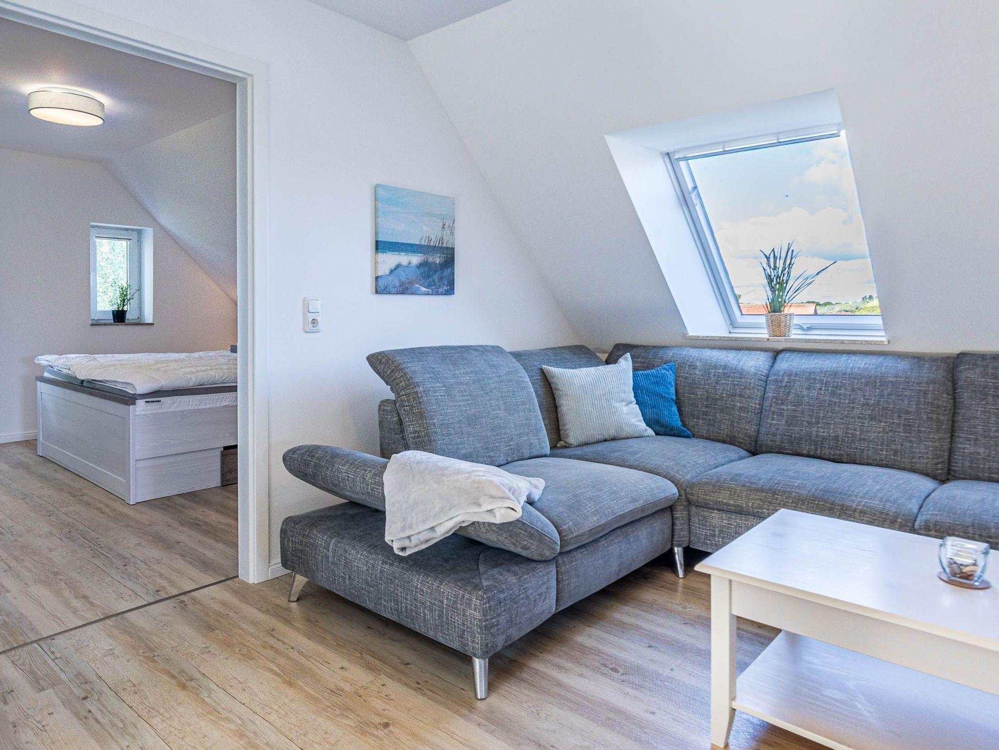 Der Wohnbereich lädt mit einer bequemen Polsterecke zu entspannten Stunden beim Plaudern oder Fernsehen ein. Für Ihre Unterhaltung steht ein großer TV bereit.