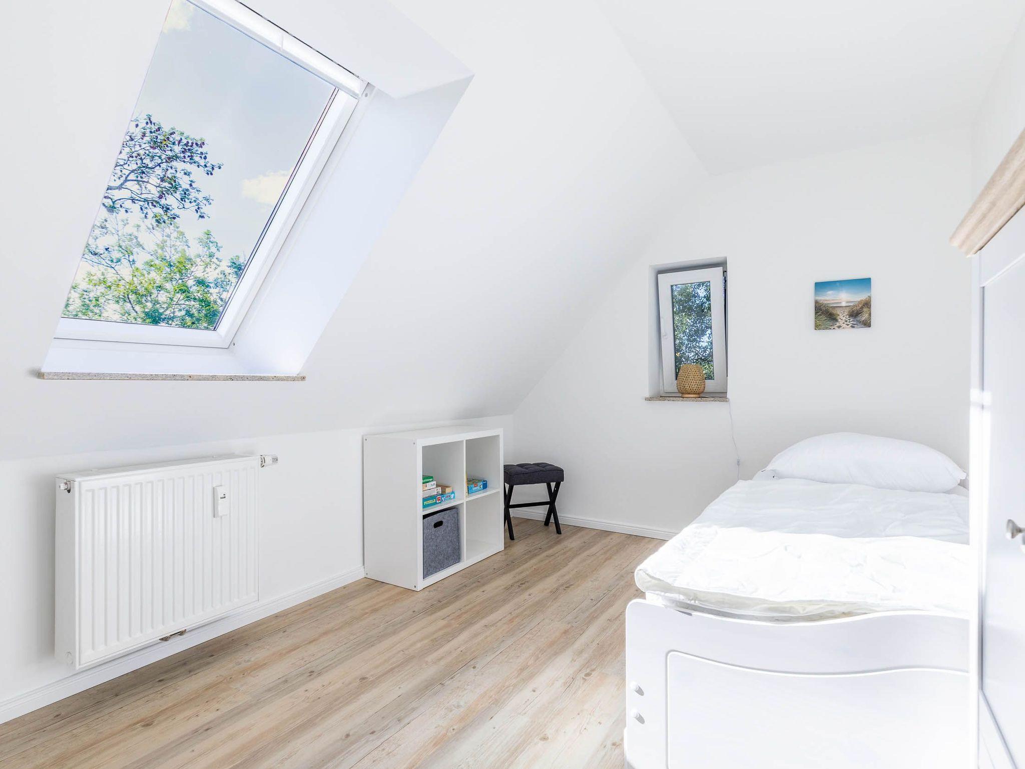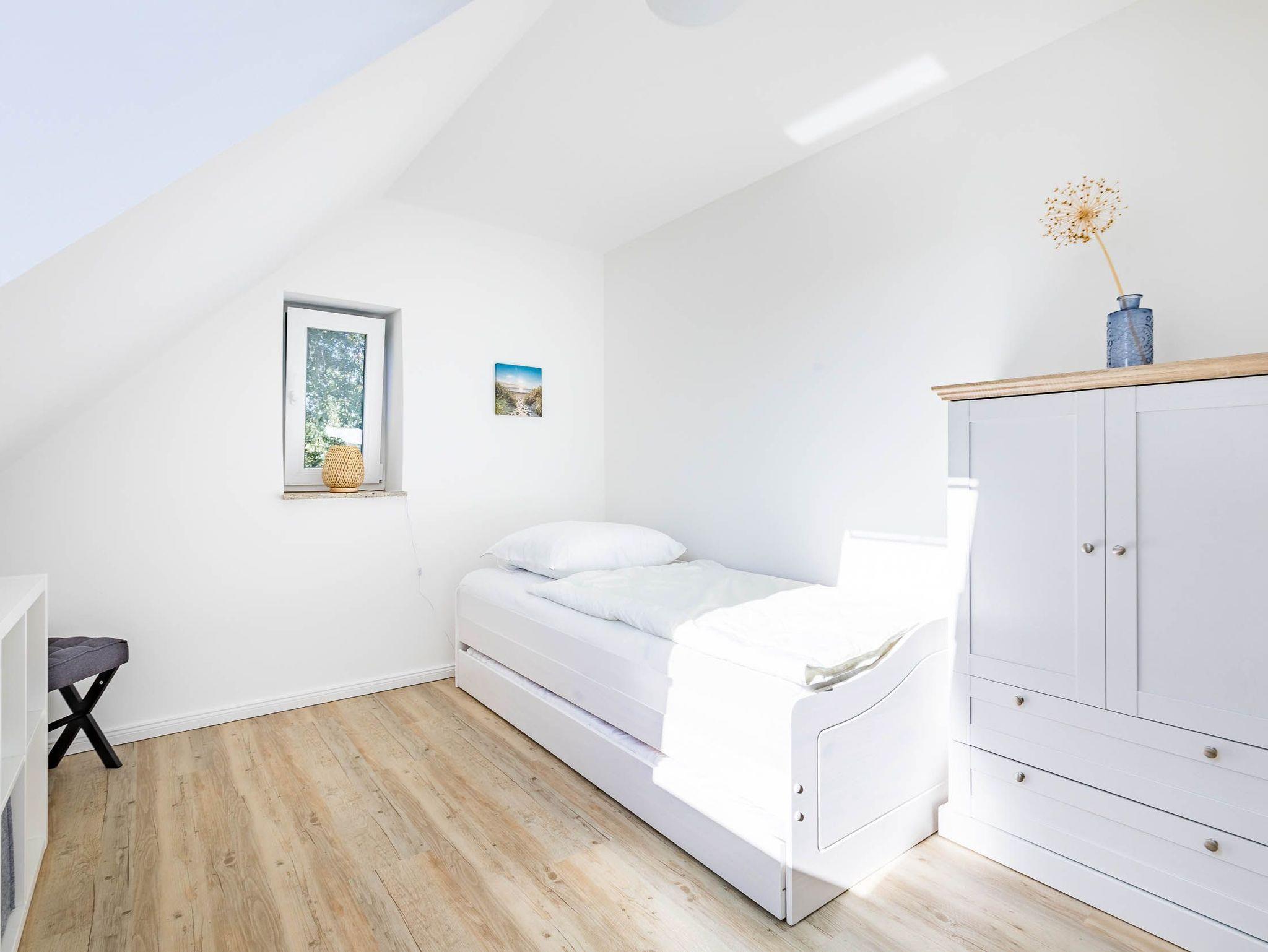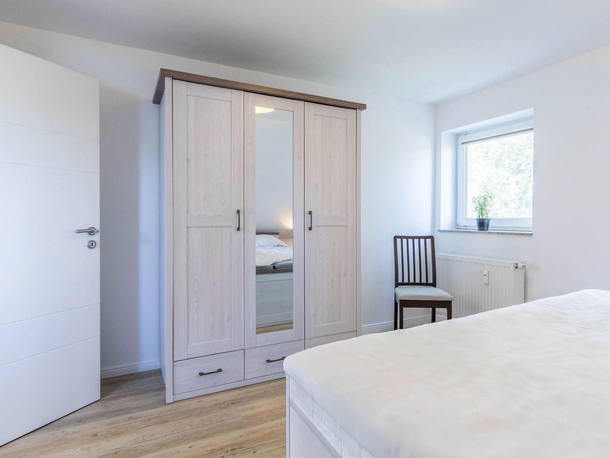 Das Schlafzimmer ist mit einem Doppelbett (180x200cm) und einem Kleiderschrank eingerichtet. Zwei weitere Personen können im Kinderzimmer im ausziehbaren Bett übernachten (zwei einzelne Matratzen jeweils 90x200).