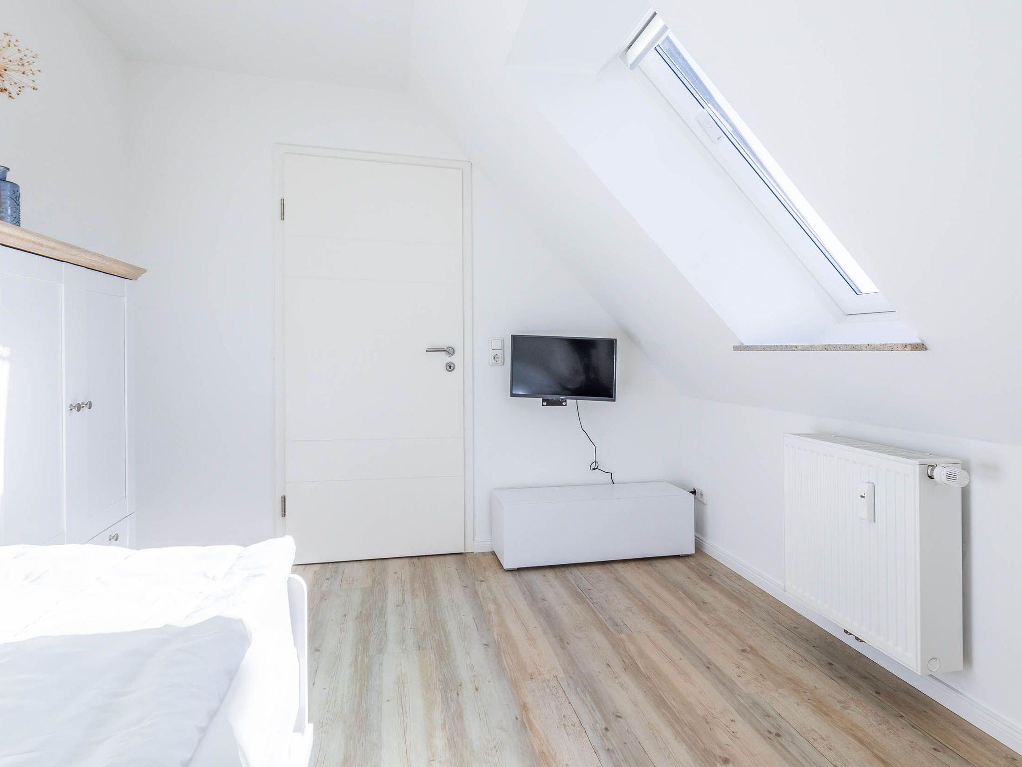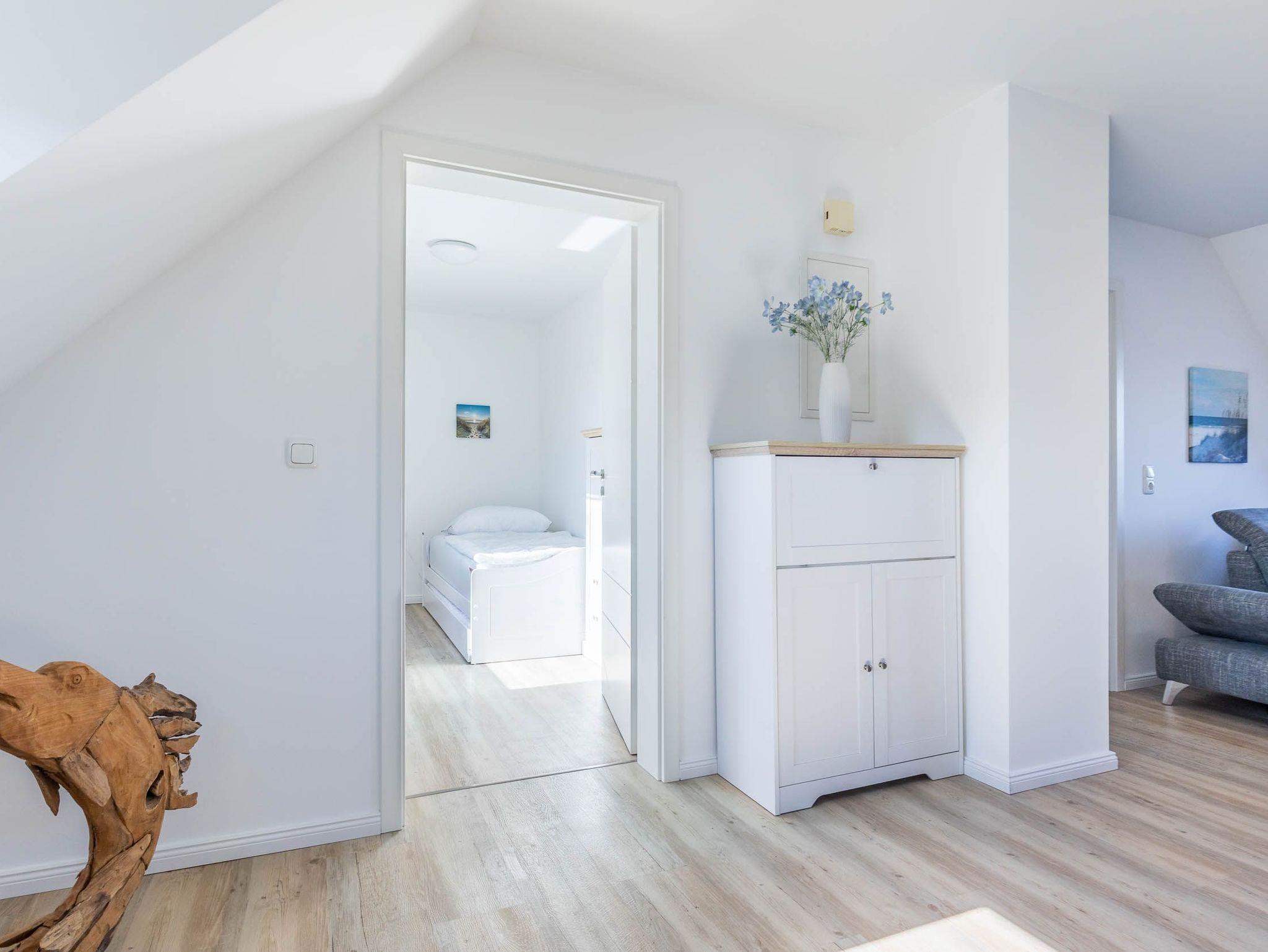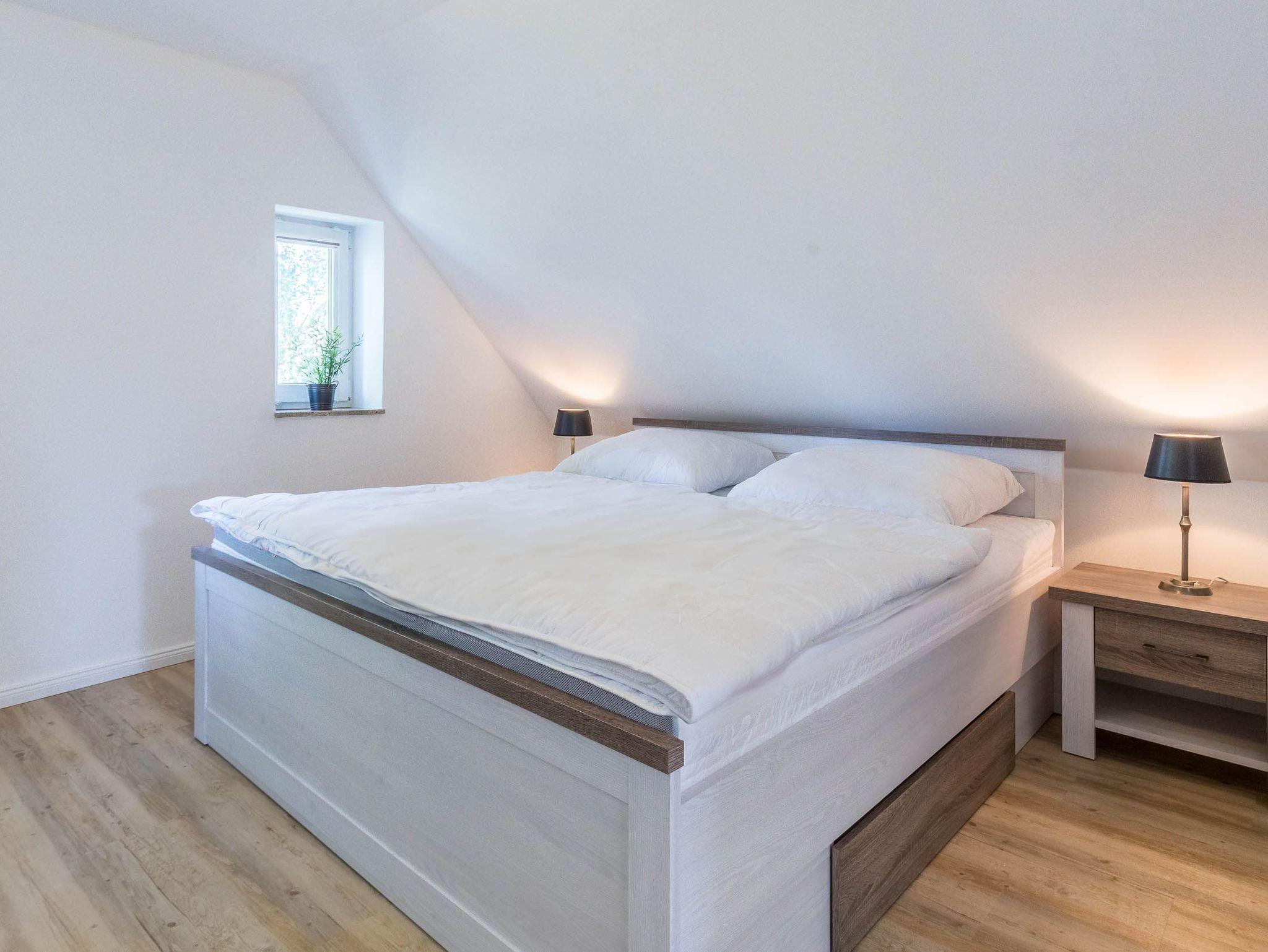 Das Schlafzimmer ist mit einem Doppelbett (180x200cm) und einem Kleiderschrank eingerichtet. Zwei weitere Personen können im Kinderzimmer im ausziehbaren Bett übernachten (zwei einzelne Matratzen jeweils 90x200).
