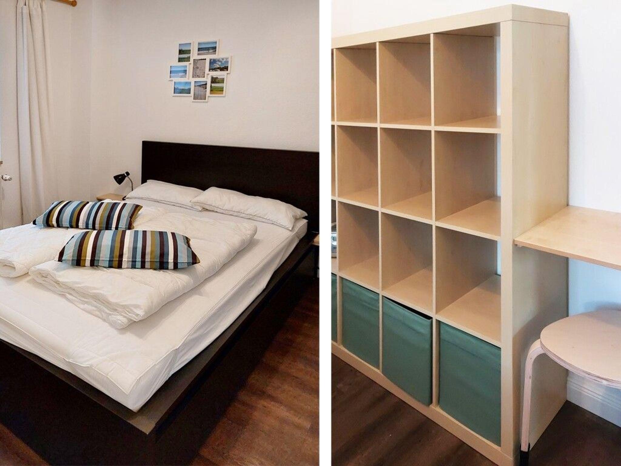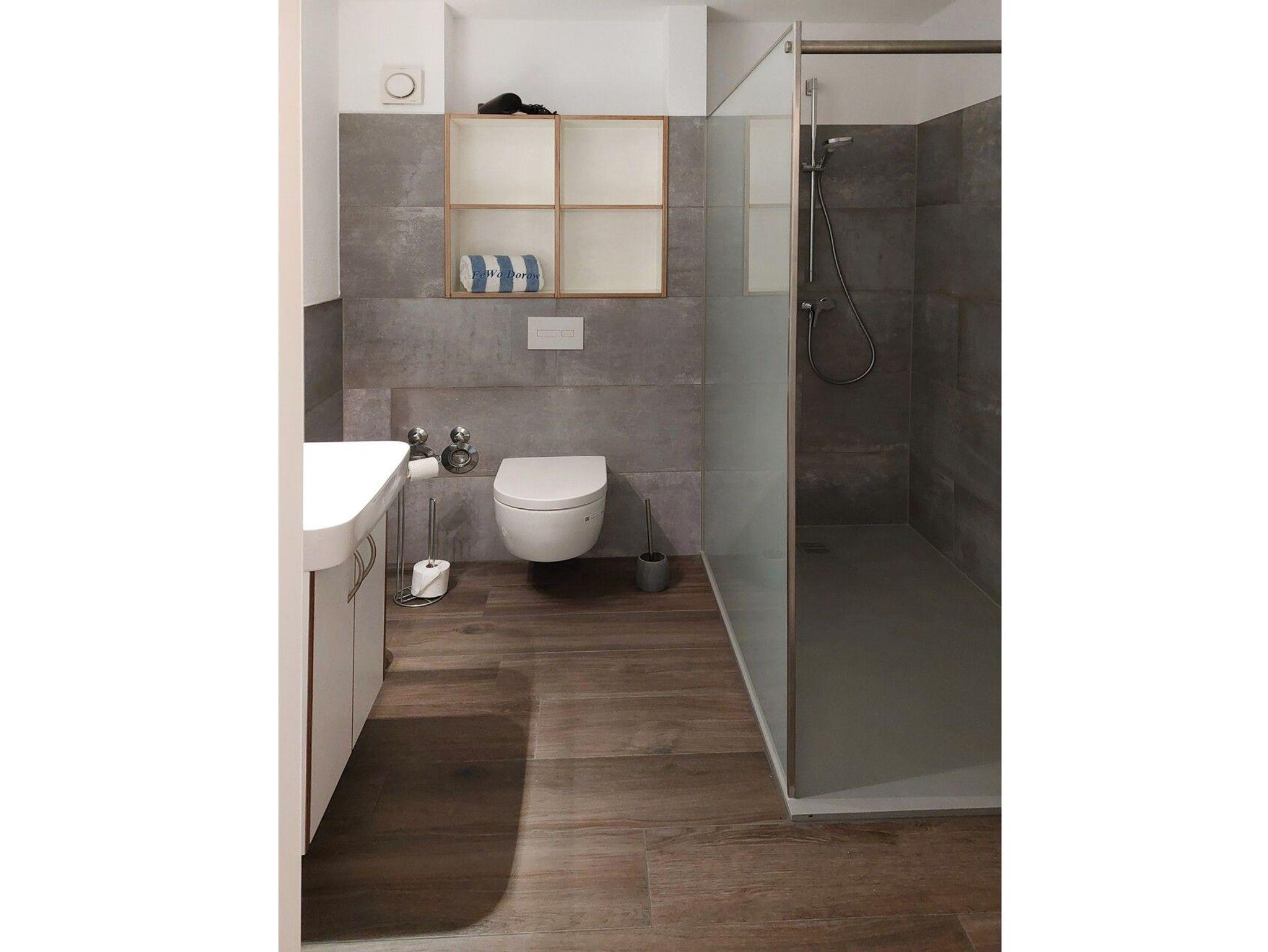 Das Appartement verfügt über zwei separate Schlafzimmer. Eines mit Doppelbett, Kleiderschrank und einem 2. Fernseher. Das weitere Schlafzimmer mit Doppelbett 1,40m x 2,00m, Regalen, Sitzgelegenheit. Das innenliegende Badezimmer besitzt eine bodentiefe Dusche, Waschtisch, Fön und WC.