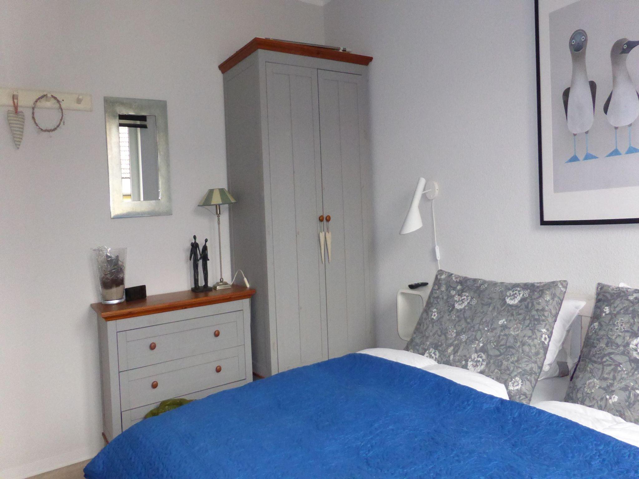 Das Schlafzimmer hat ein Doppelbett und einen Flachbild-Fernseher.