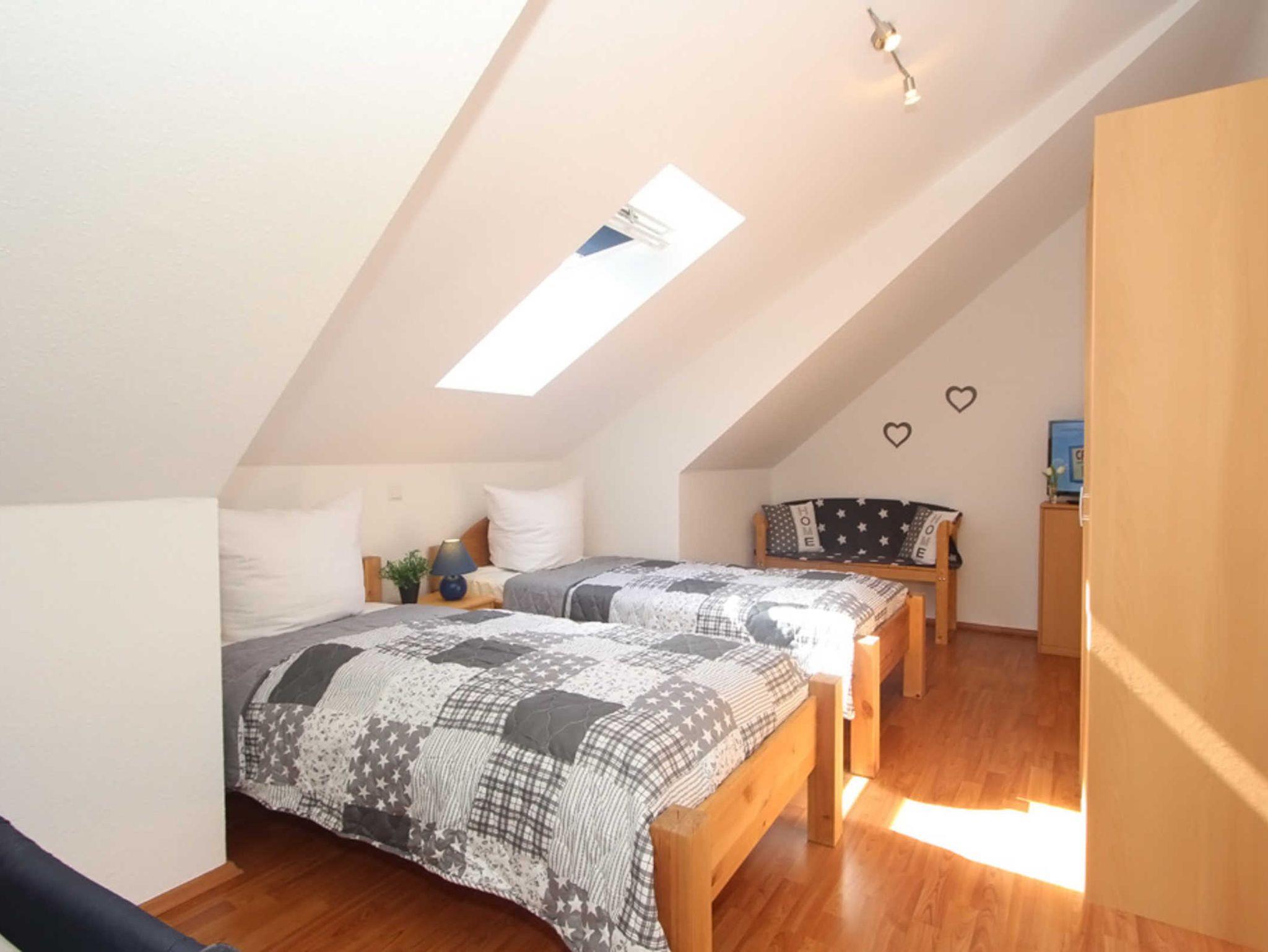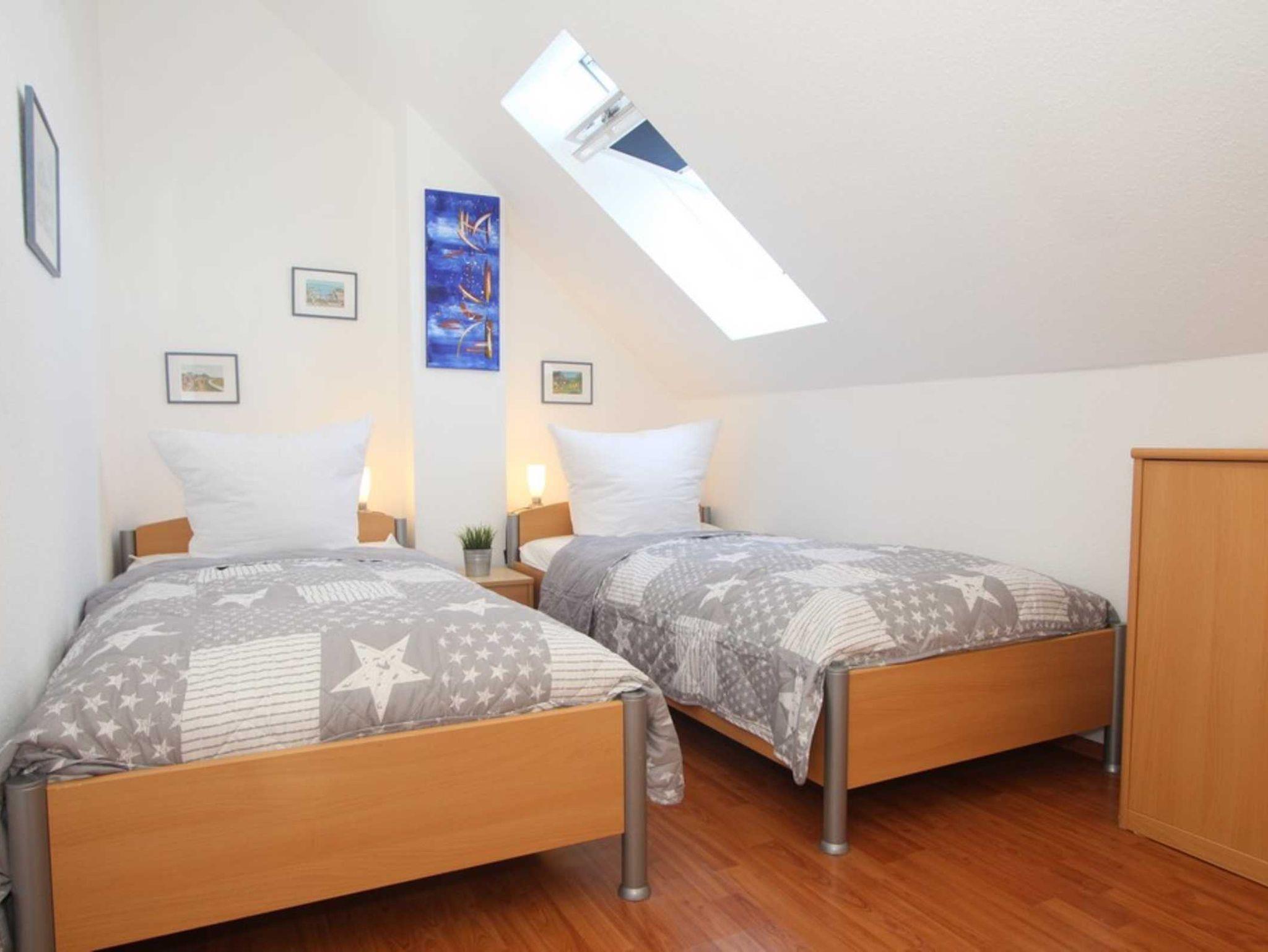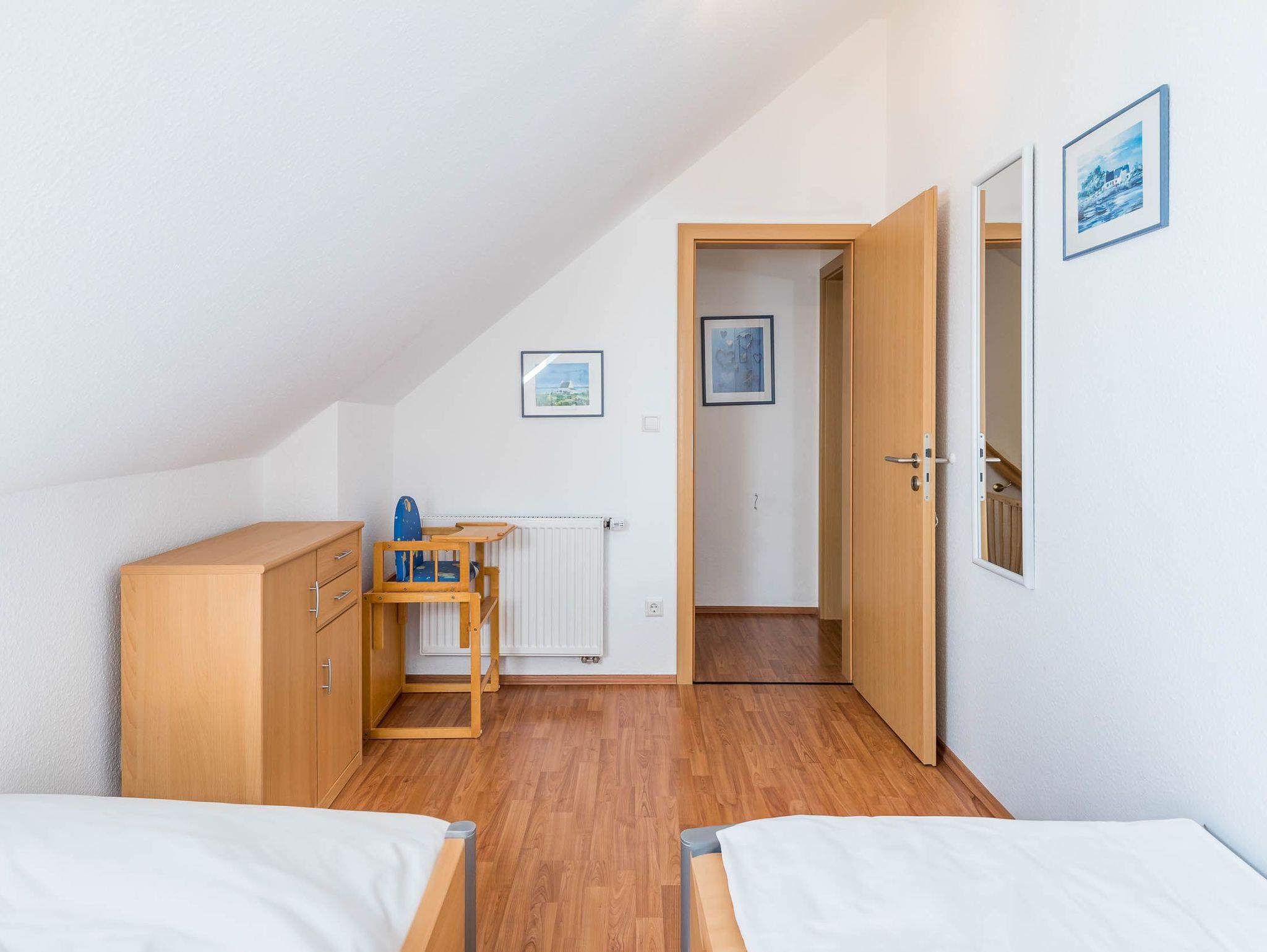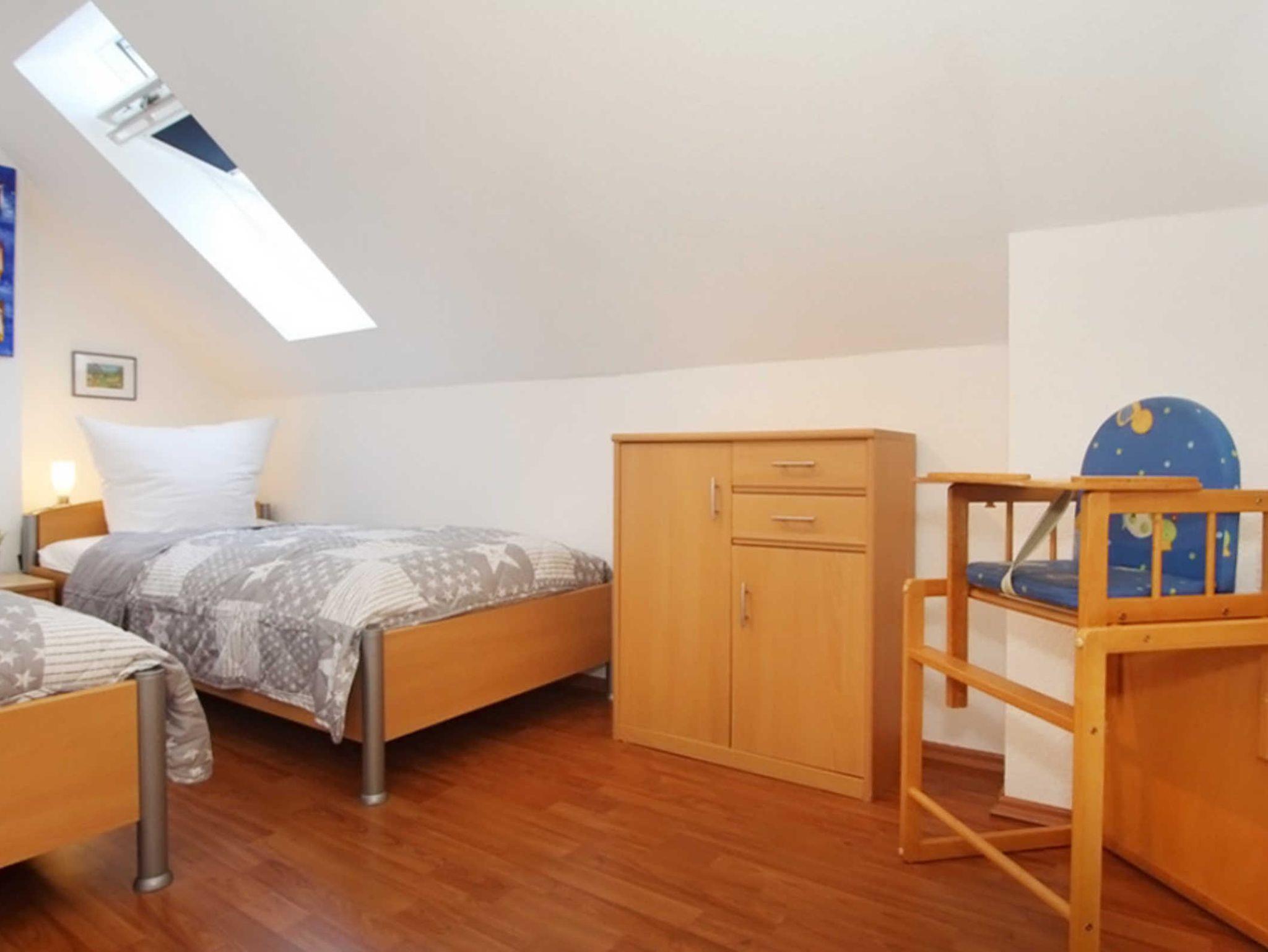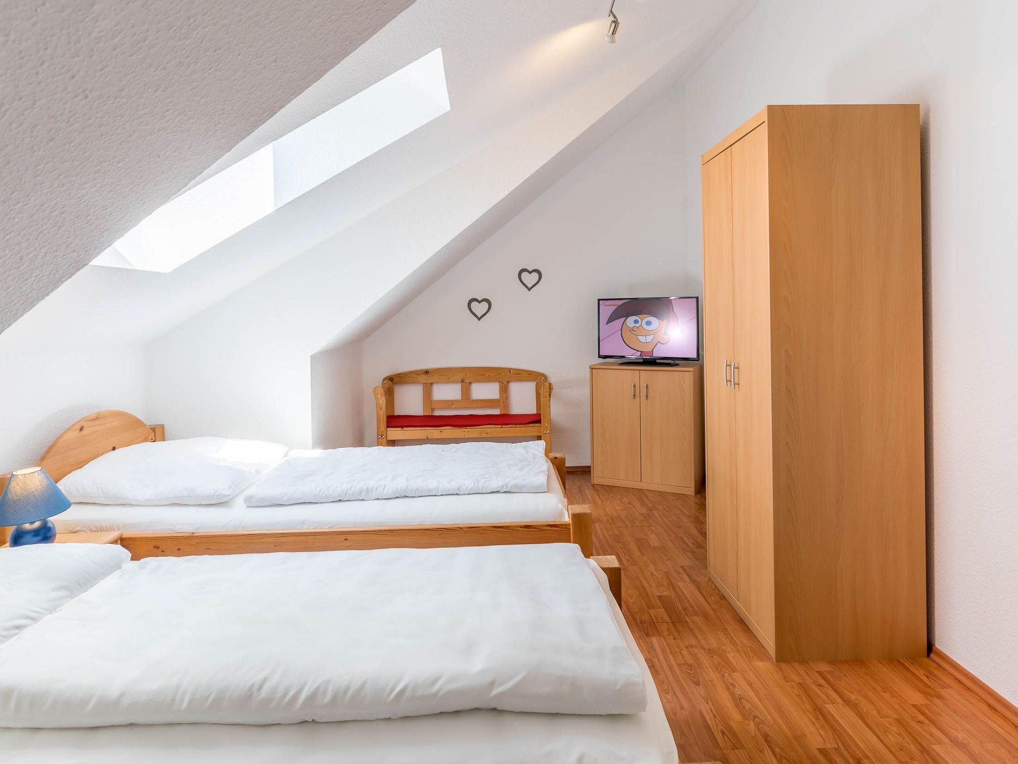 Diese Ferienwohnung verfügt über 3 Schlafzimmer. Während sich das Schlafzimmer mit dem Doppelbett und einem Kleiderschrank für Ihre Garderobe ebenfalls auf der ersten Ebene befindet, erwarten Sie im Dachgeschoss, der 2. Wohnebene die beiden Gäste-/ Kinderzimmer. Hier sind jeweils 2 Einzelbetten eingerichtet. In einem der beiden Zimmer ist zusätzlich ein kleiner Kleiderschrank, eine Kommode und ein weiterer Fernseher vorhanden. Auch für ein Reisebettchen ist hier noch genügend Platz.