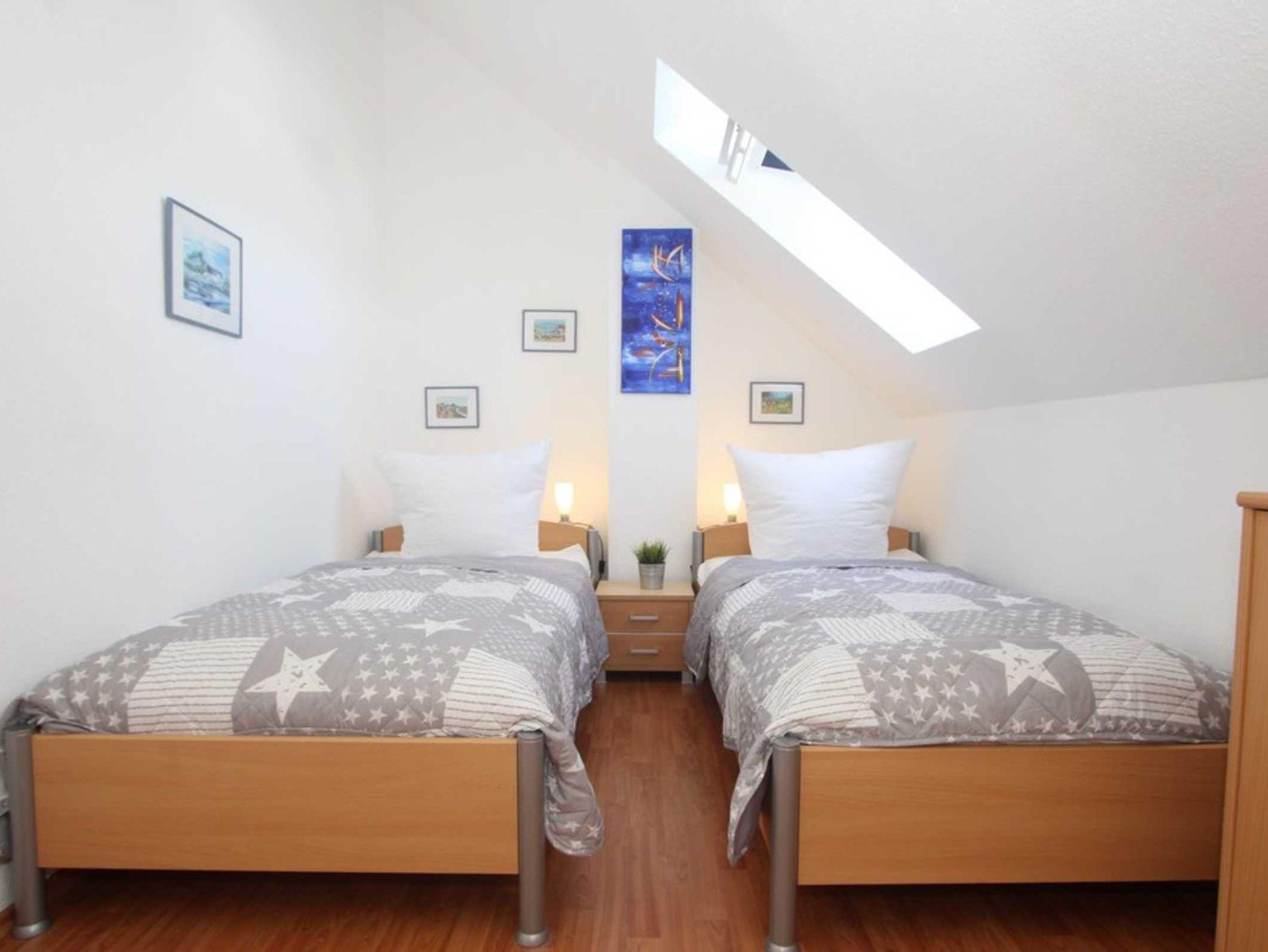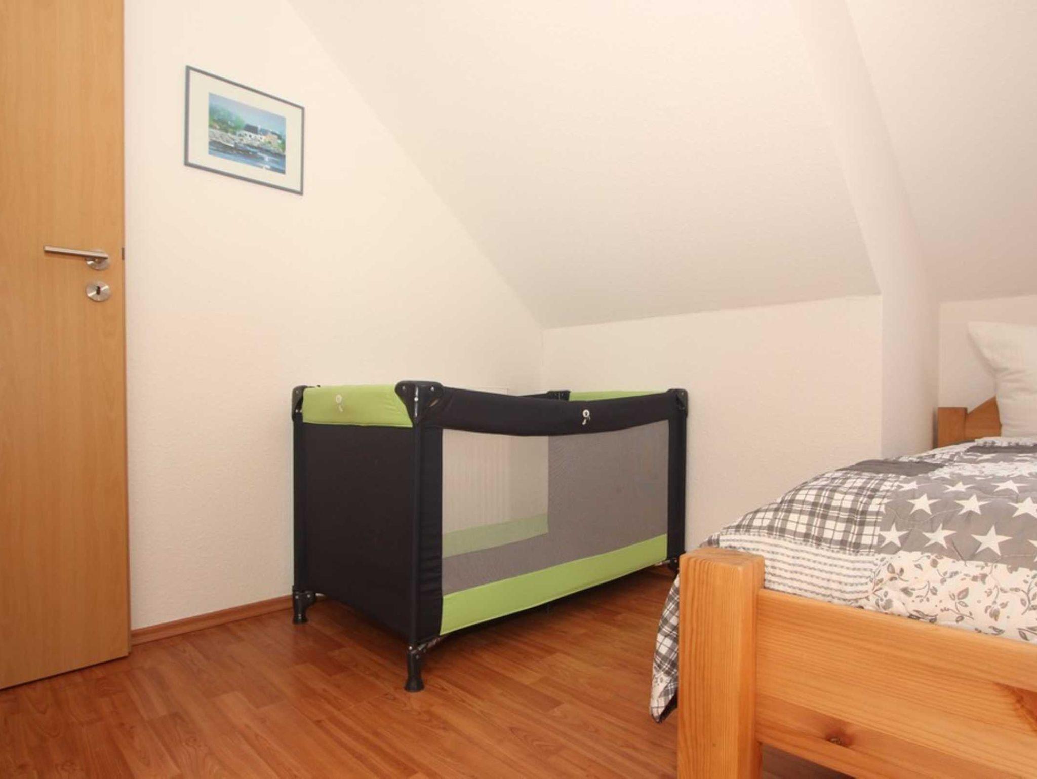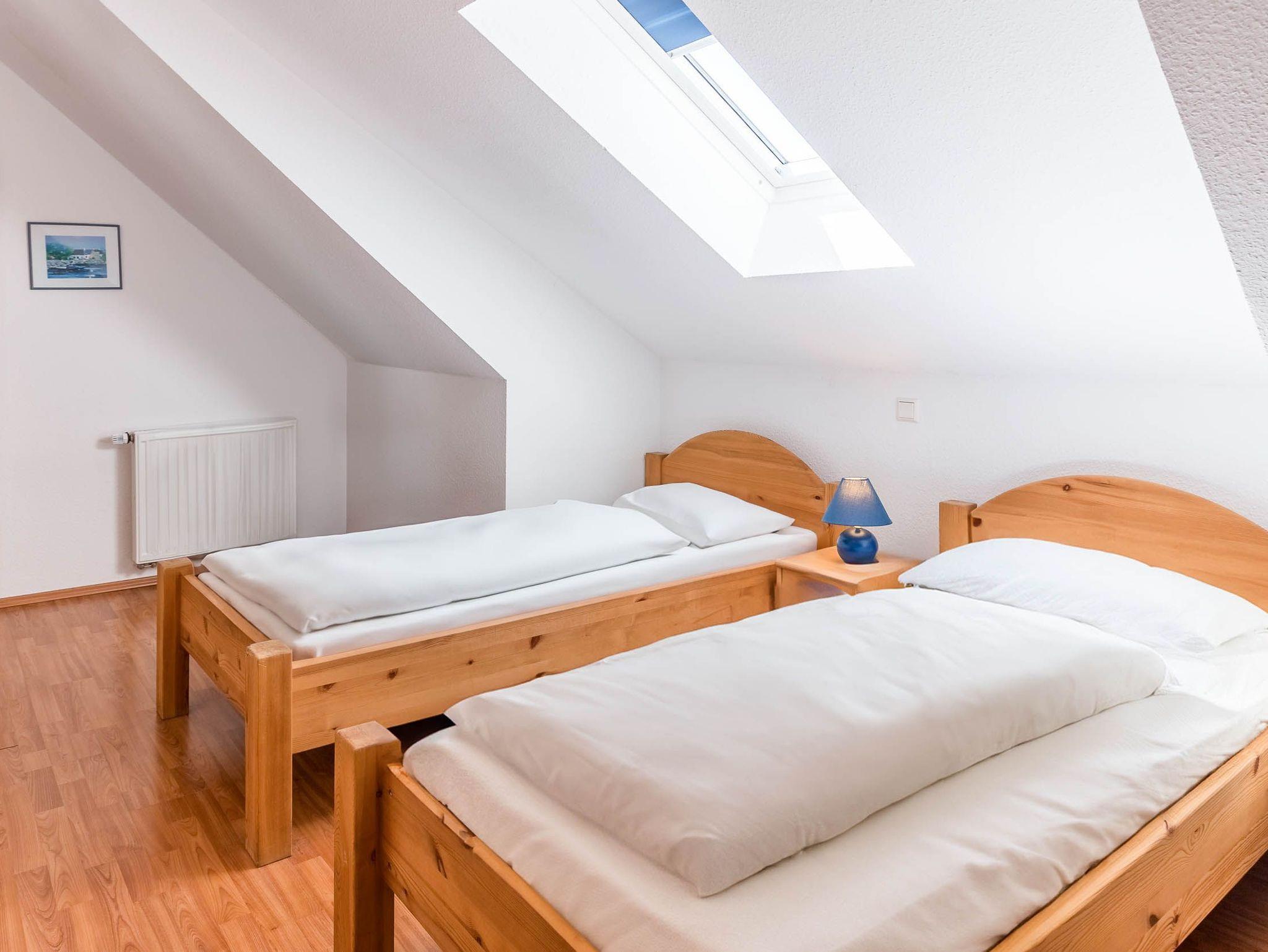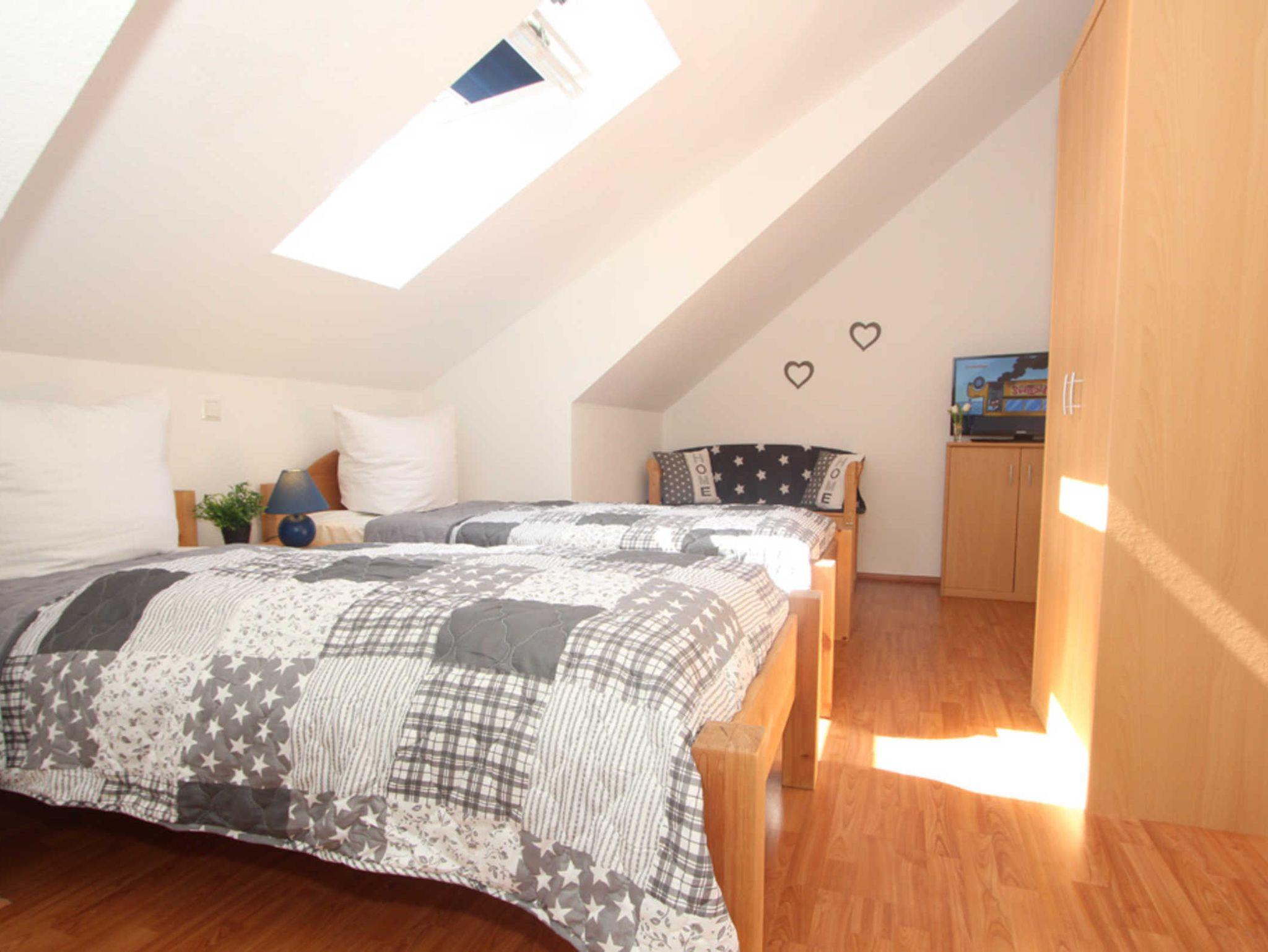 Diese Ferienwohnung verfügt über 3 Schlafzimmer. Während sich das Schlafzimmer mit dem Doppelbett und einem Kleiderschrank für Ihre Garderobe ebenfalls auf der ersten Ebene befindet, erwarten Sie im Dachgeschoss, der 2. Wohnebene die beiden Gäste-/ Kinderzimmer. Hier sind jeweils 2 Einzelbetten eingerichtet. In einem der beiden Zimmer ist zusätzlich ein kleiner Kleiderschrank, eine Kommode und ein weiterer Fernseher vorhanden. Auch für ein Reisebettchen ist hier noch genügend Platz.