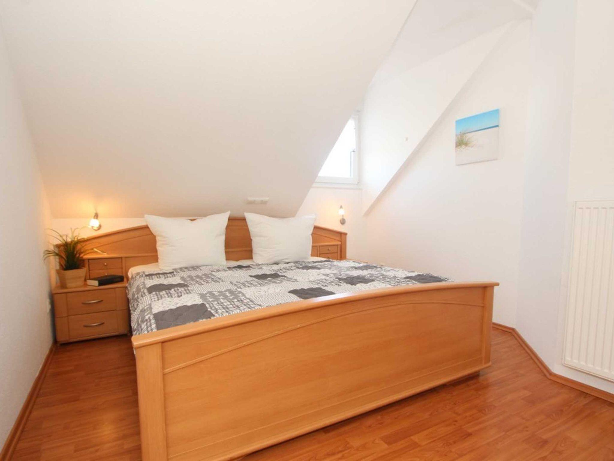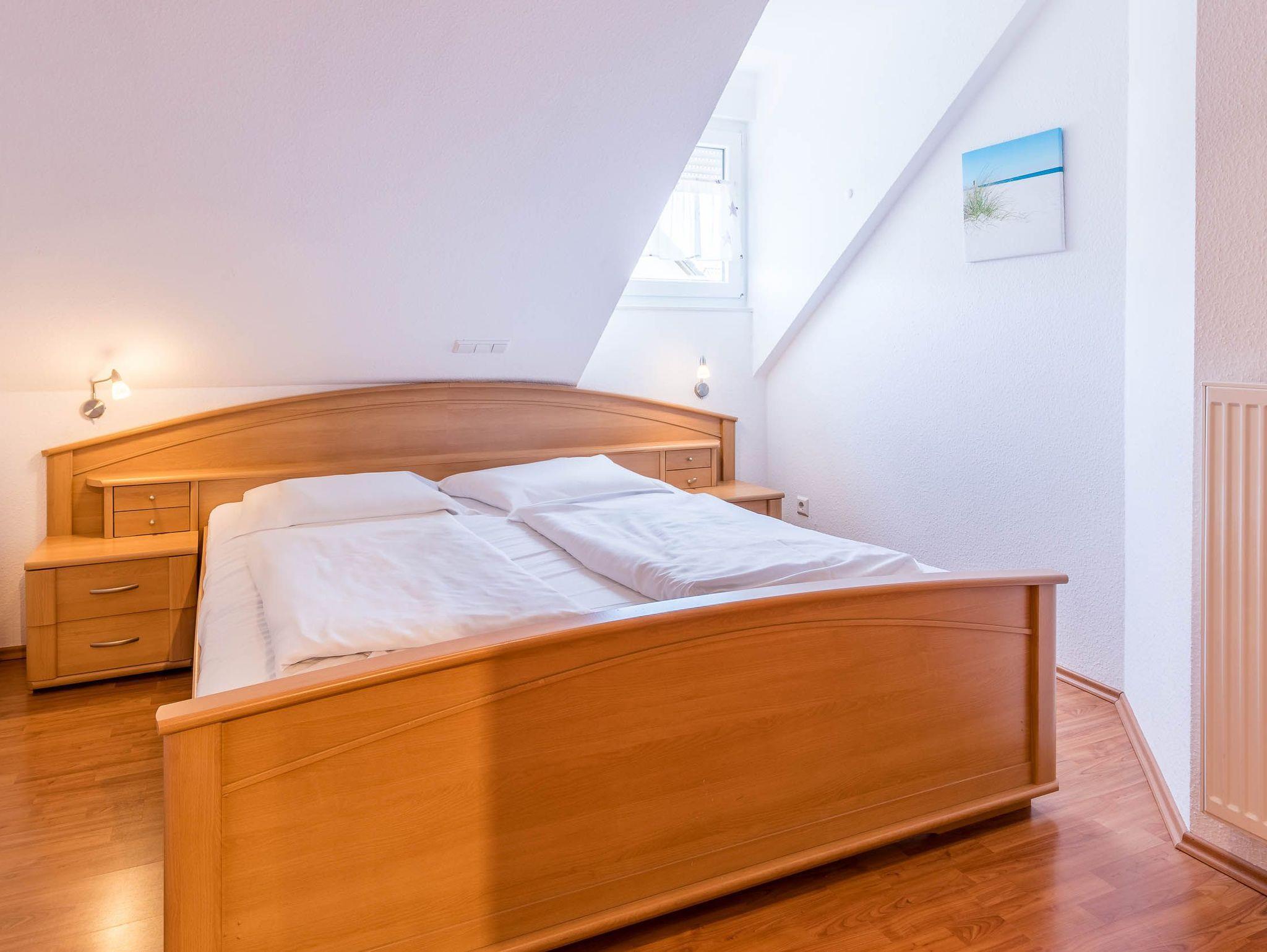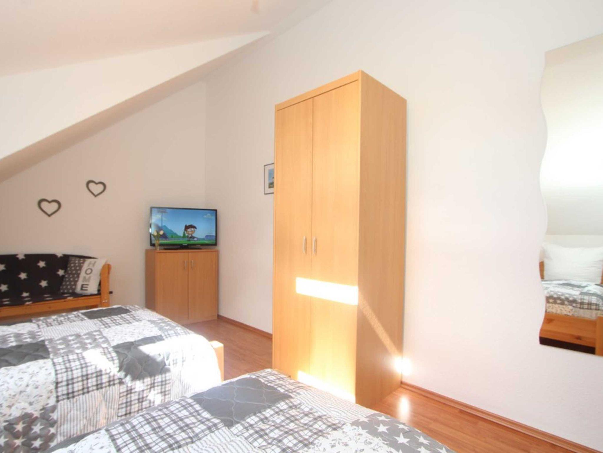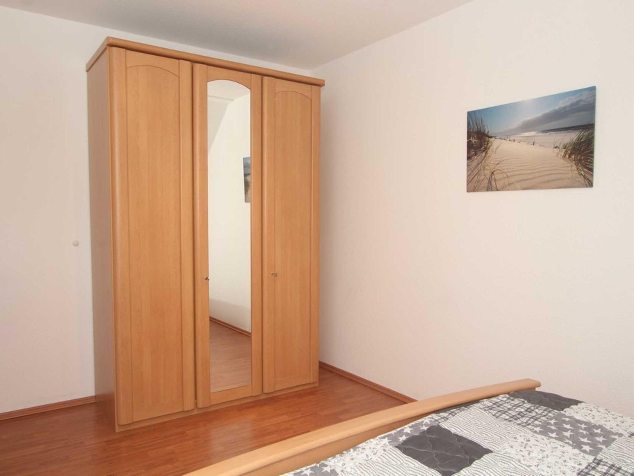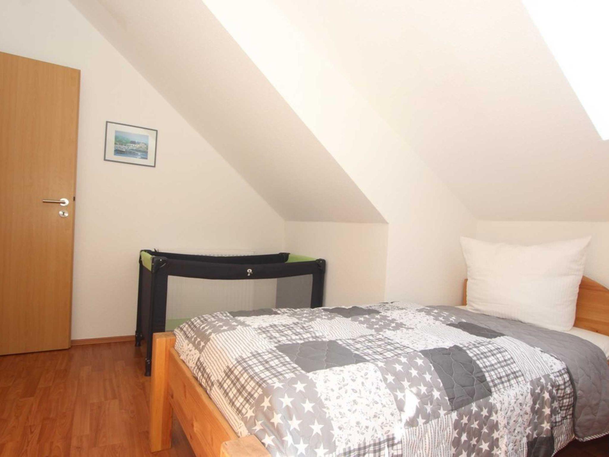Diese Ferienwohnung verfügt über 3 Schlafzimmer. Während sich das Schlafzimmer mit dem Doppelbett und einem Kleiderschrank für Ihre Garderobe ebenfalls auf der ersten Ebene befindet, erwarten Sie im Dachgeschoss, der 2. Wohnebene die beiden Gäste-/ Kinderzimmer. Hier sind jeweils 2 Einzelbetten eingerichtet. In einem der beiden Zimmer ist zusätzlich ein kleiner Kleiderschrank, eine Kommode und ein weiterer Fernseher vorhanden. Auch für ein Reisebettchen ist hier noch genügend Platz.