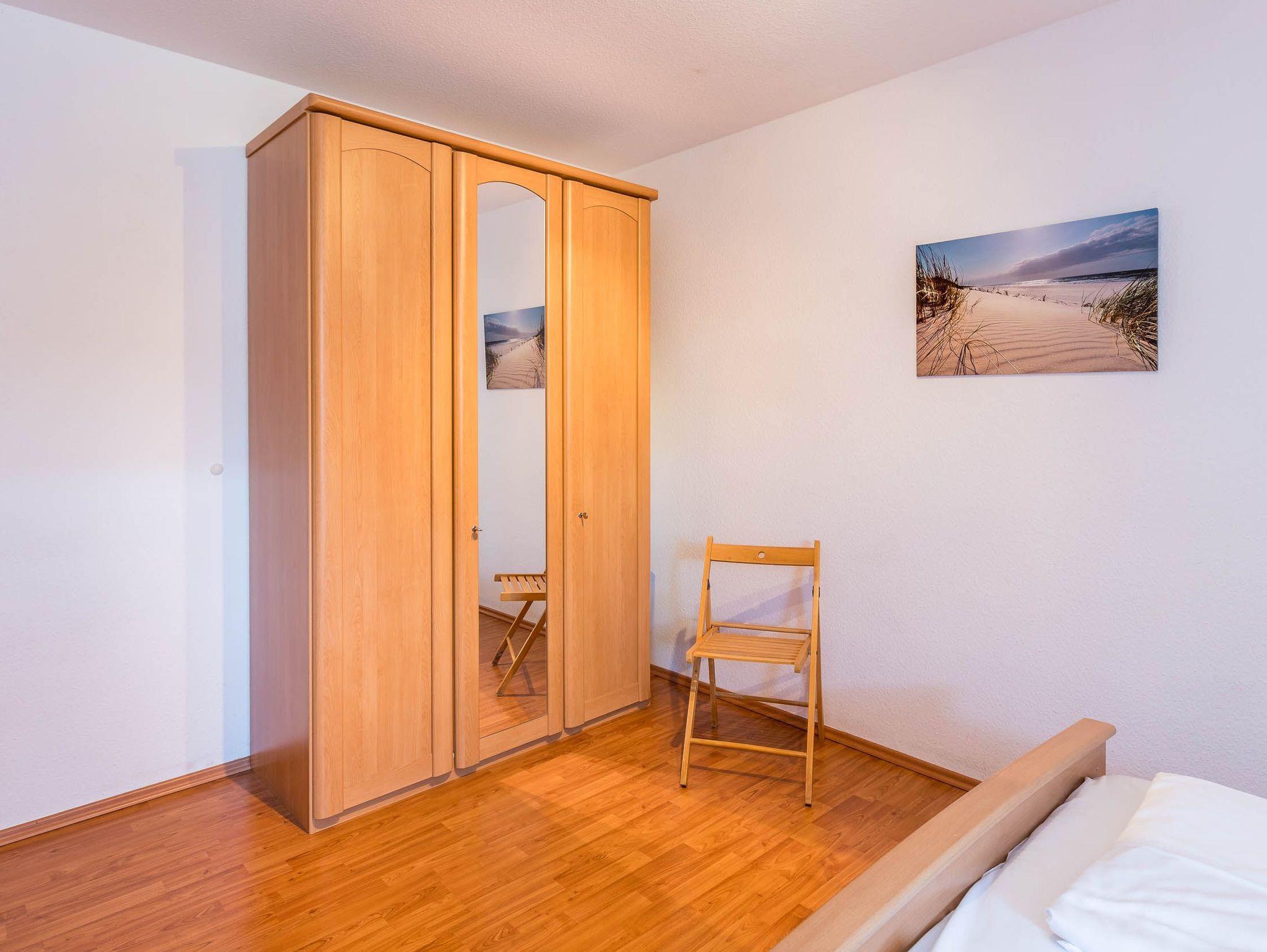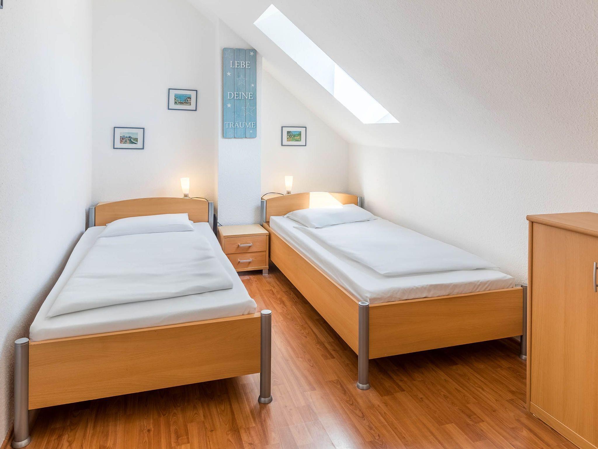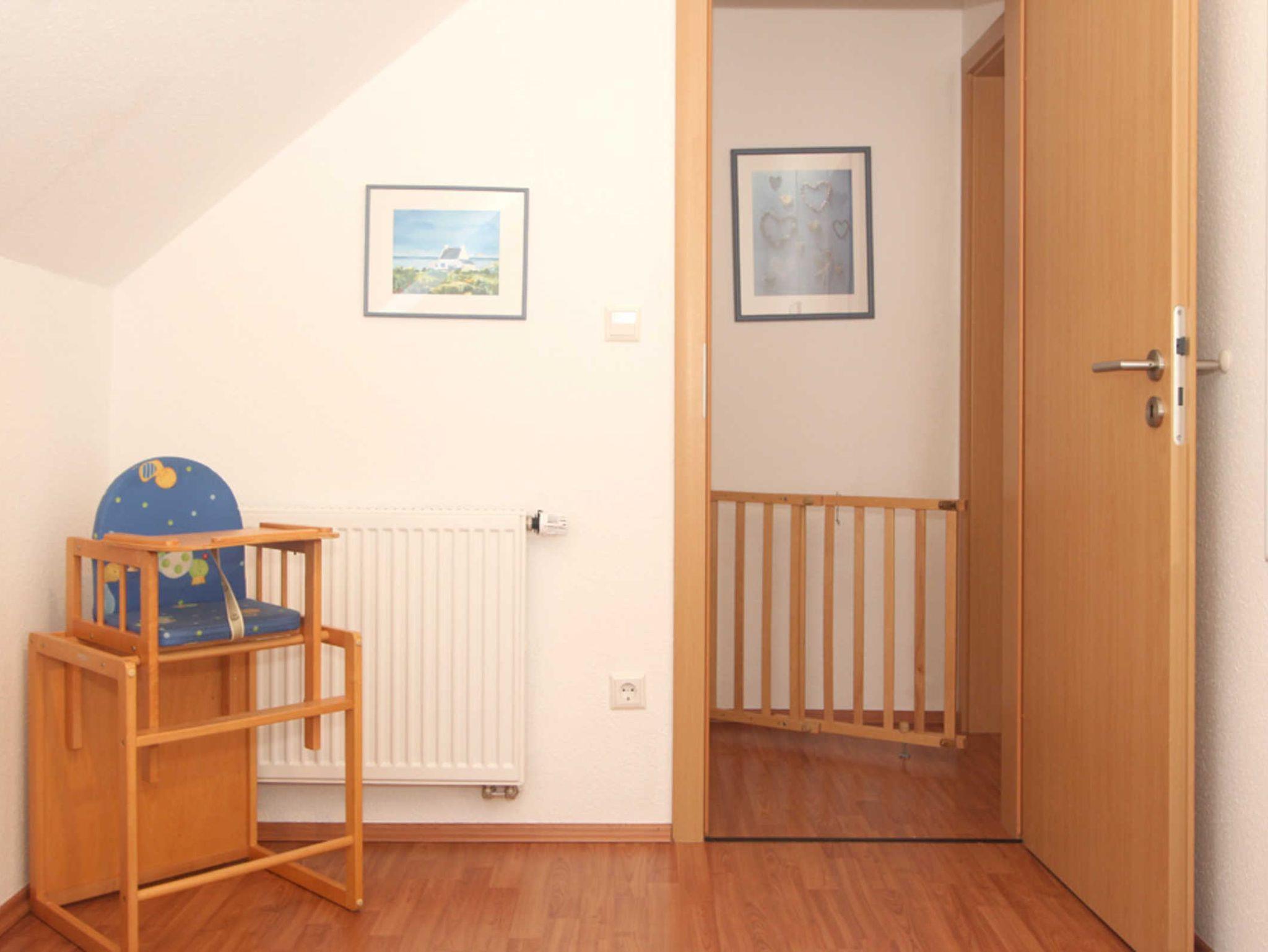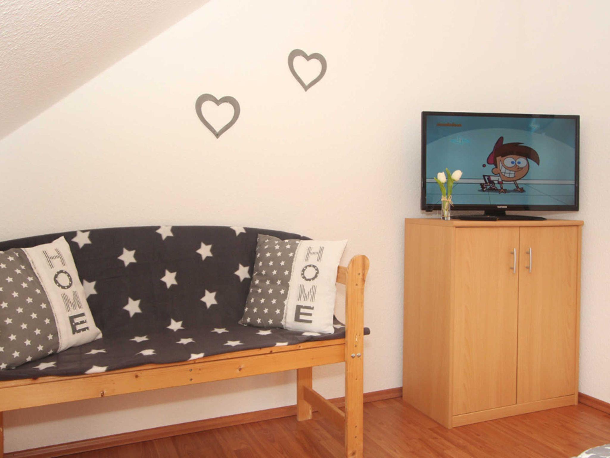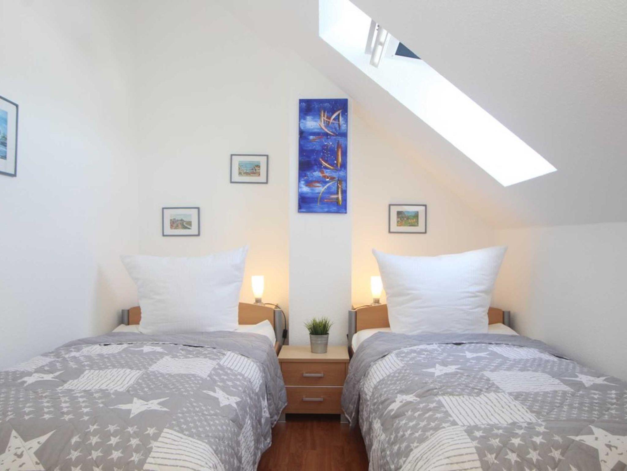 Diese Ferienwohnung verfügt über 3 Schlafzimmer. Während sich das Schlafzimmer mit dem Doppelbett und einem Kleiderschrank für Ihre Garderobe ebenfalls auf der ersten Ebene befindet, erwarten Sie im Dachgeschoss, der 2. Wohnebene die beiden Gäste-/ Kinderzimmer. Hier sind jeweils 2 Einzelbetten eingerichtet. In einem der beiden Zimmer ist zusätzlich ein kleiner Kleiderschrank, eine Kommode und ein weiterer Fernseher vorhanden. Auch für ein Reisebettchen ist hier noch genügend Platz.
