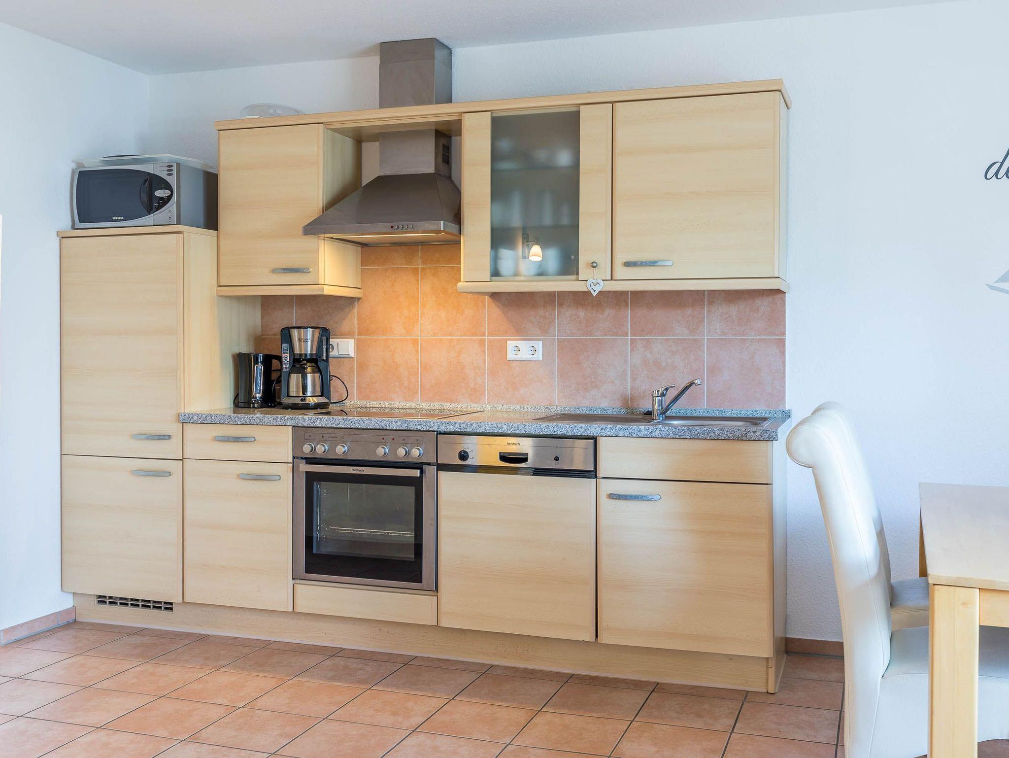 In der offenen Küche finden Sie u.a. Ceranfeld/ Backofen, Kaffeemaschine, Toaster, Geschirrspüler, Mikrowelle und Wasserkocher. Die zubereiteten Mahlzeiten können Sie gemütlich mit allen Personen an der separaten Essecke einnehmen.
