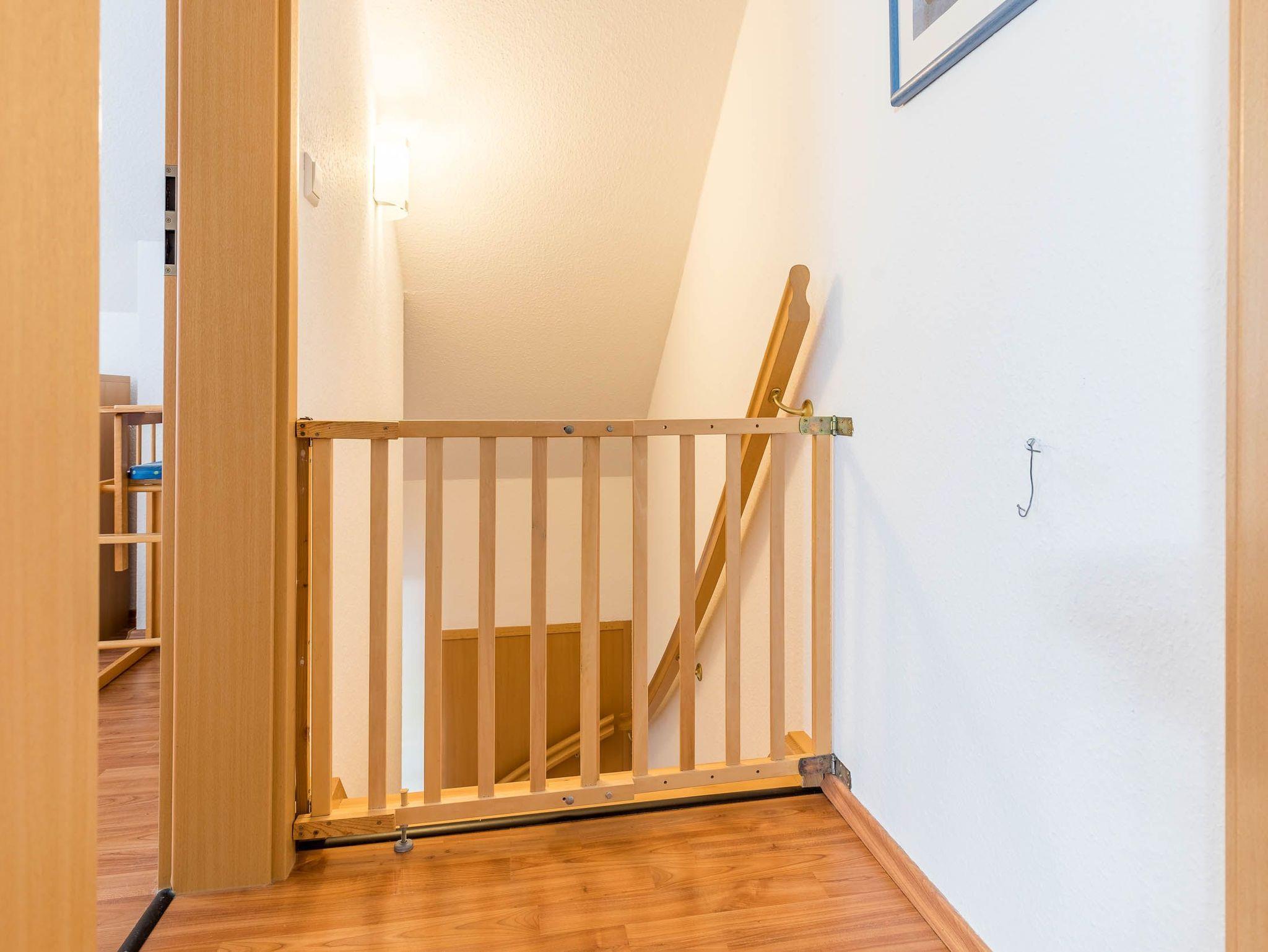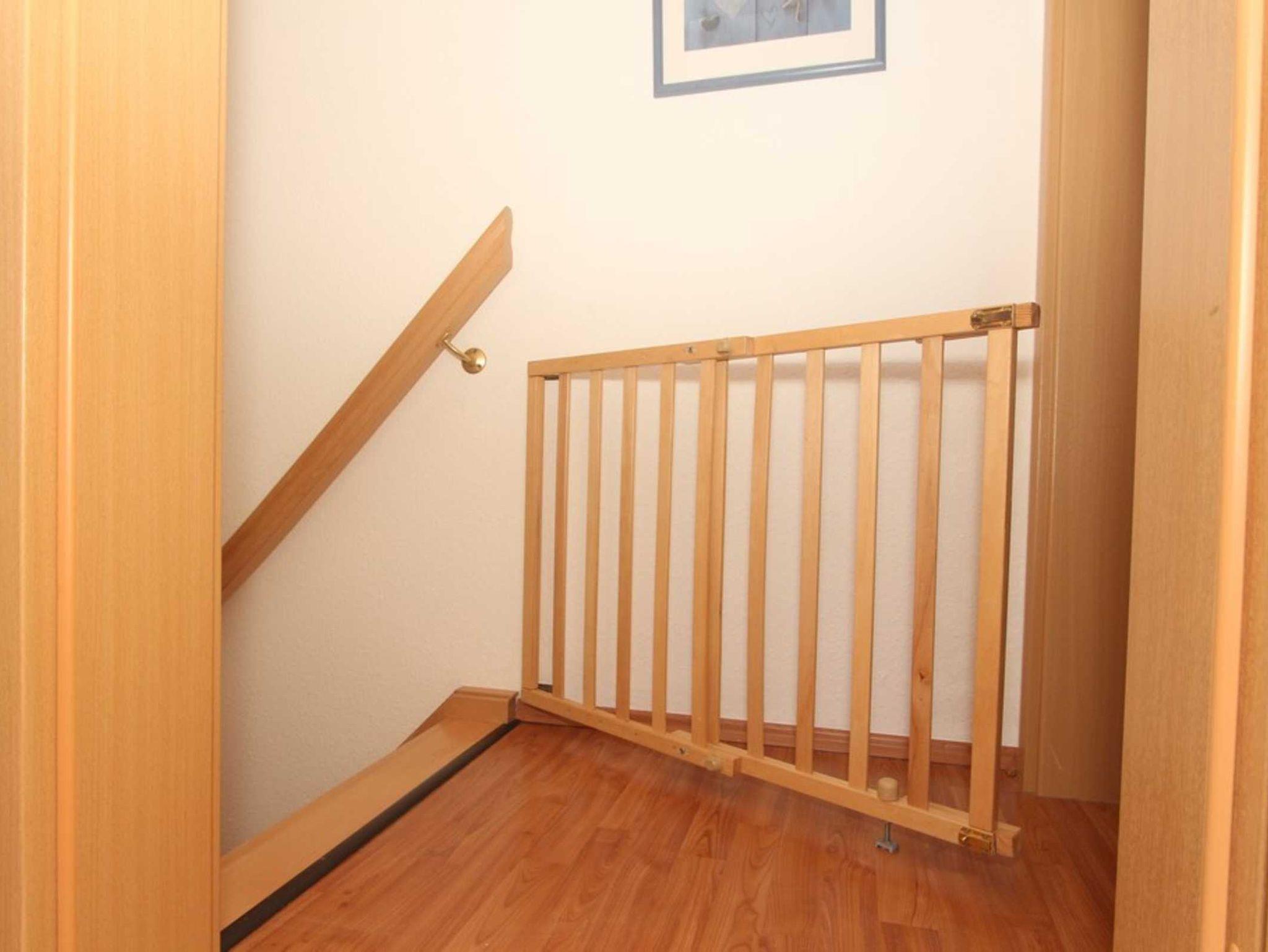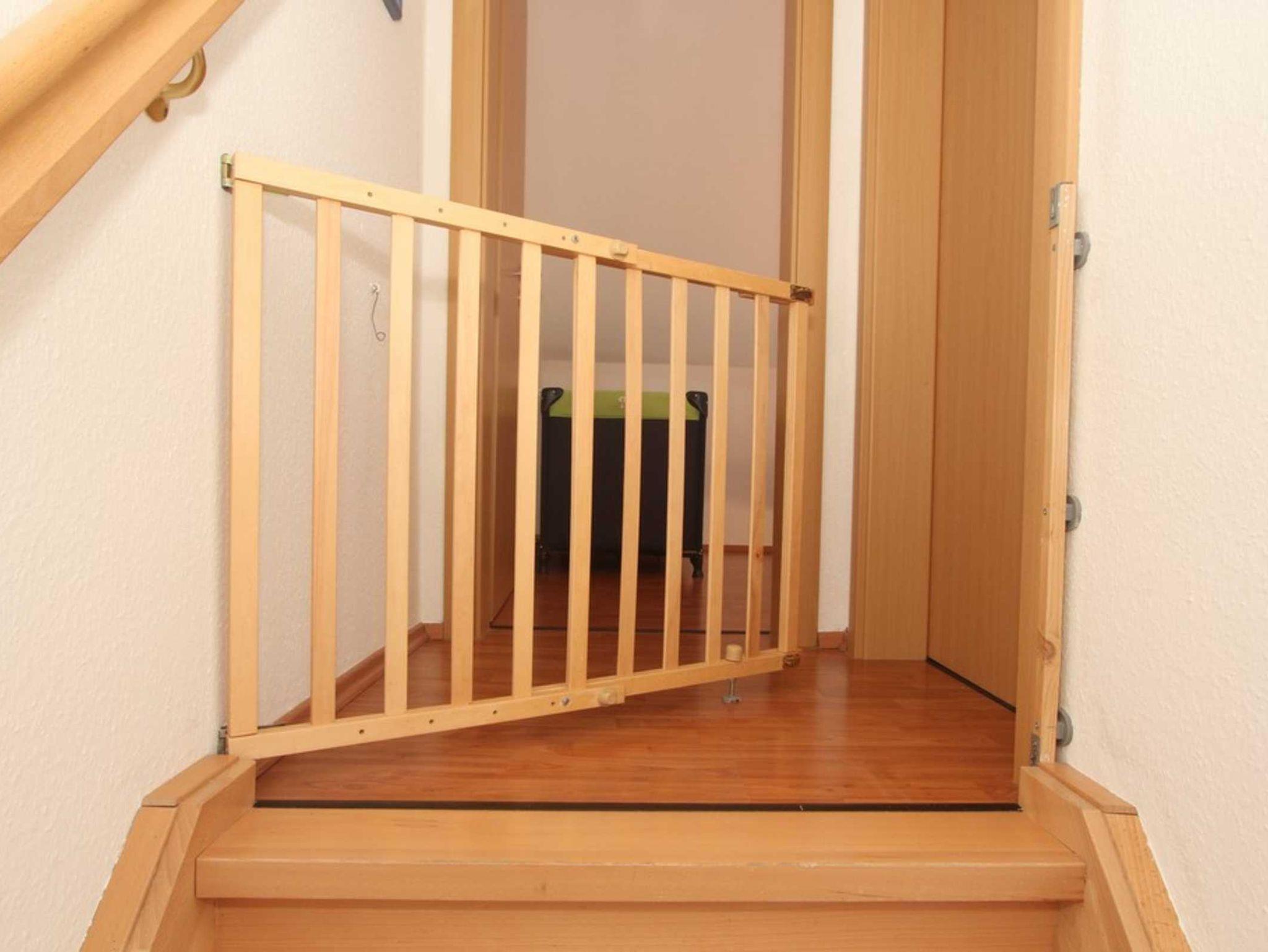 Vom Wohnungsflur aus führt eine Treppe ins Dachgeschoss. Am oberen Ende ist zur Sicherheit für unsere kleinen Gäste ein Treppenschutzgitter angebracht.
