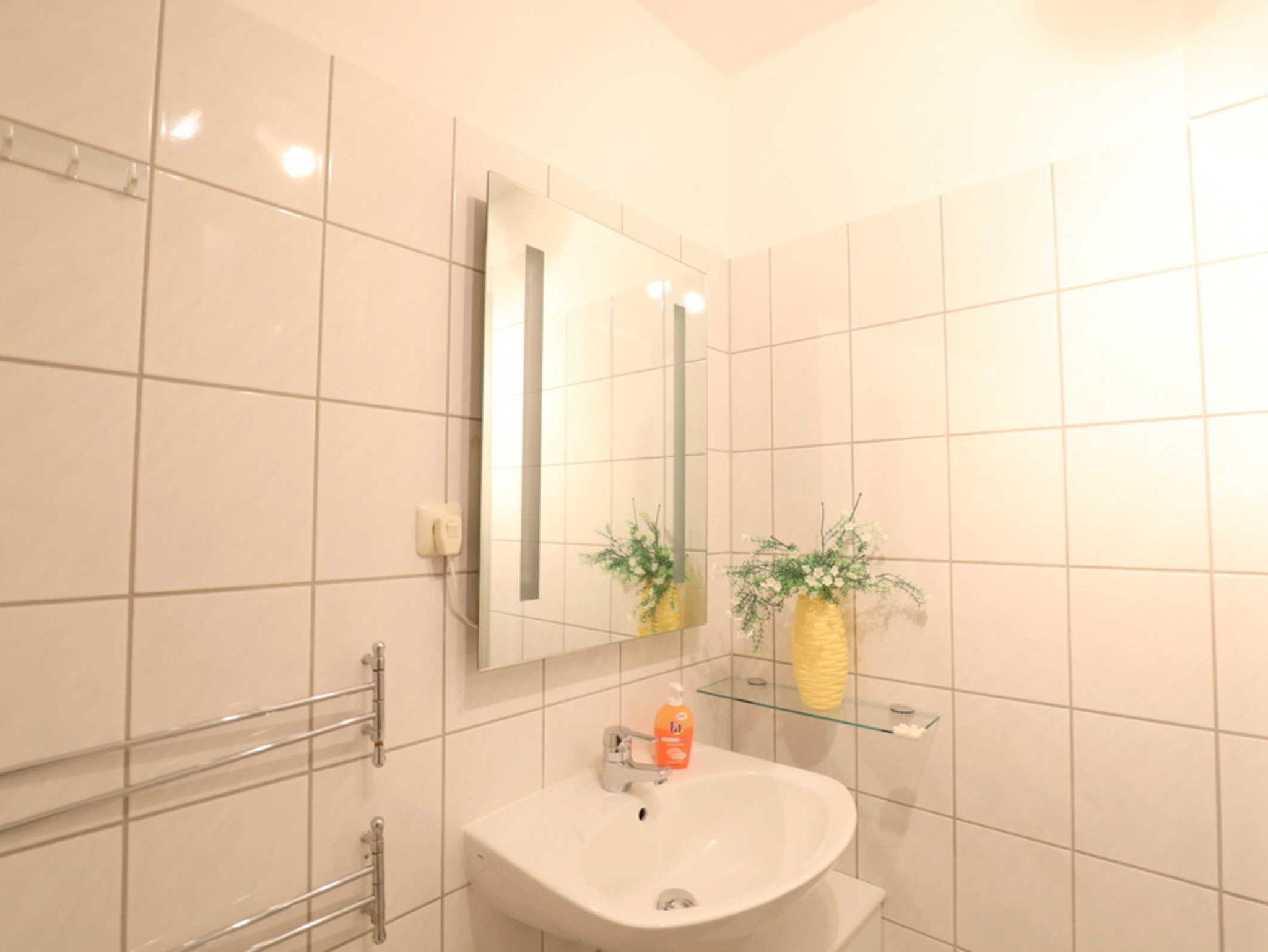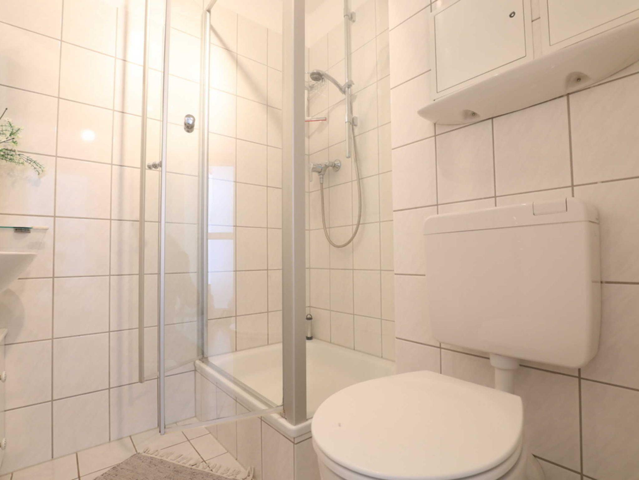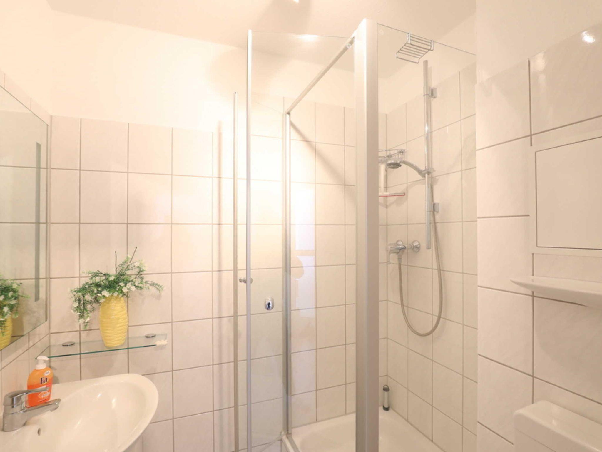 Im Bad finden Sie Dusche, Waschbecken und WC vor.