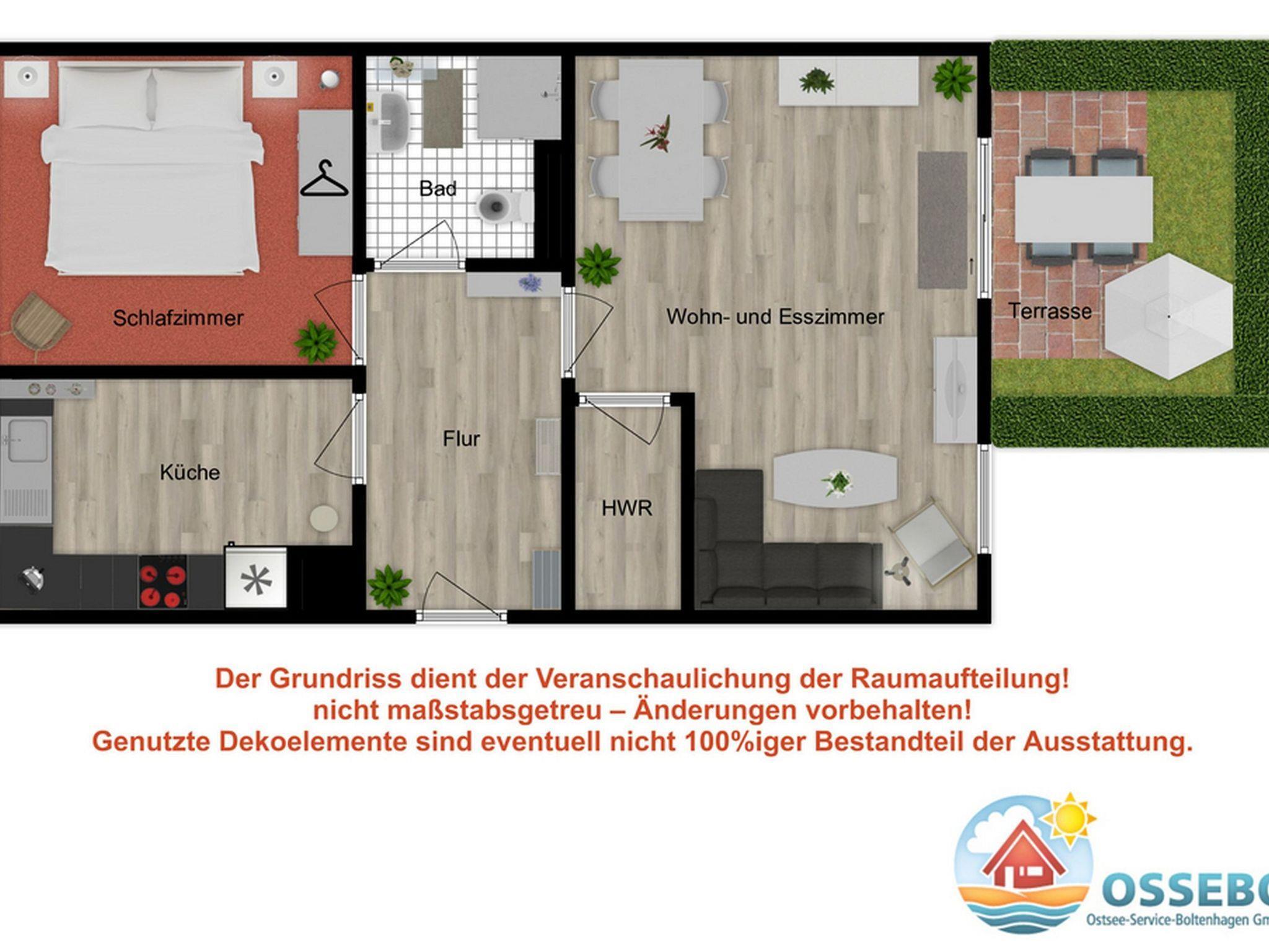 Die hell eingerichtete 2-Zimmer-Wohnung sorgt im Erdgeschoss auf knapp 55qm Wohnfläche mit ihrer reichlichen Ausstattung bis 4 Personen für einen unbeschwerten Urlaub.