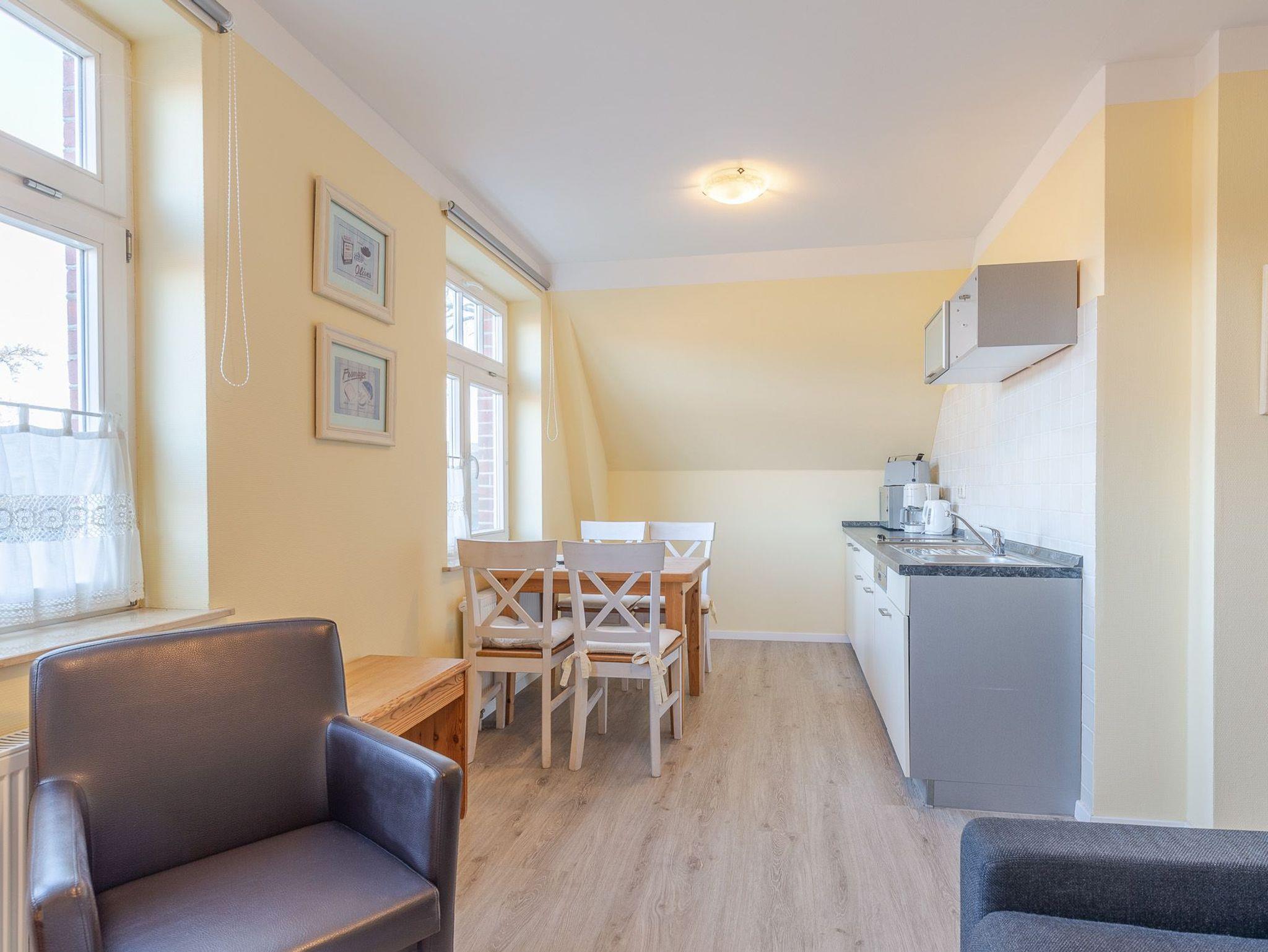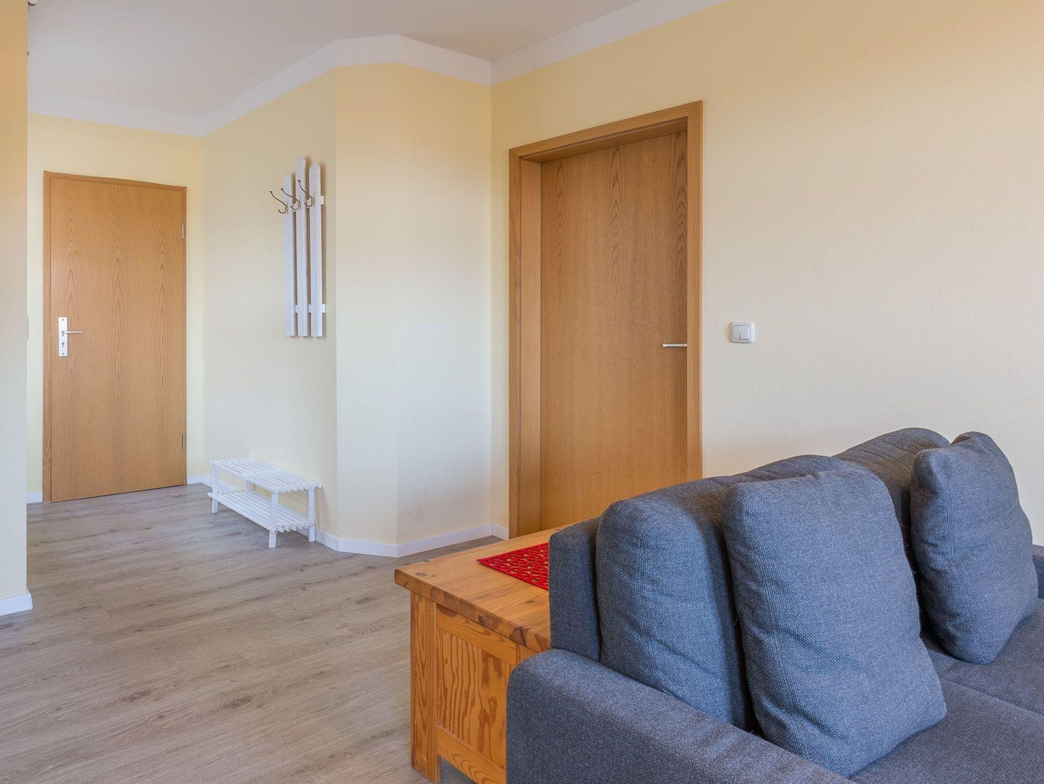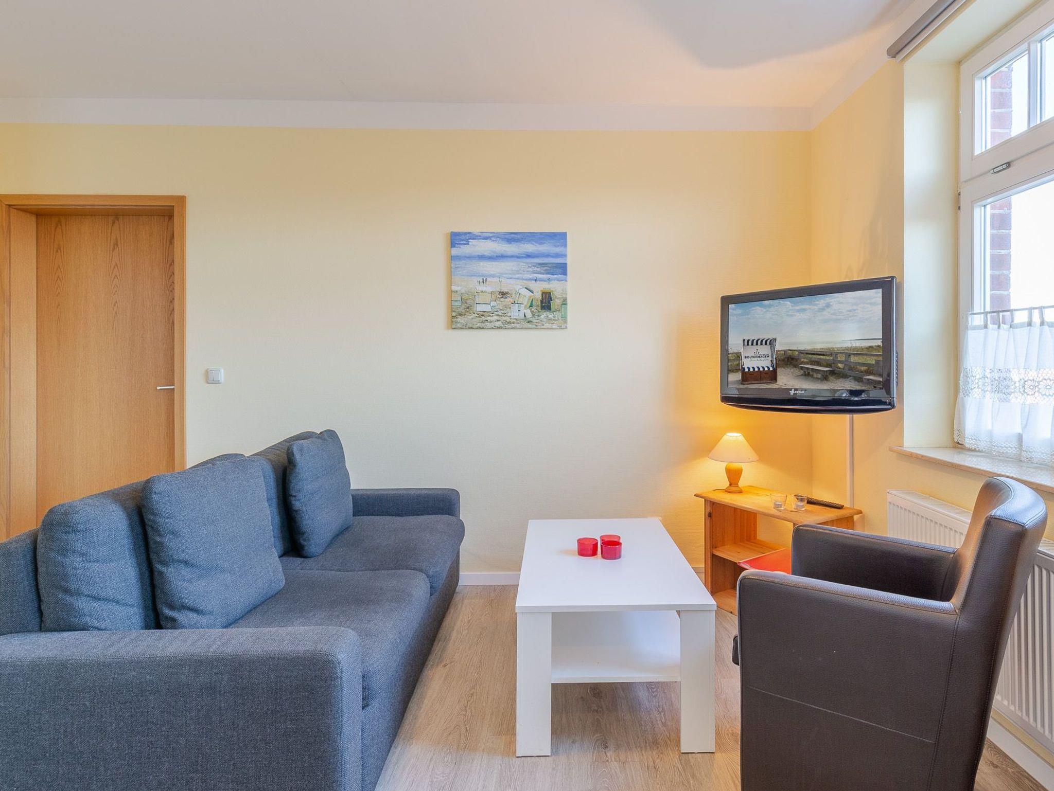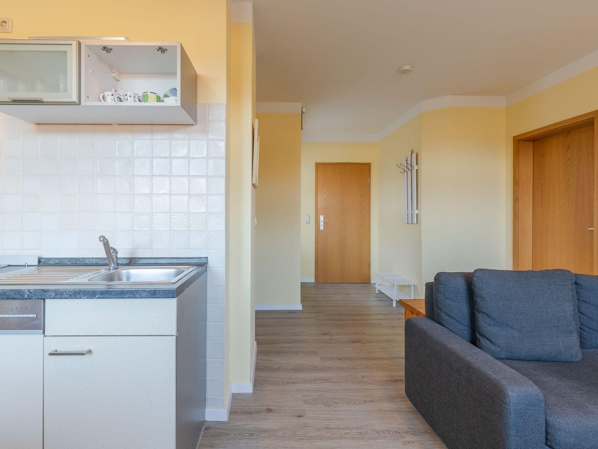 Die Ferienwohnung 05 im 1. Obergeschoss bietet mit einem Wohnzimmer mit Schlafcouch und einem separaten Schlafzimmer Platz für bis zu 4 Personen. Sie verfügt über einen großen Flachbild-TV, eine komplette Küchenzeile im Wohnbereich mit Geschirrspülmaschine, 2 Platten-Herd, Mikrowelle und Kühlschrank, sowie ein Badezimmer mit Dusche und WC.