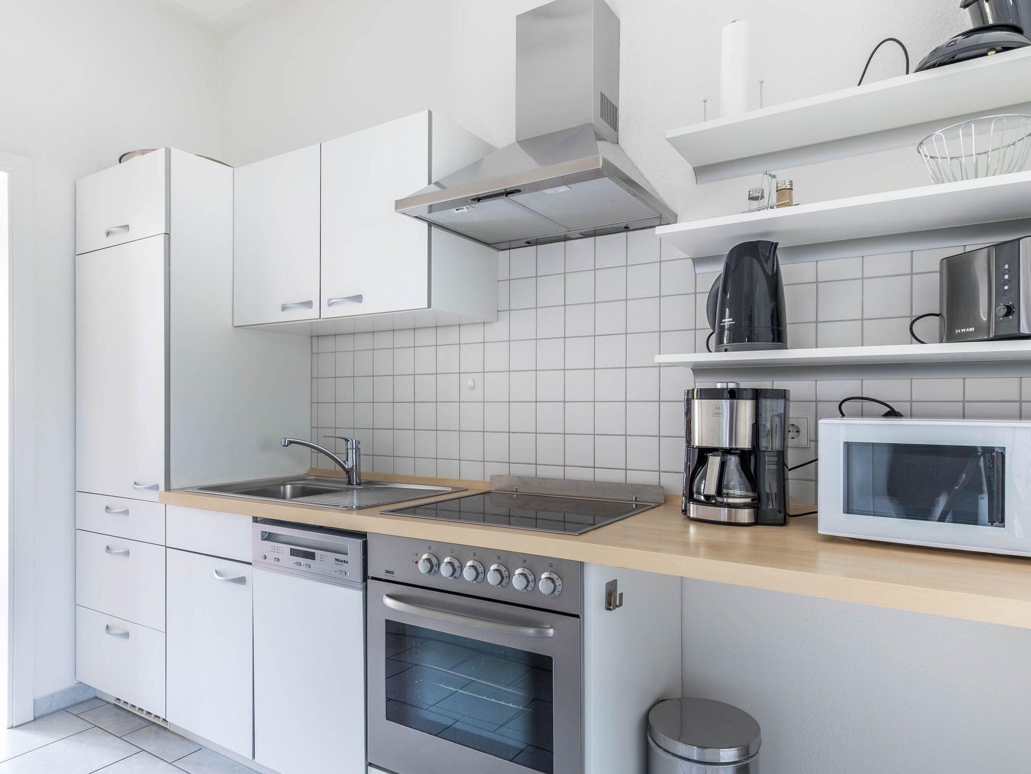 In der offen gestalteten Küchenzeile gibt es neben einem Herd mit Backofen einen Kühlschrank mit Gefrierfach, eine Spülmaschine, eine Mikrowelle, einen Toaster, einen Wasserkocher und Kaffeemaschine (1x Filter, 1x Pad).