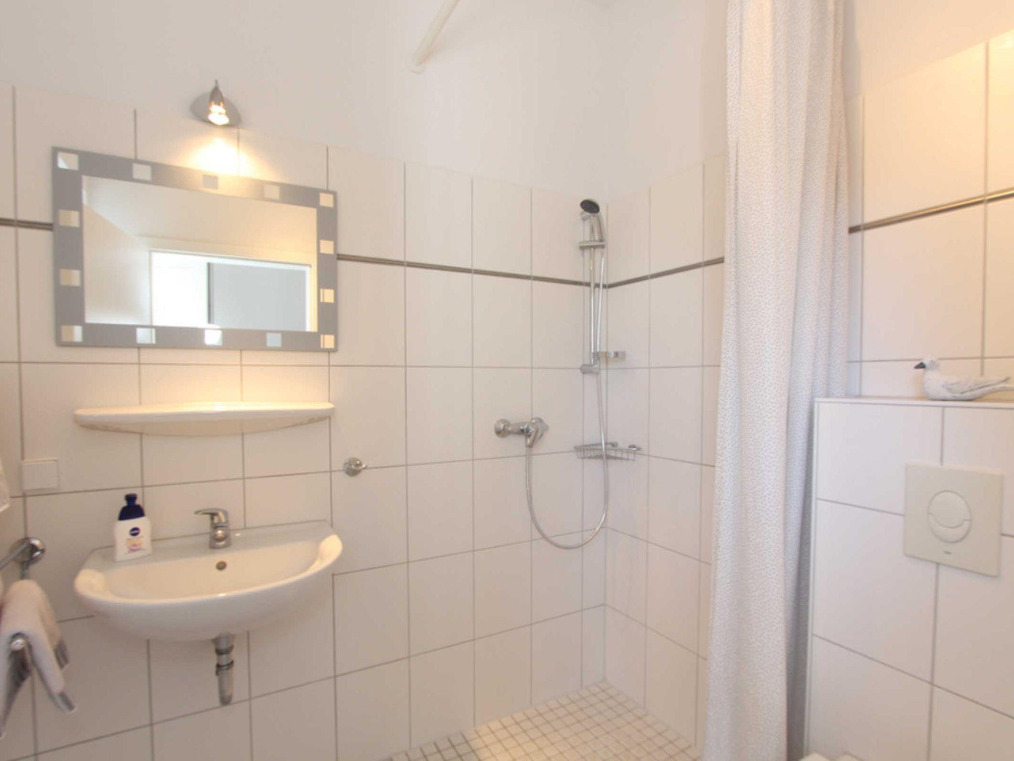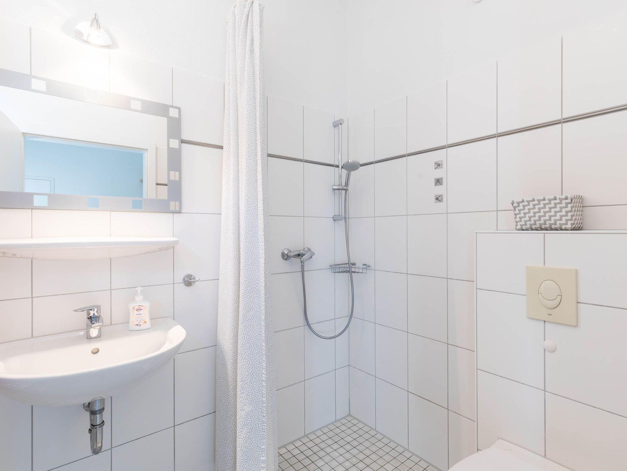Das hell geflieste Bad mit Fenster bietet eine barrierefreie Dusche (mit Vorhang) und WC.