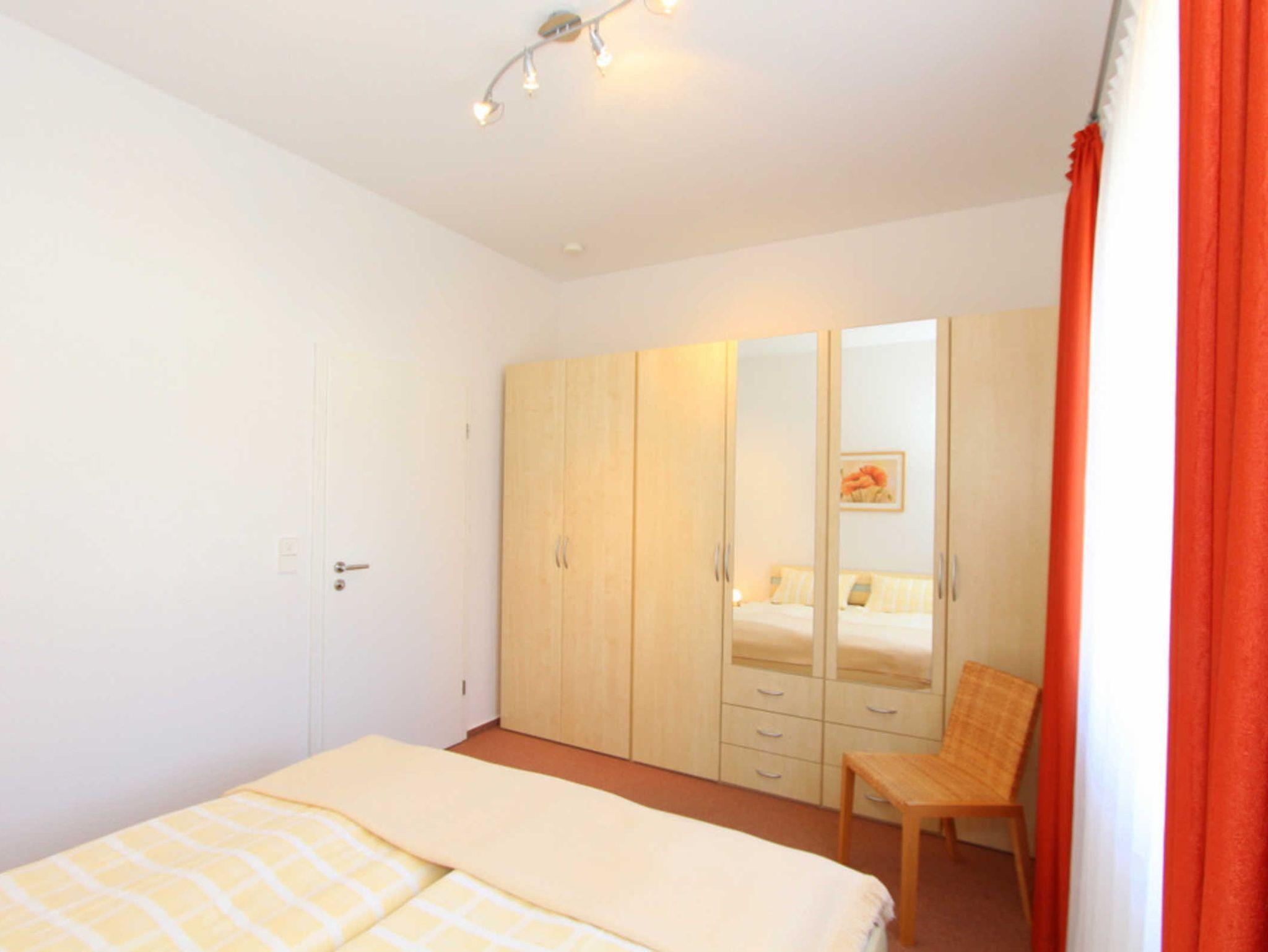 Das Schlafzimmer ist mit einem Doppelbett (180x200cm) und einem großen Kleiderschrank eingerichtet.