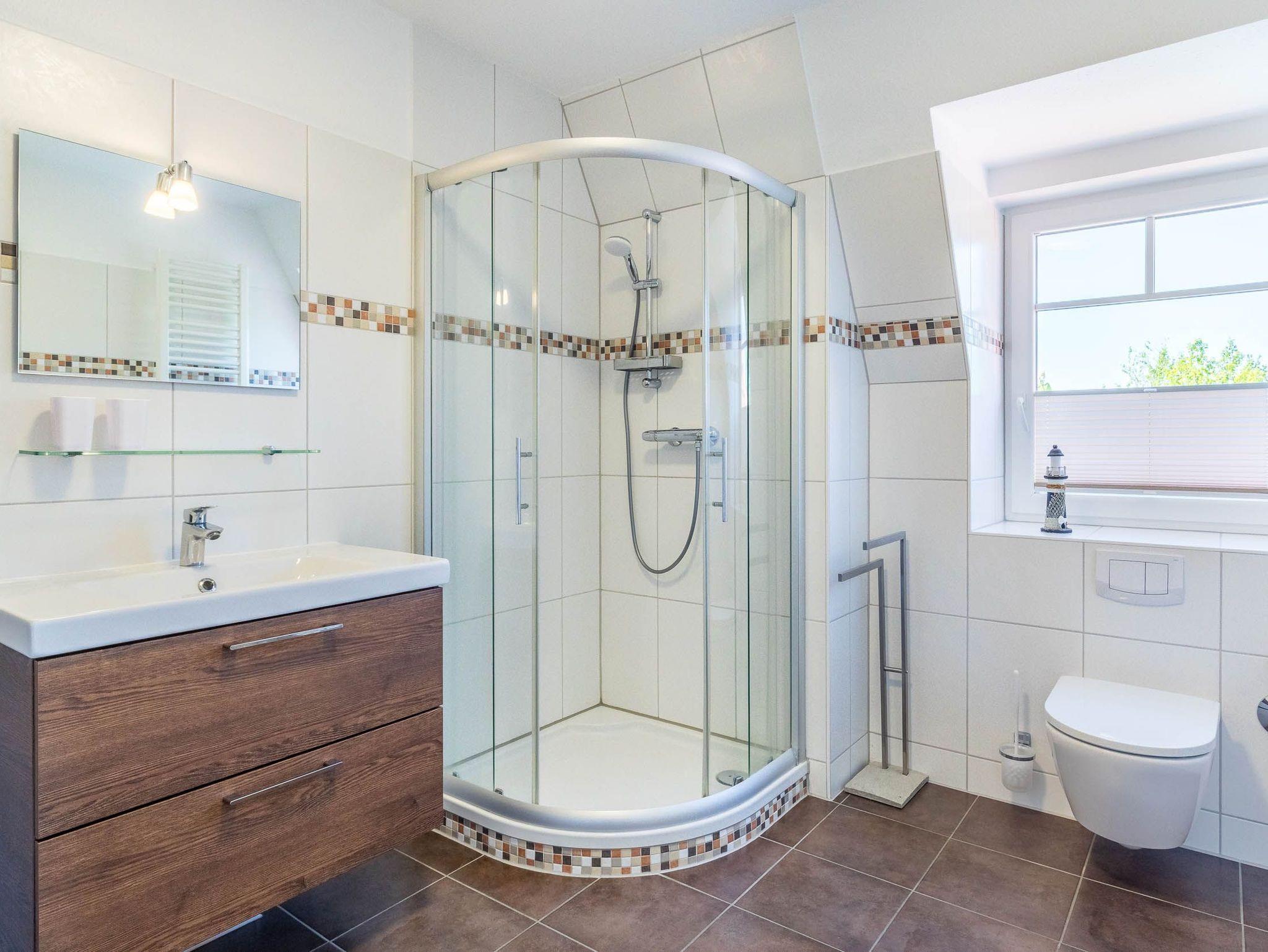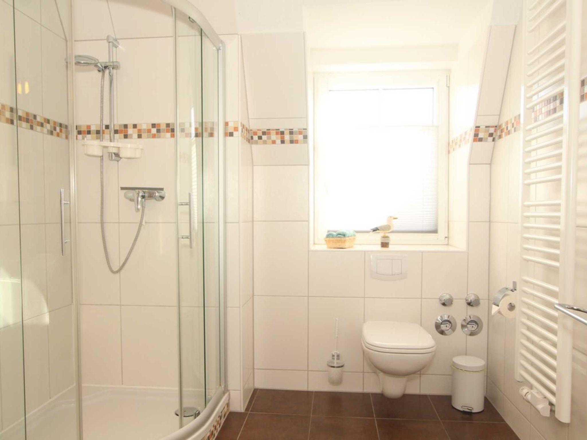Das schick geflieste Bad bietet Dusche und WC. Eine große Handtuchheizung sorgt zusätzlich für wohlige Wärme. Das Fenster spendet angenehmes Tageslicht und hilft beim Lüften nach dem Duschen.