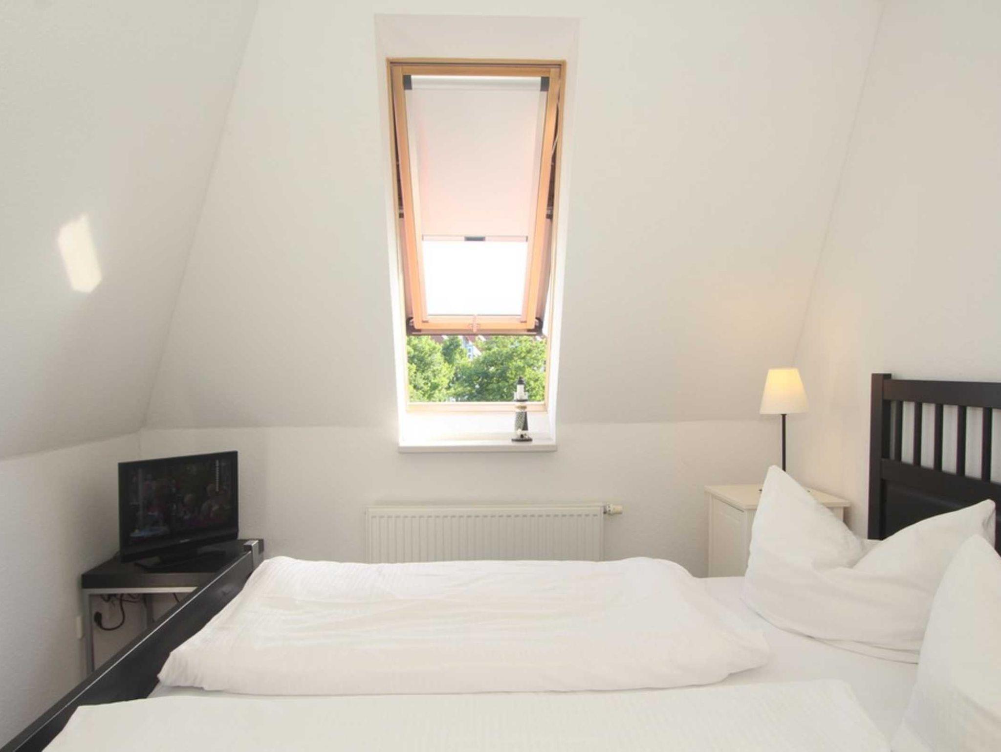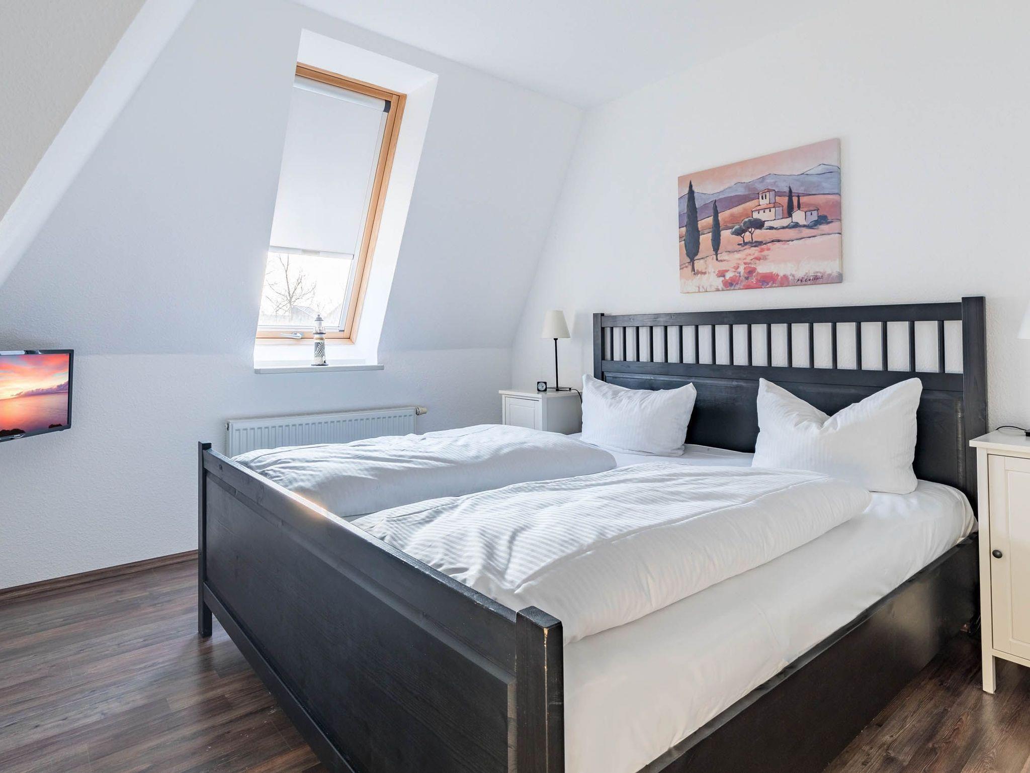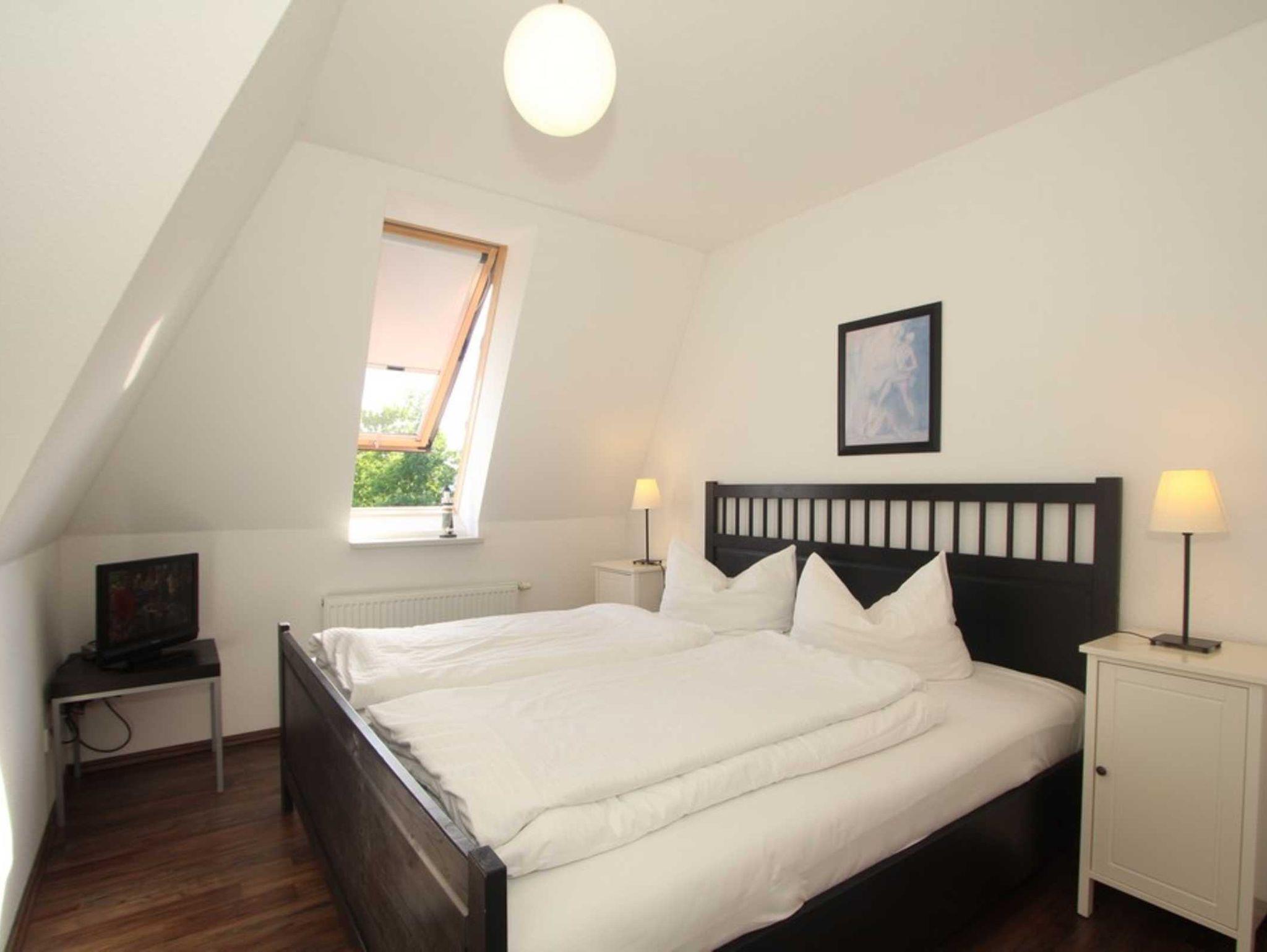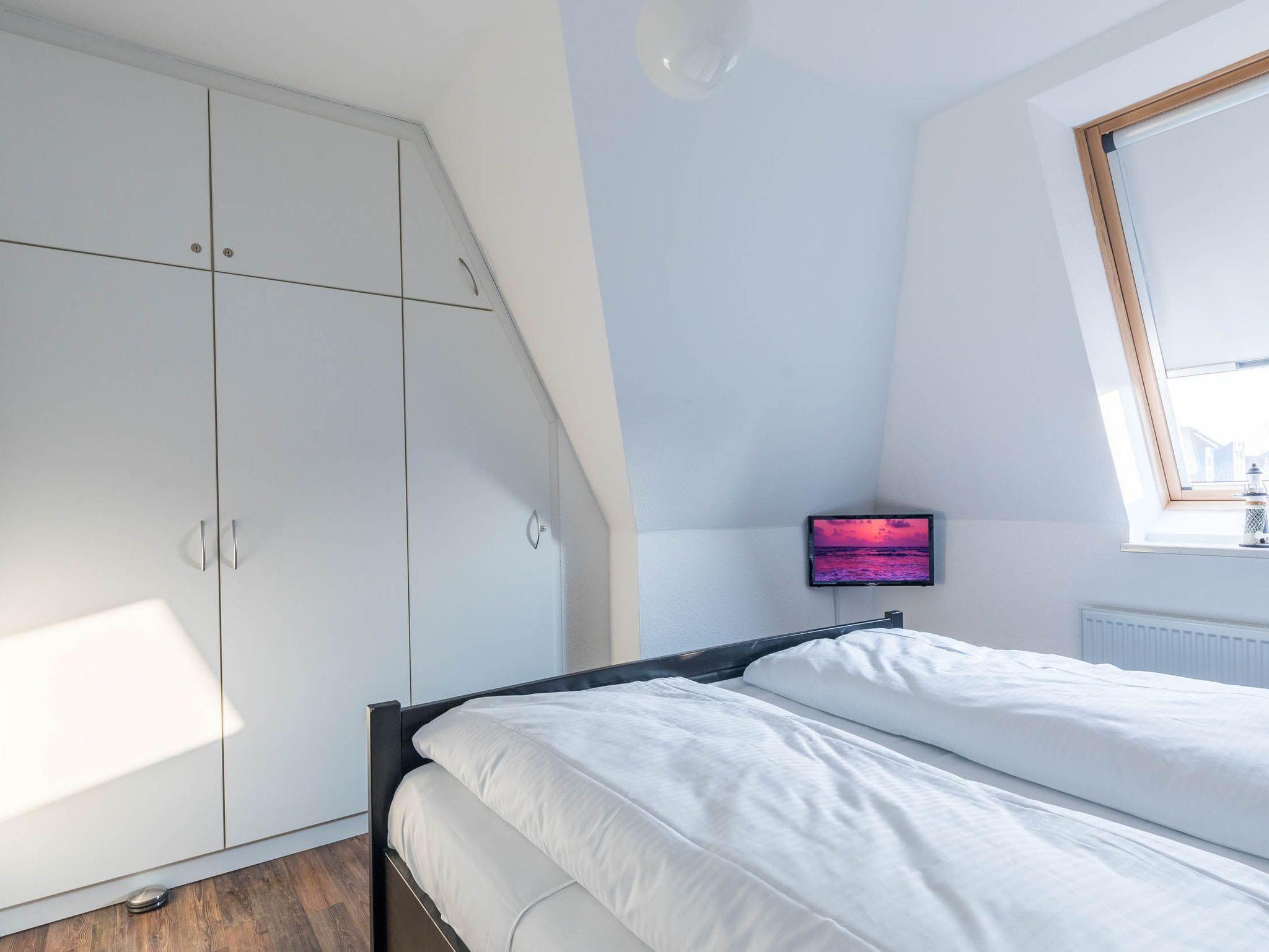 Ein TV-Gerät befindet sich ebenfalls im Schlafzimmer, in dem ein bequemes Doppelbett sowie ein Kleiderschrank stehen.