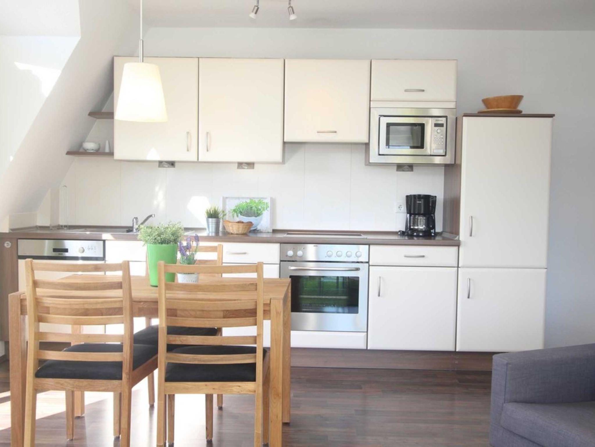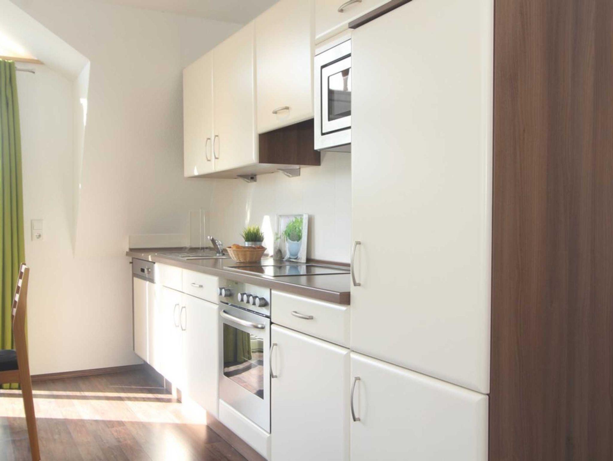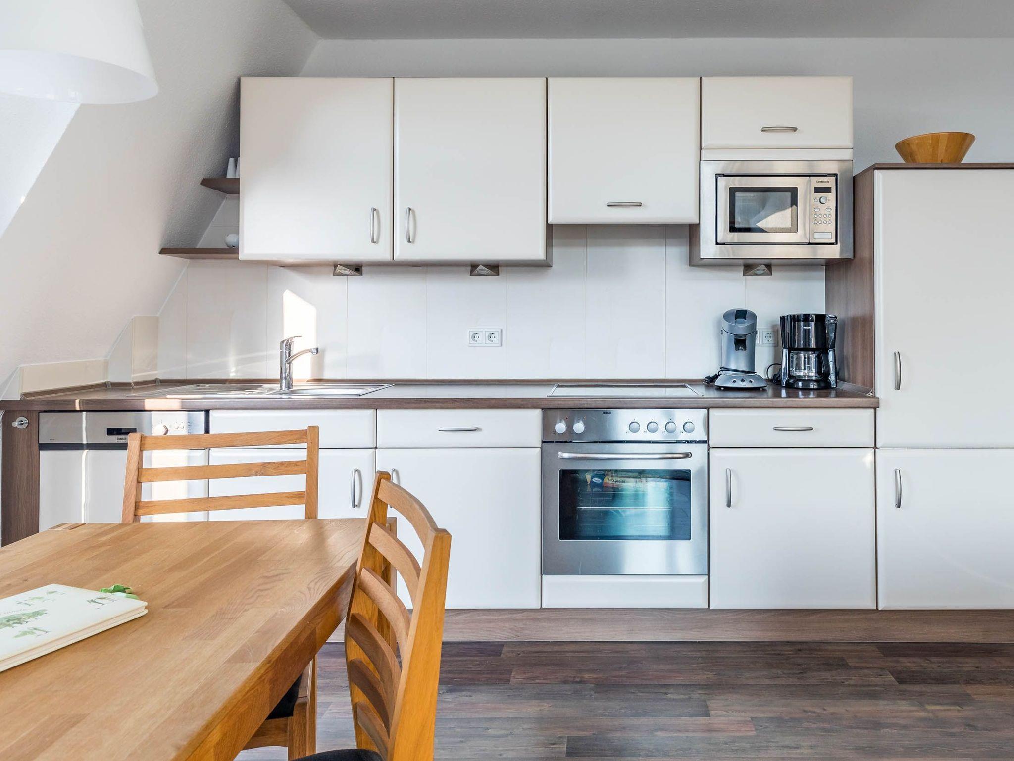 Die Wohnküche mit offener Küchenzeile und bequemer Essecke lädt zu gemütlichen Mahlzeiten ein. Zu den hilfreichen Haushaltsgeräten gehören u.a. eine Mikrowelle und ein Geschirrspüler.