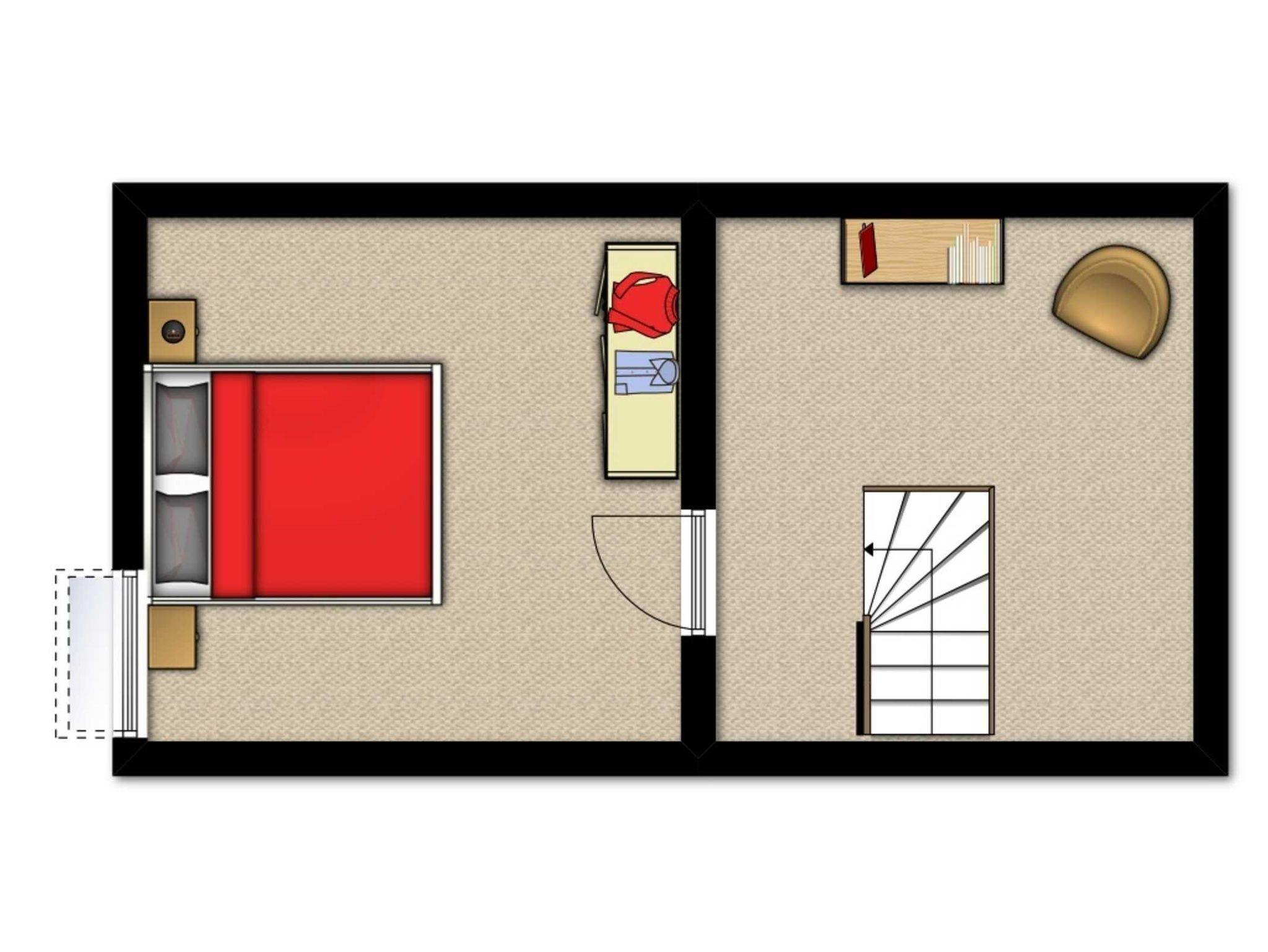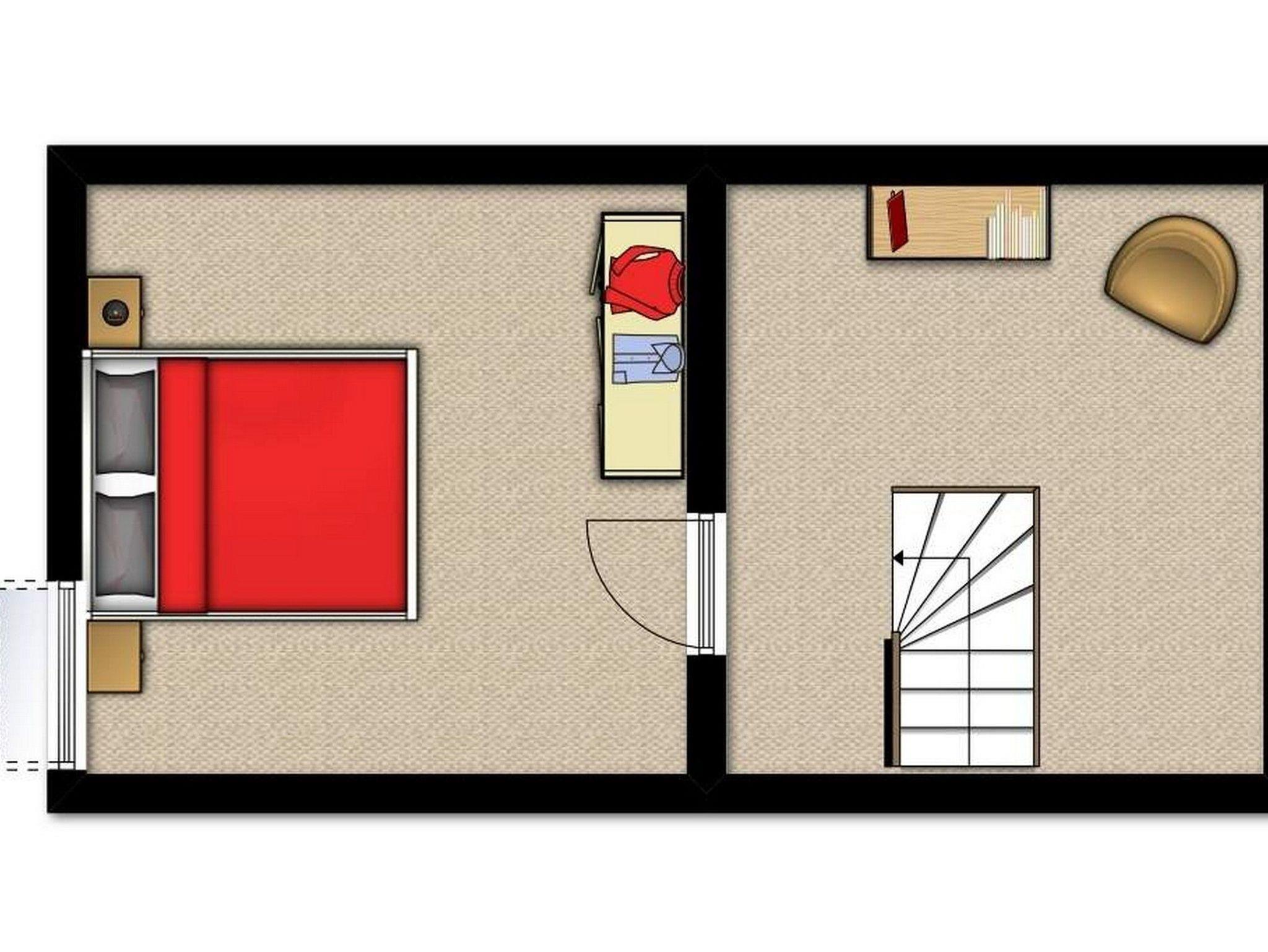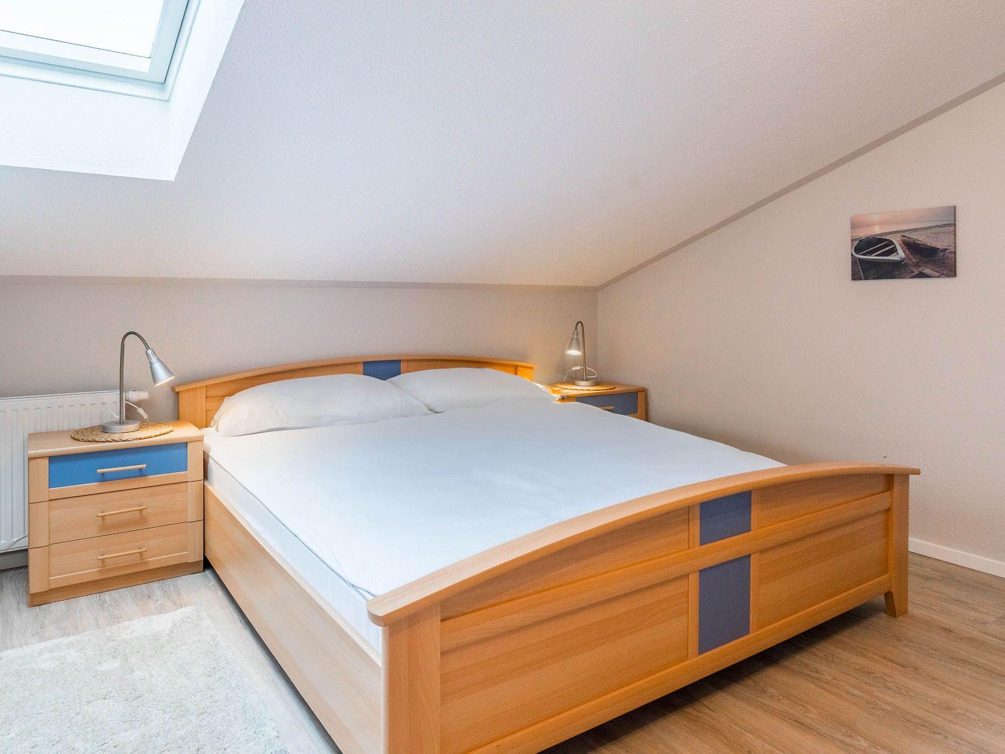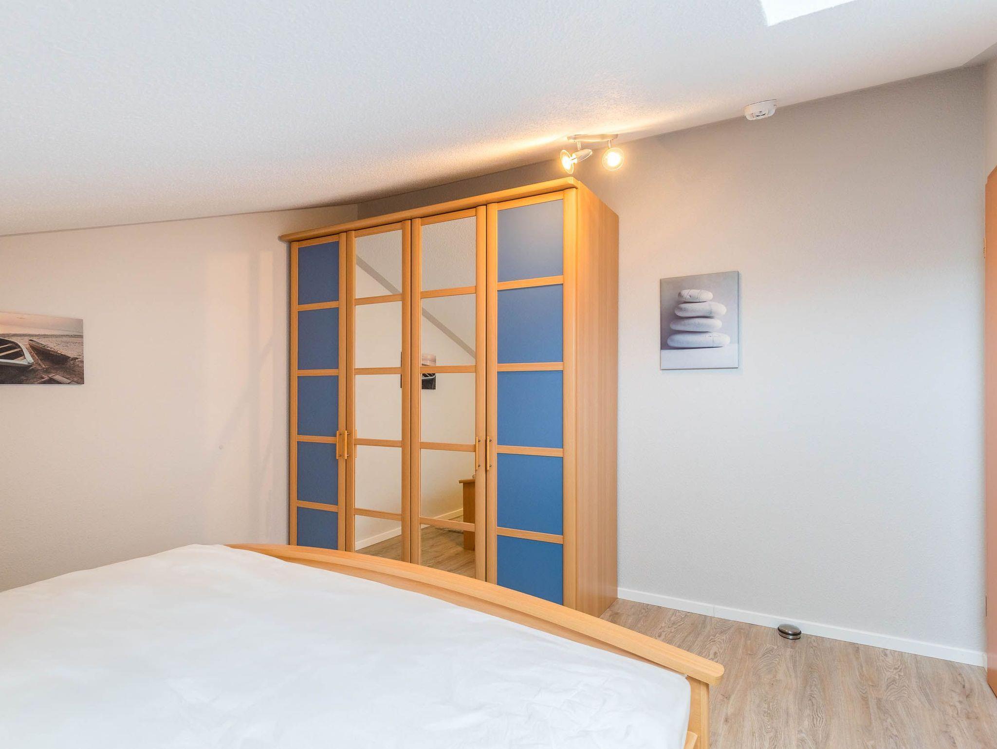 Das zweite Schlafzimmer, mit Doppelbett, ist in der zweiten Wohnebene, im DG eingerichtet. Auch hier gibt es einen großzügigen Kleiderschrank für Ihre Urlaubsgarderobe.