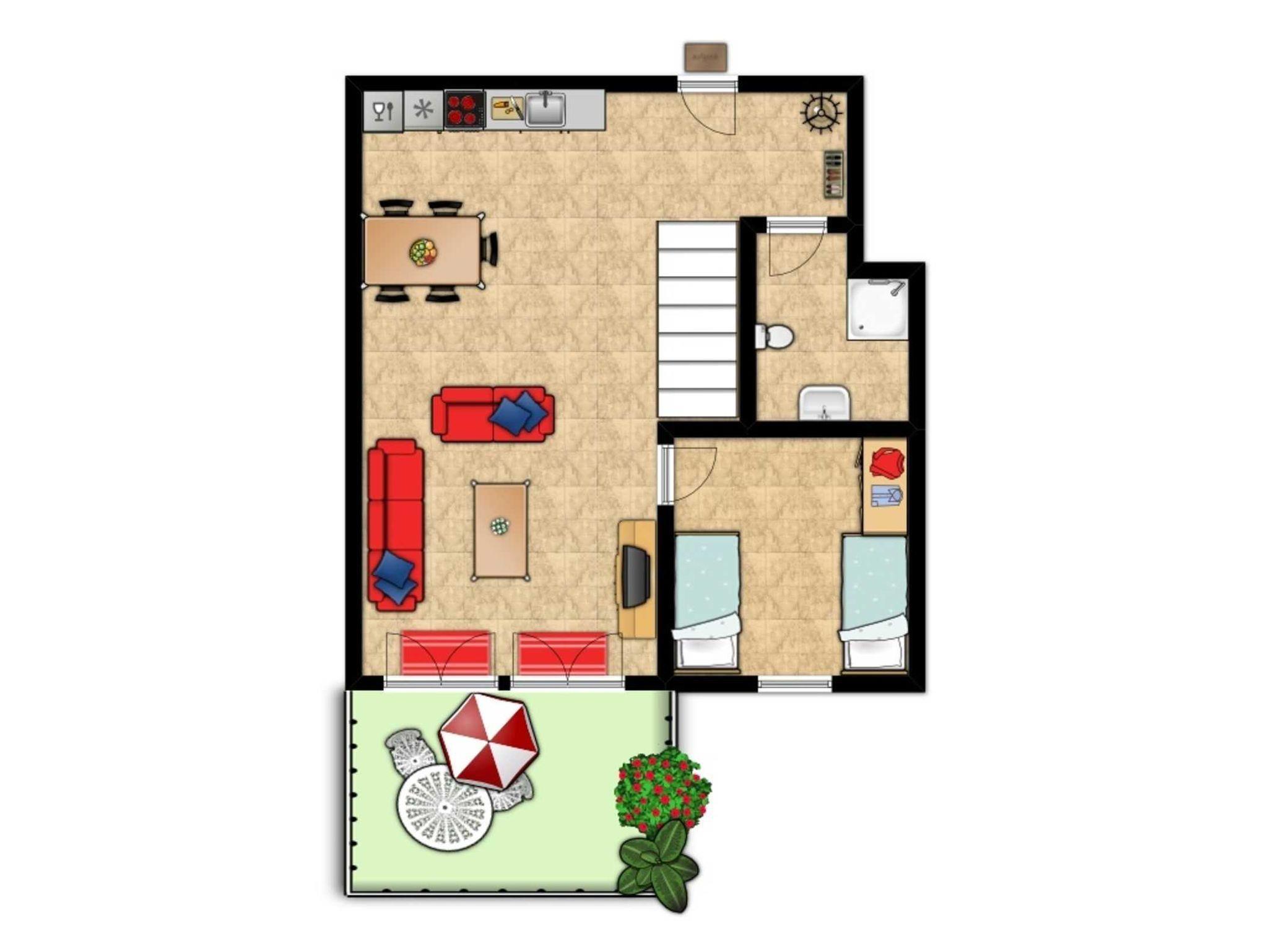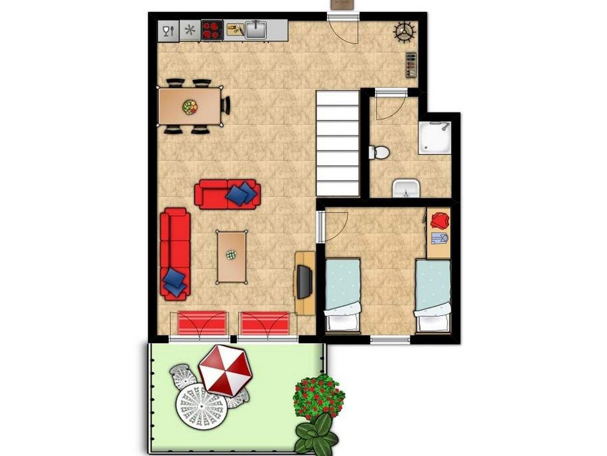 Die hier integrierte Küchenzeile bietet optimale technische Einrichtungen ? wie eine Spülmaschine, einen Kühlschrank mit Gefrierfach, eine Kaffeemaschine, einen Herd bzw. Backofen und einen Toaster.
