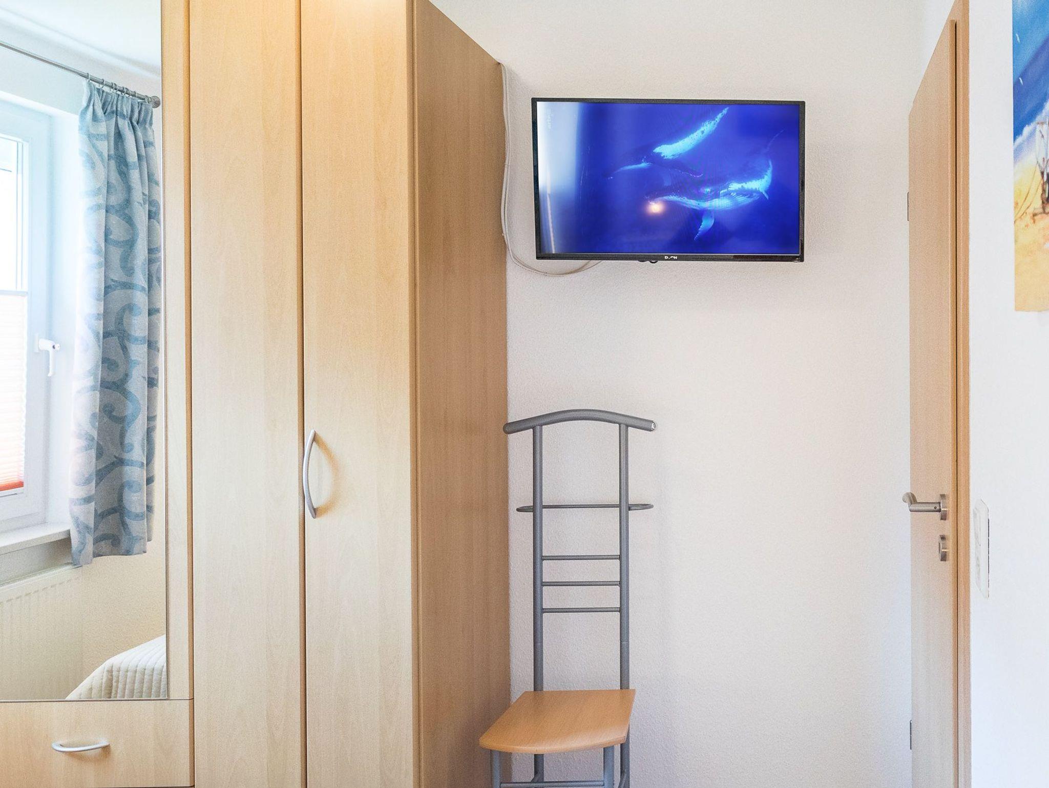 Das Schlafzimmer bietet ein bequemes Doppelbett (180x200cm/ Höhe 49cm), Kleiderschrank und einen weiteren Fernseher. Die Vorhänge und Außenrollos dienen hervorragend zum Abdunkeln.