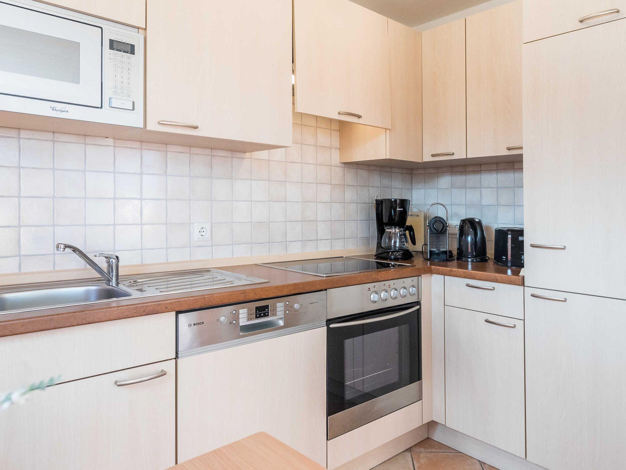 Der kombinierte Wohn- und Küchenbereich bietet eine bequeme, ausziehbare Sofalandschaft (Liegefläche ausgeklappt 150x190cm) und einen modernen Flatscreen-TV (Sat), kombiniert mit einer komfortabel ausgestatteten Küche inklusive Essecke mit passenden Stühlen. Die offene Küche bietet neben der Grundausstattung u.a. eine Krups Kapselmaschine, einen Sandwichtoaster und auch einen Handmixer.