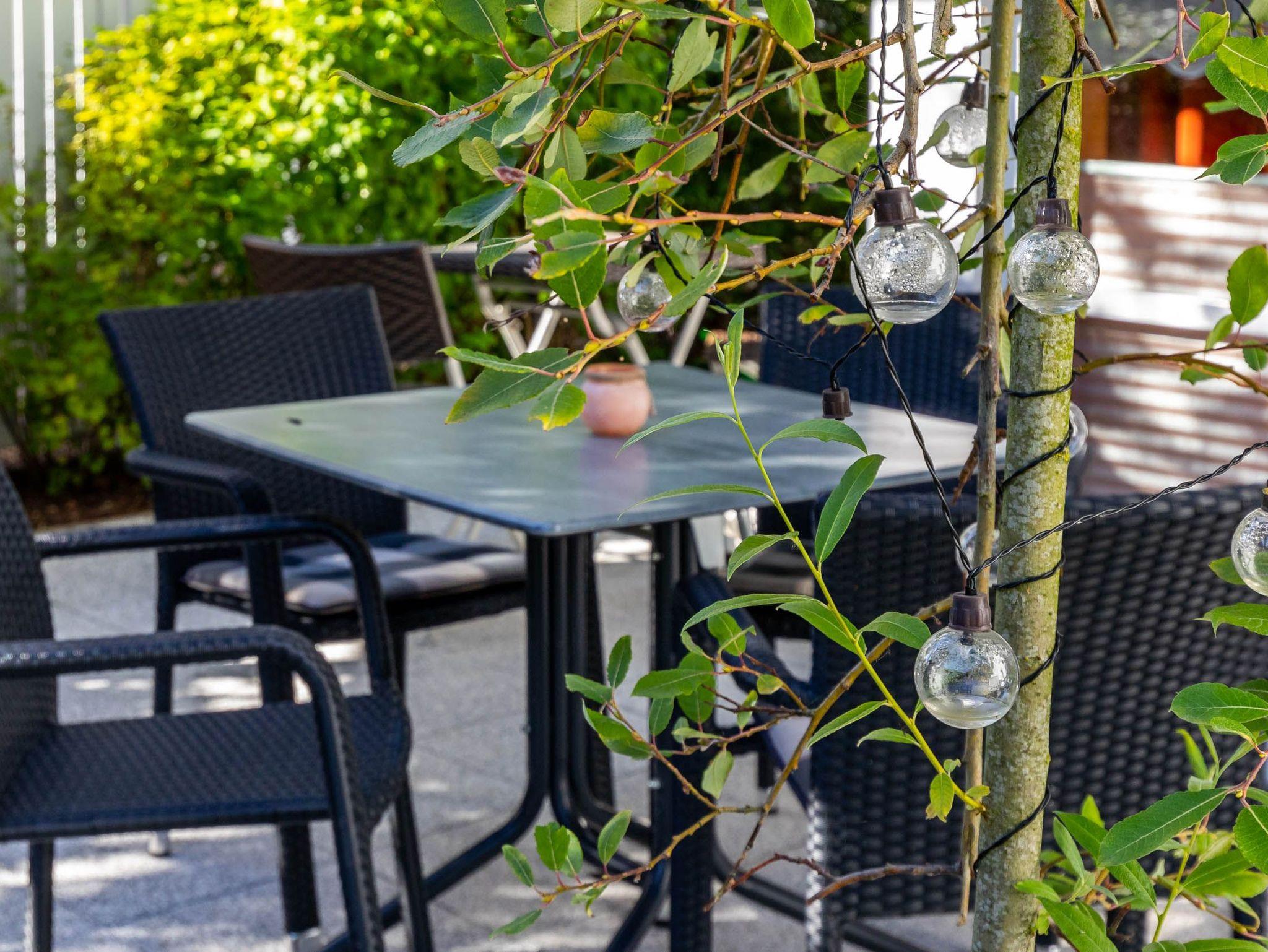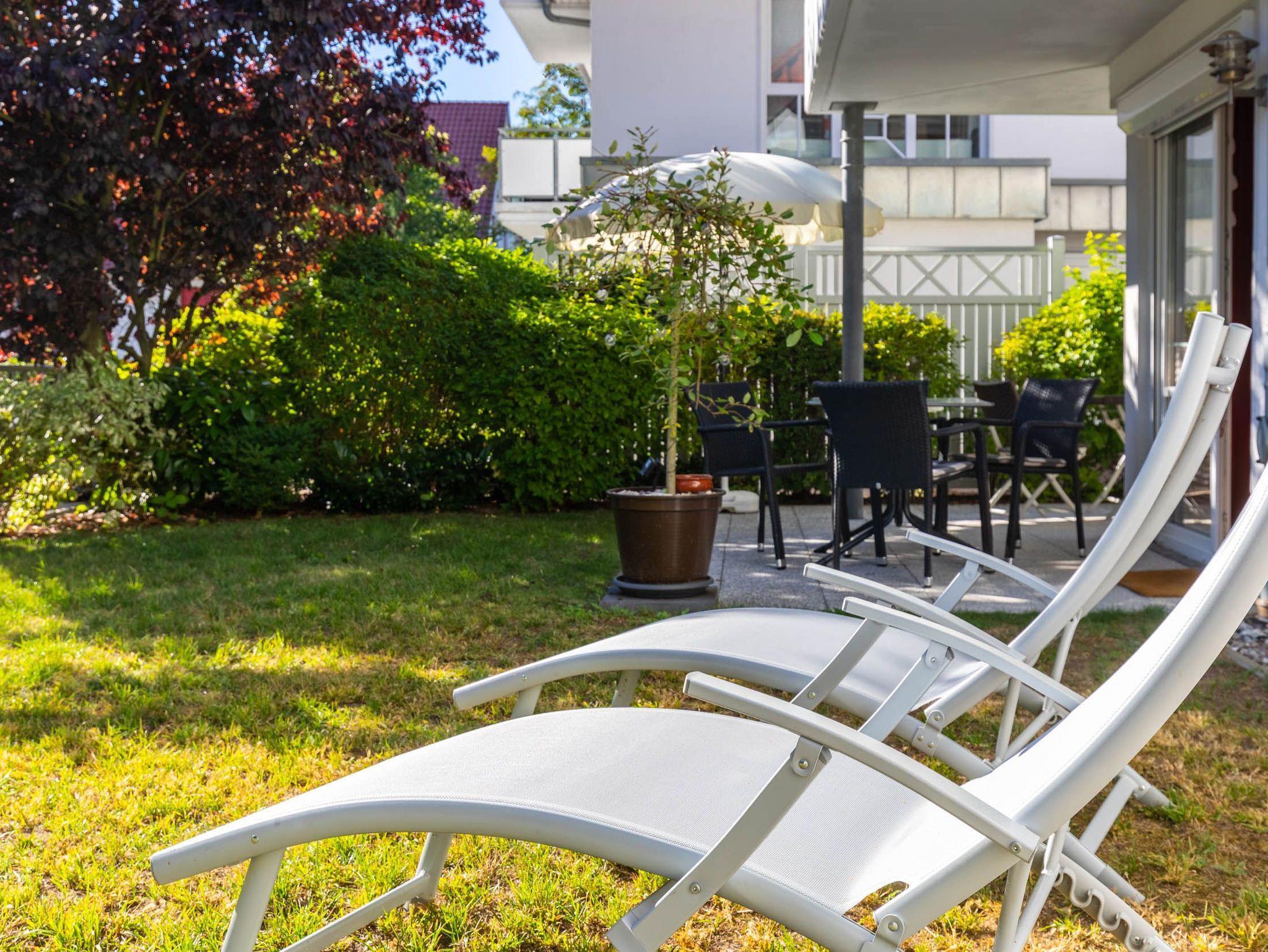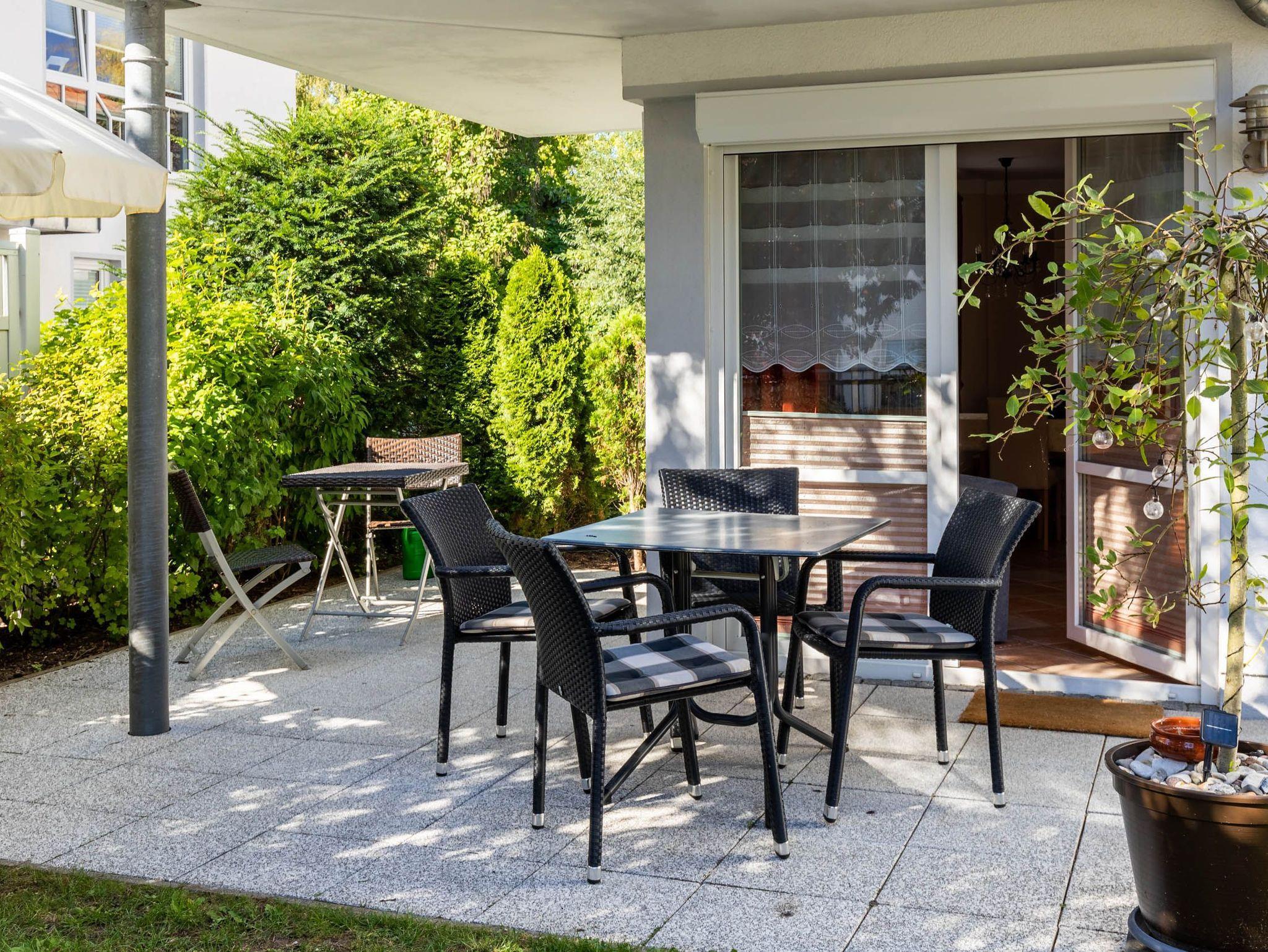 Vom Wohnzimmer aus gelangen Sie direkt auf die möblierte, teilweise sichtgeschützte Eckterrasse in Nordost-Südwest-Ausrichtung.