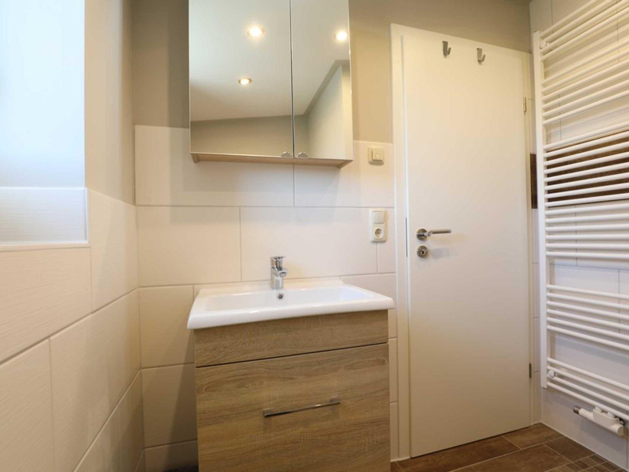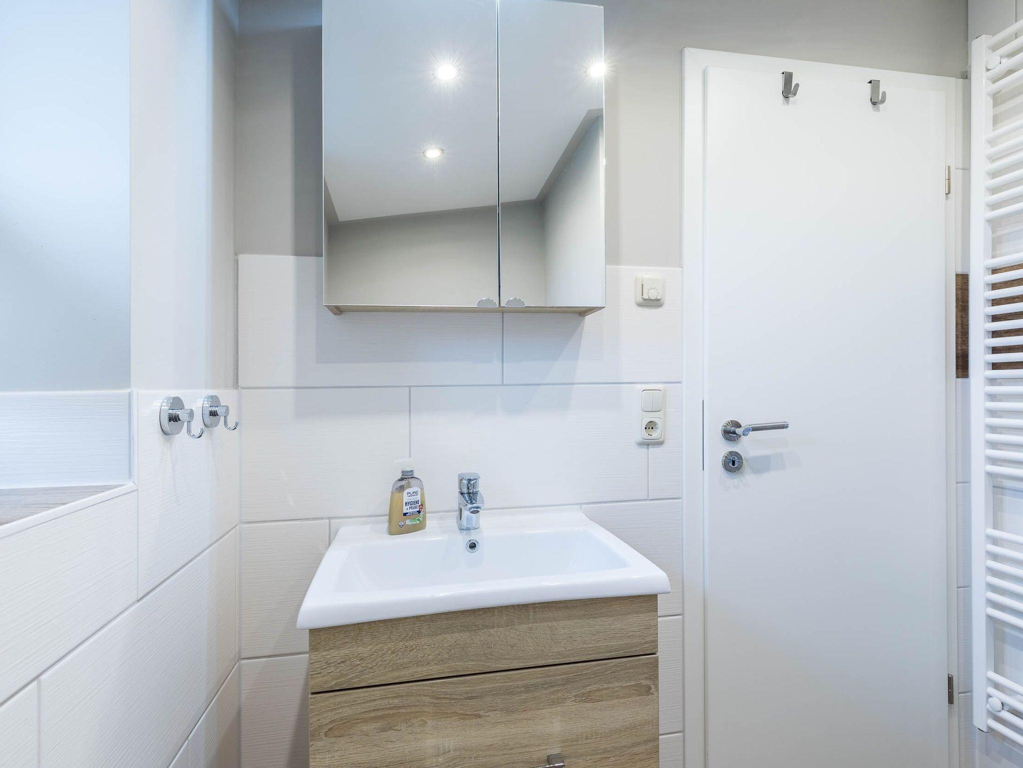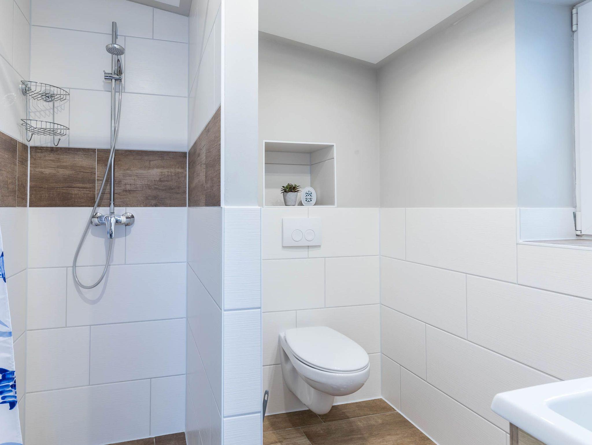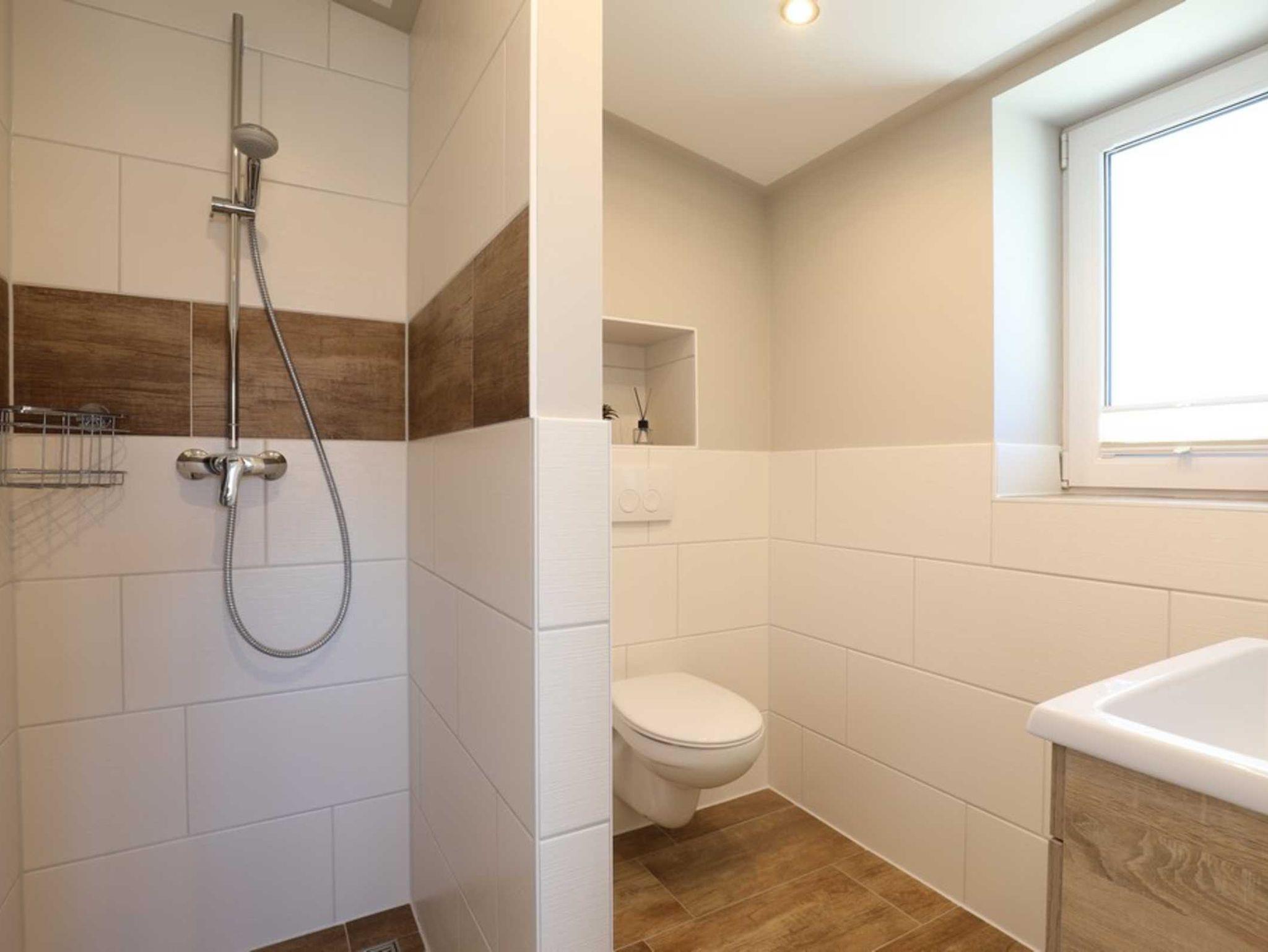 Weiterhin gehört zur Wohnung ein modernes Bad mit ebenerdiger Dusche, ein schöner Waschtisch und WC. Das Fenster spendet zusätzliches Tageslicht und erleichtert das Lüften nach dem Duschen.