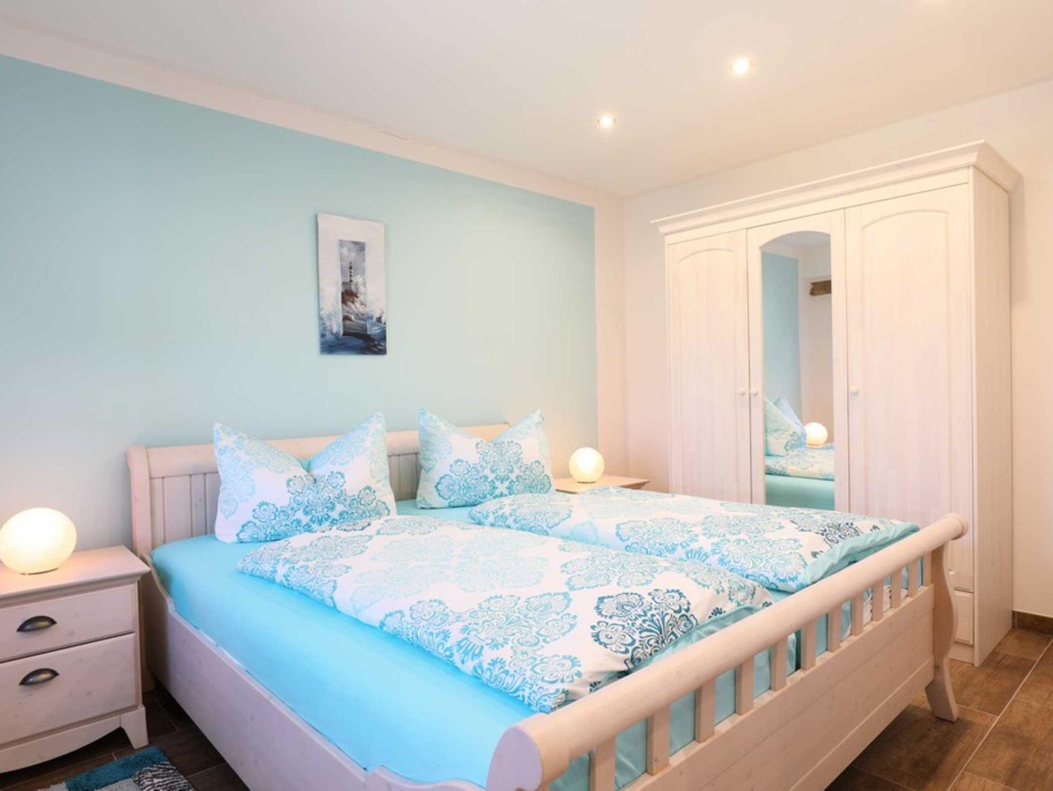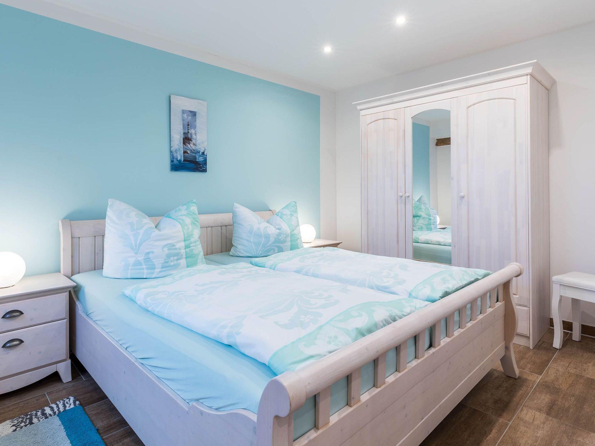 Das separate Schlafzimmer ist mit Doppelbett (180x200m) eingerichtet. Für Ihre Urlaubsgarderobe steht hier ein passender Kleiderschrank für Sie bereit.
