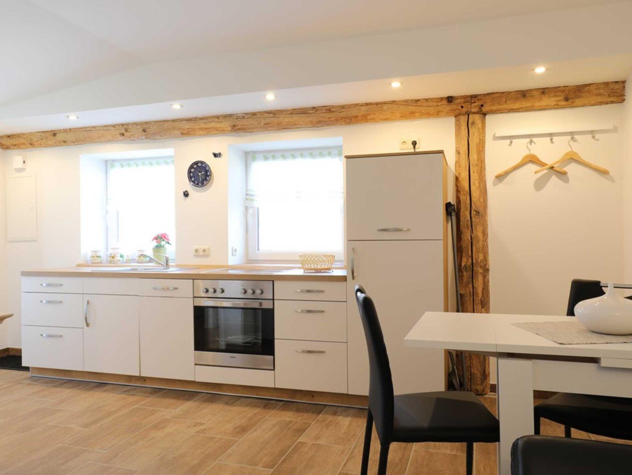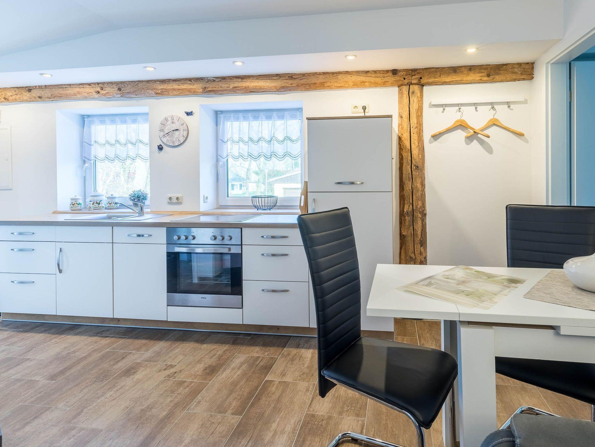 Die angrenzende Wohnküche ist sehr gut ausgestattet und bietet z.B. neben Backofen und Herd ebenso einen Geschirrspüler. Der Kühlschrank ist zusätzlich mit einem Gefrierfach ausgestattet.