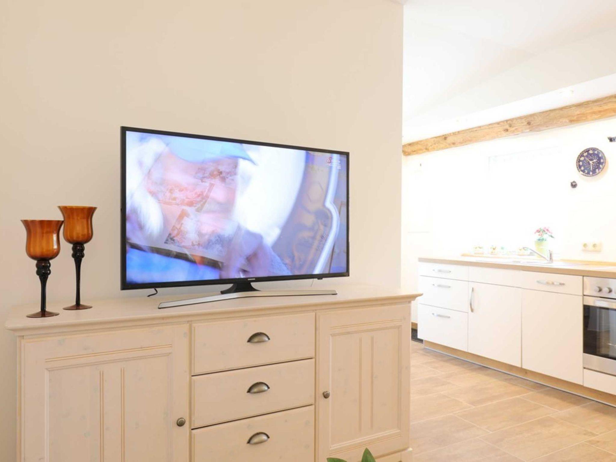 Der offene Wohn- und Essbereich ist hell und freundlich eingerichtet. Ein großer Flatscreen-TV sorgt für Ihre Multimediaunterhaltung. (Das moderne Sofa ist nicht ausfahrbar.)