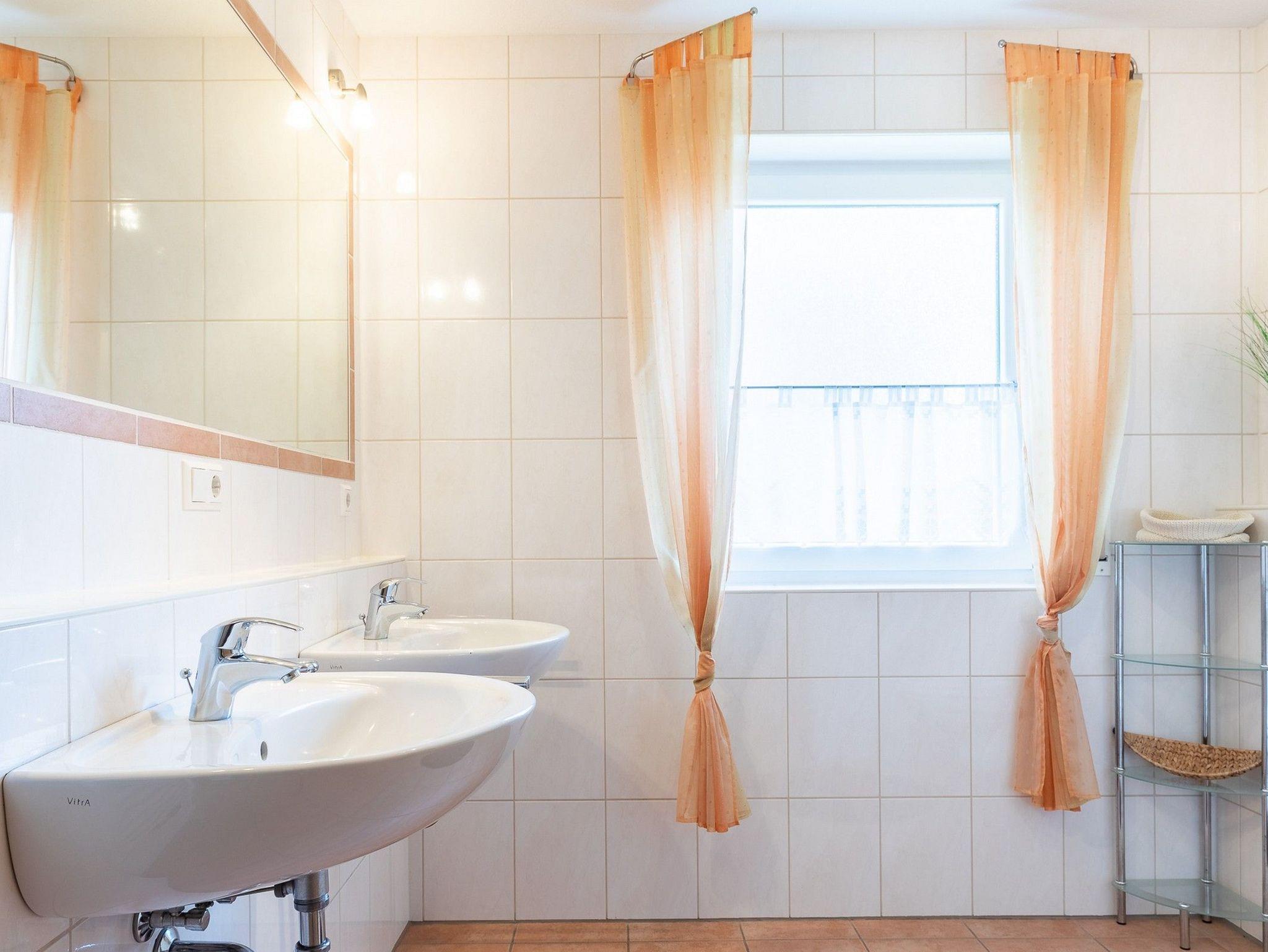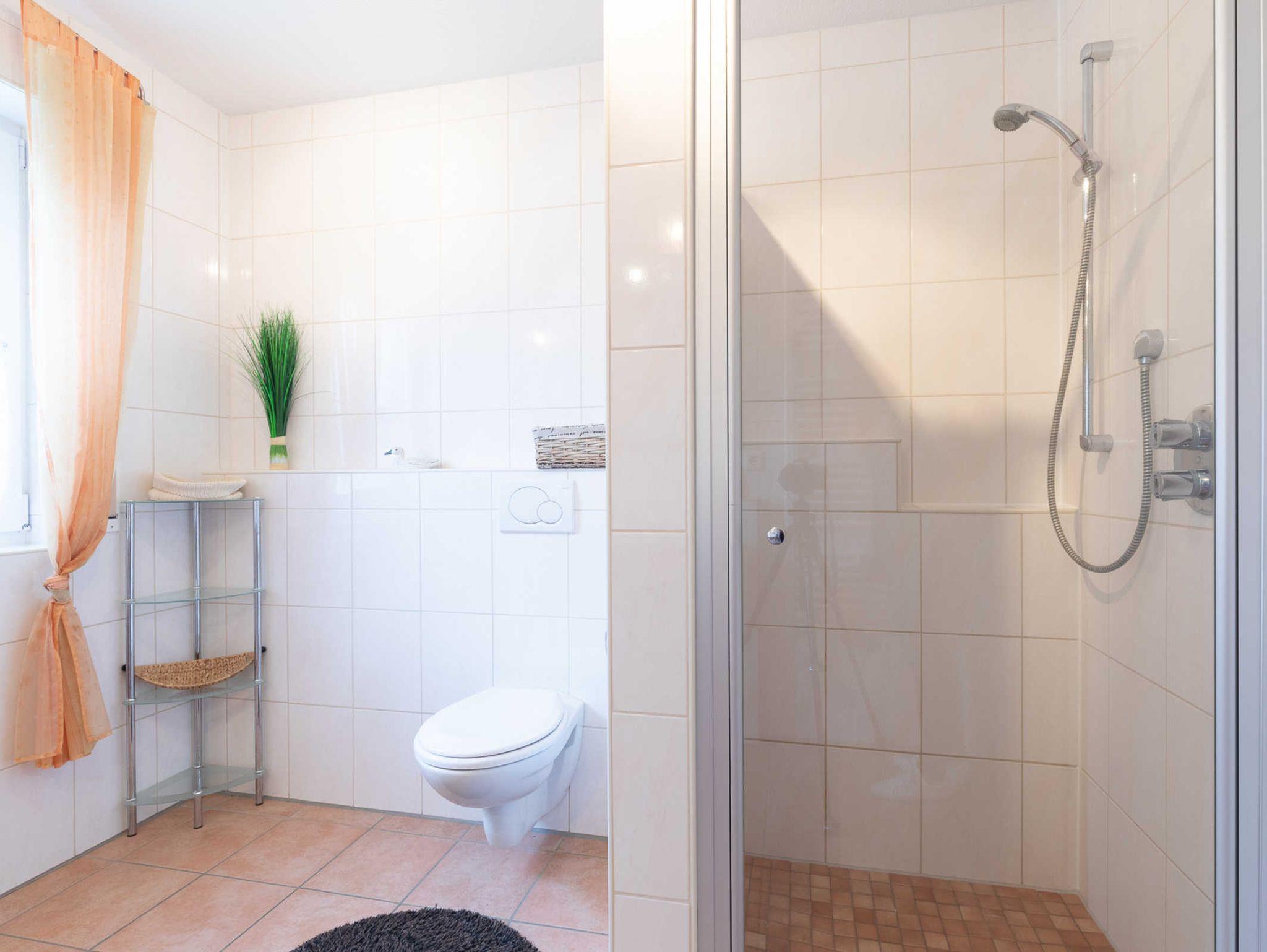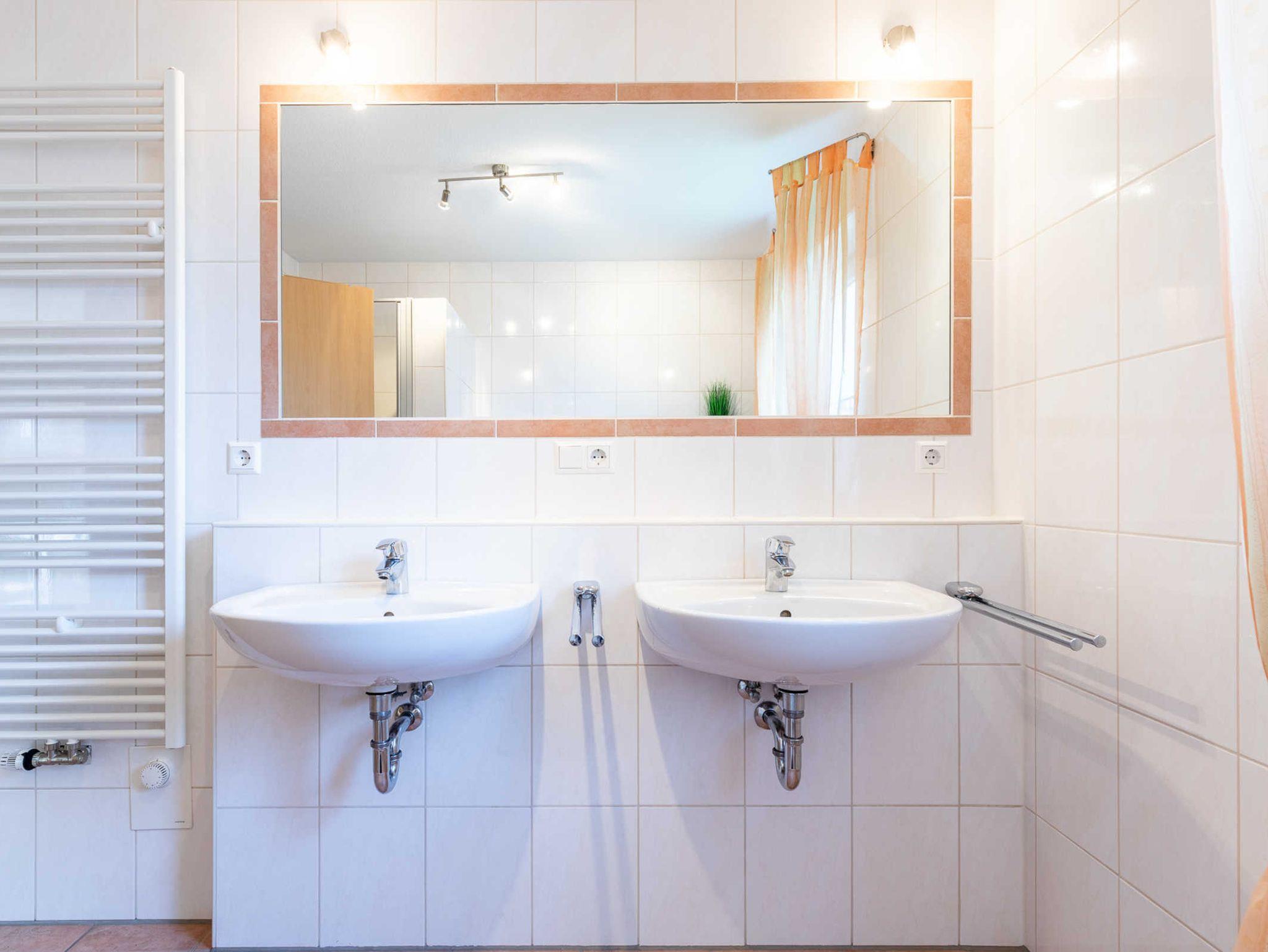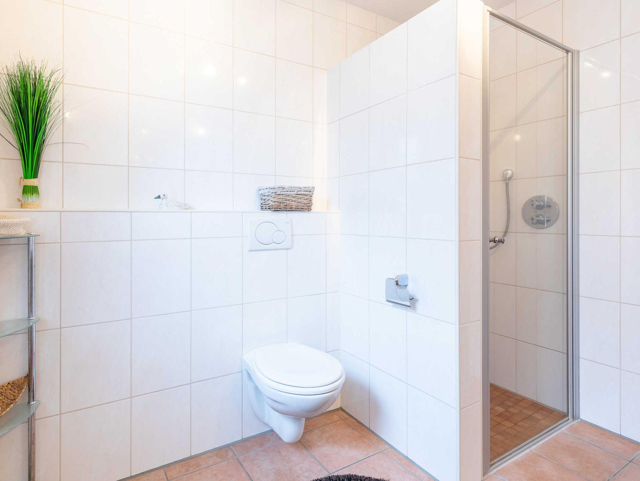 Auch das geräumige Duschbad mit Tageslicht, welches mit einer ebenerdigen Dusche, 2 Waschbecken und WC ausgestattet ist, finden Sie im unteren Bereich der Wohnung.