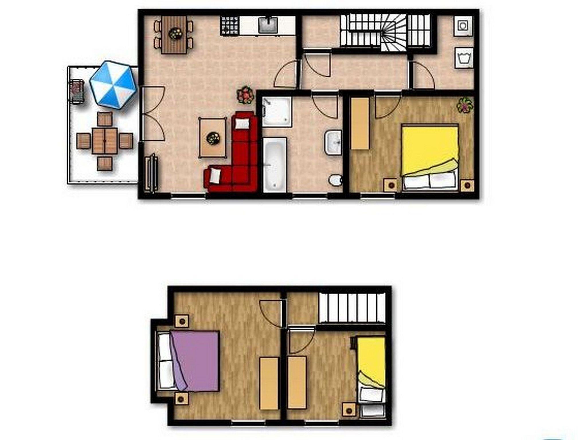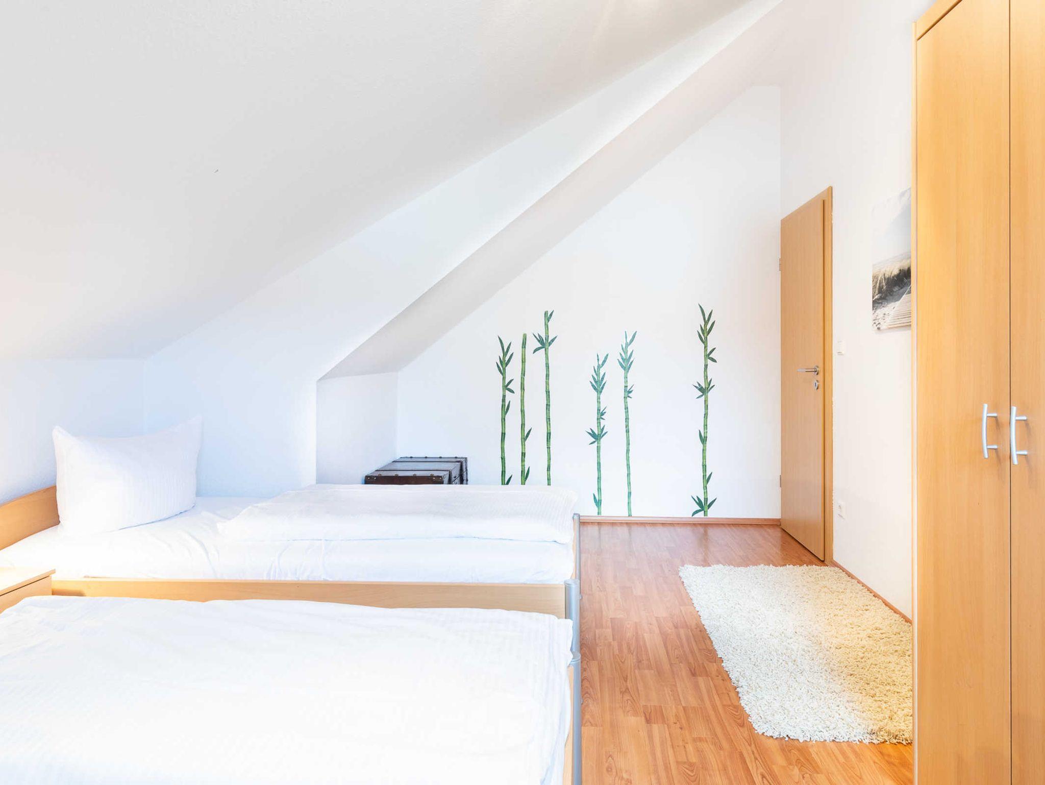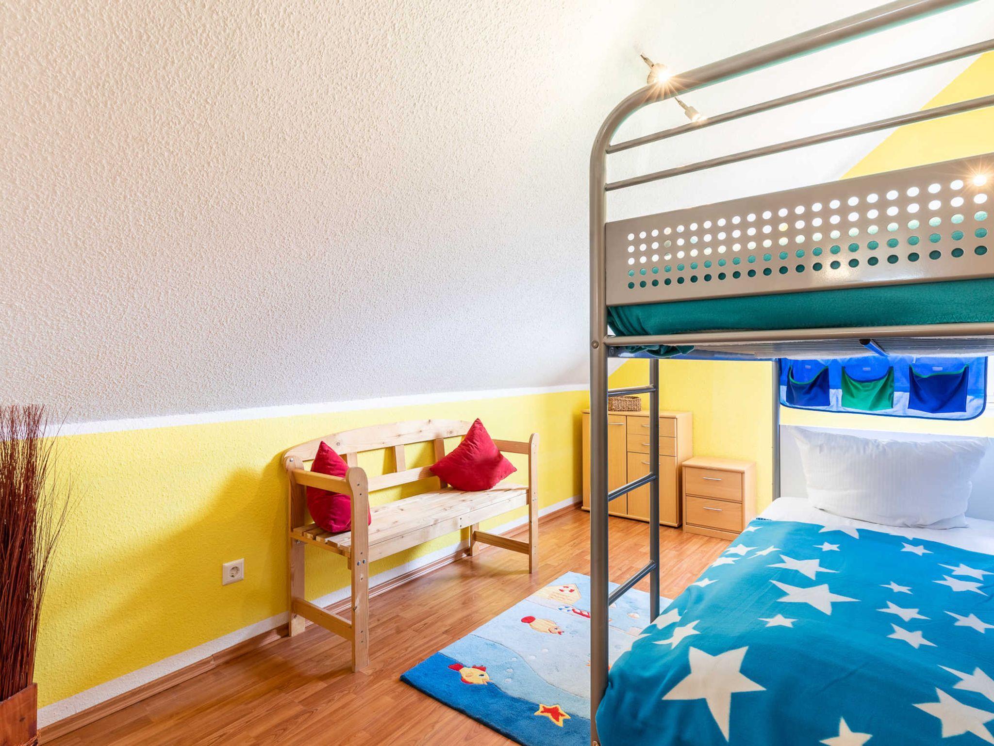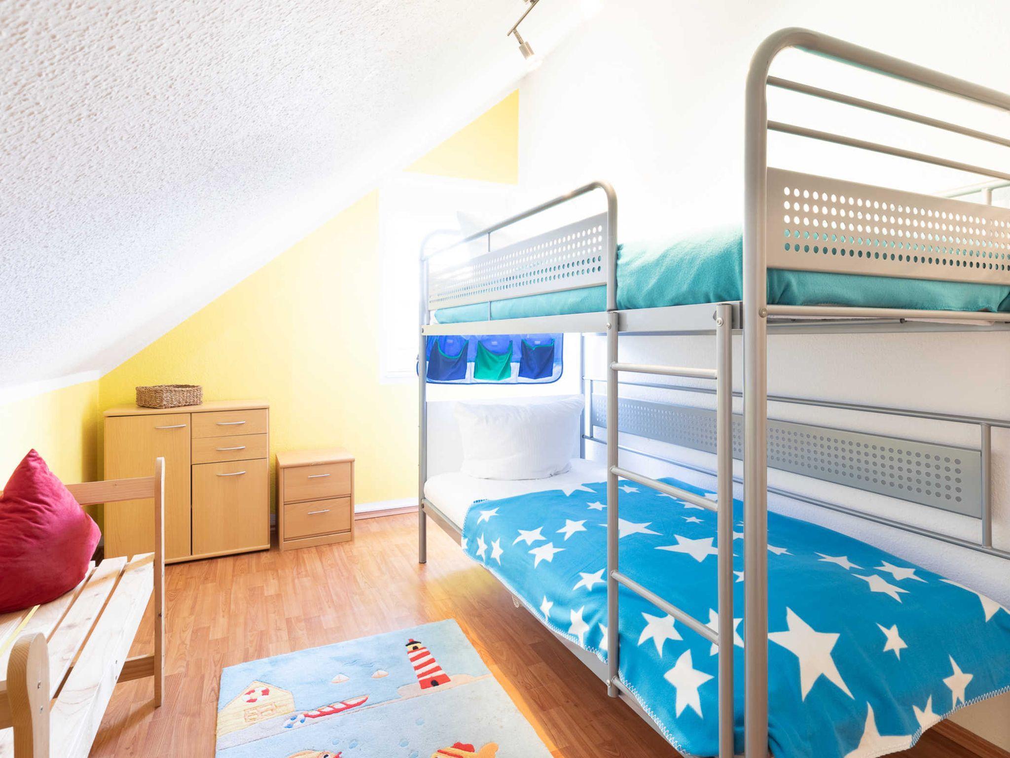 Im Dachgeschoss, der 2. Wohnebene sind die beiden Kinder-/ Gästezimmer eingerichtet. Eines davon ist mit einem Etagenbett und Kommode eingerichtet, das etwas größere Zimmer bietet 2 Einzelbetten, einen Kleiderschrank, Kommode und einen weiteren Fernseher. Hier ist auch Platz, um ein Reisebettchen aufzubauen.