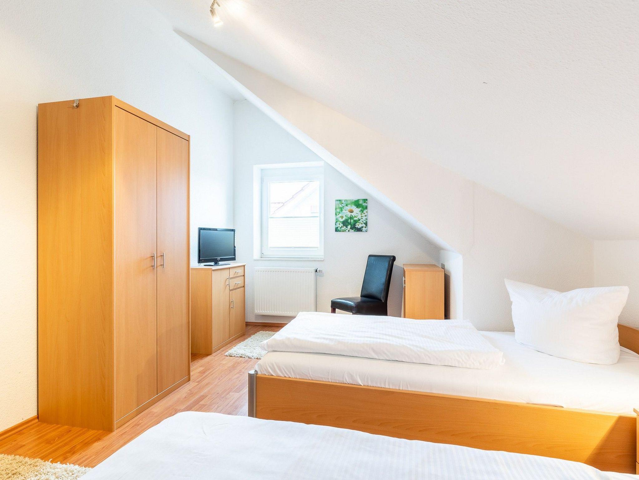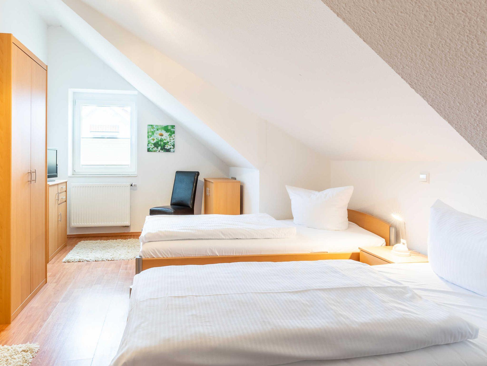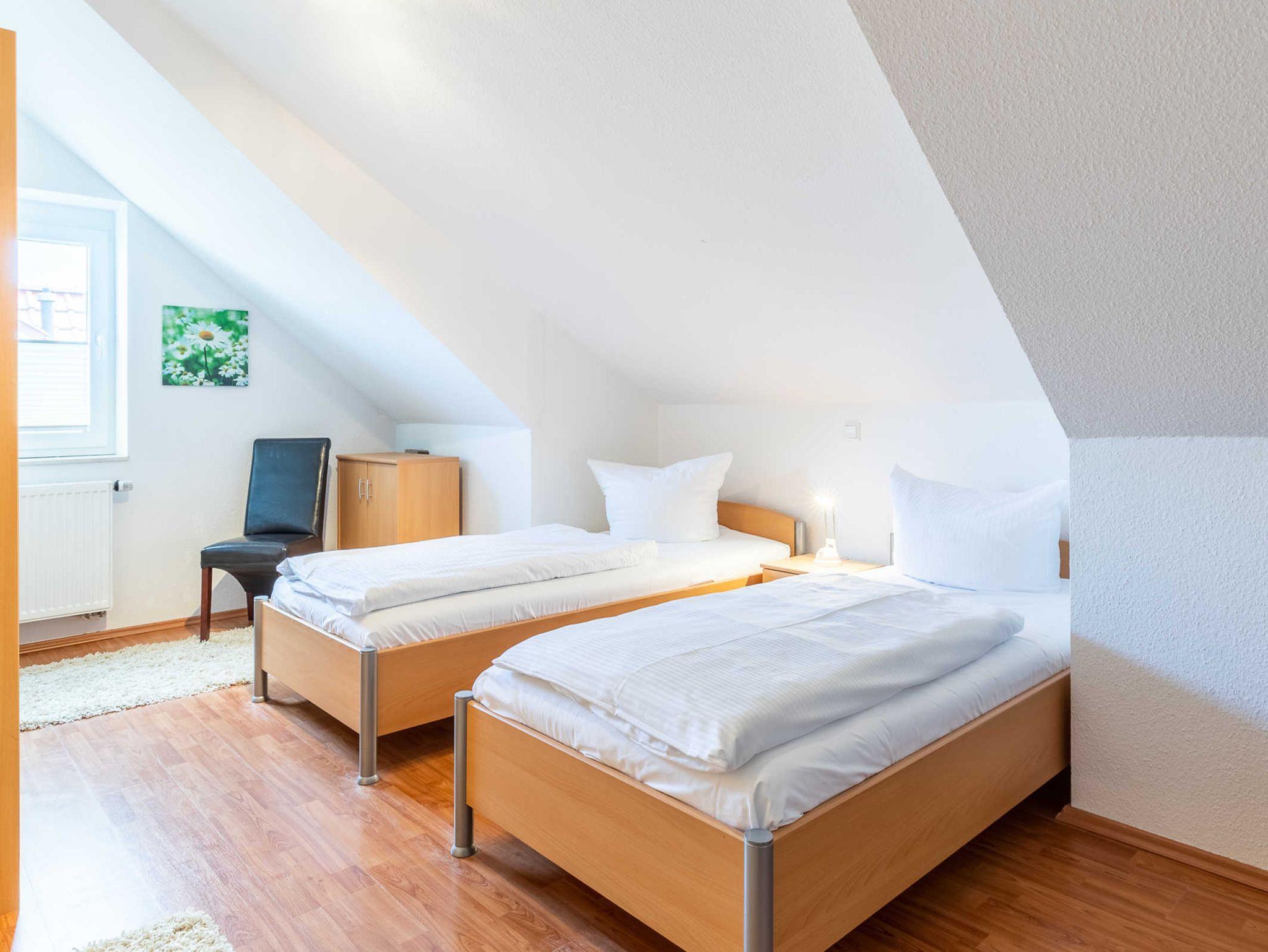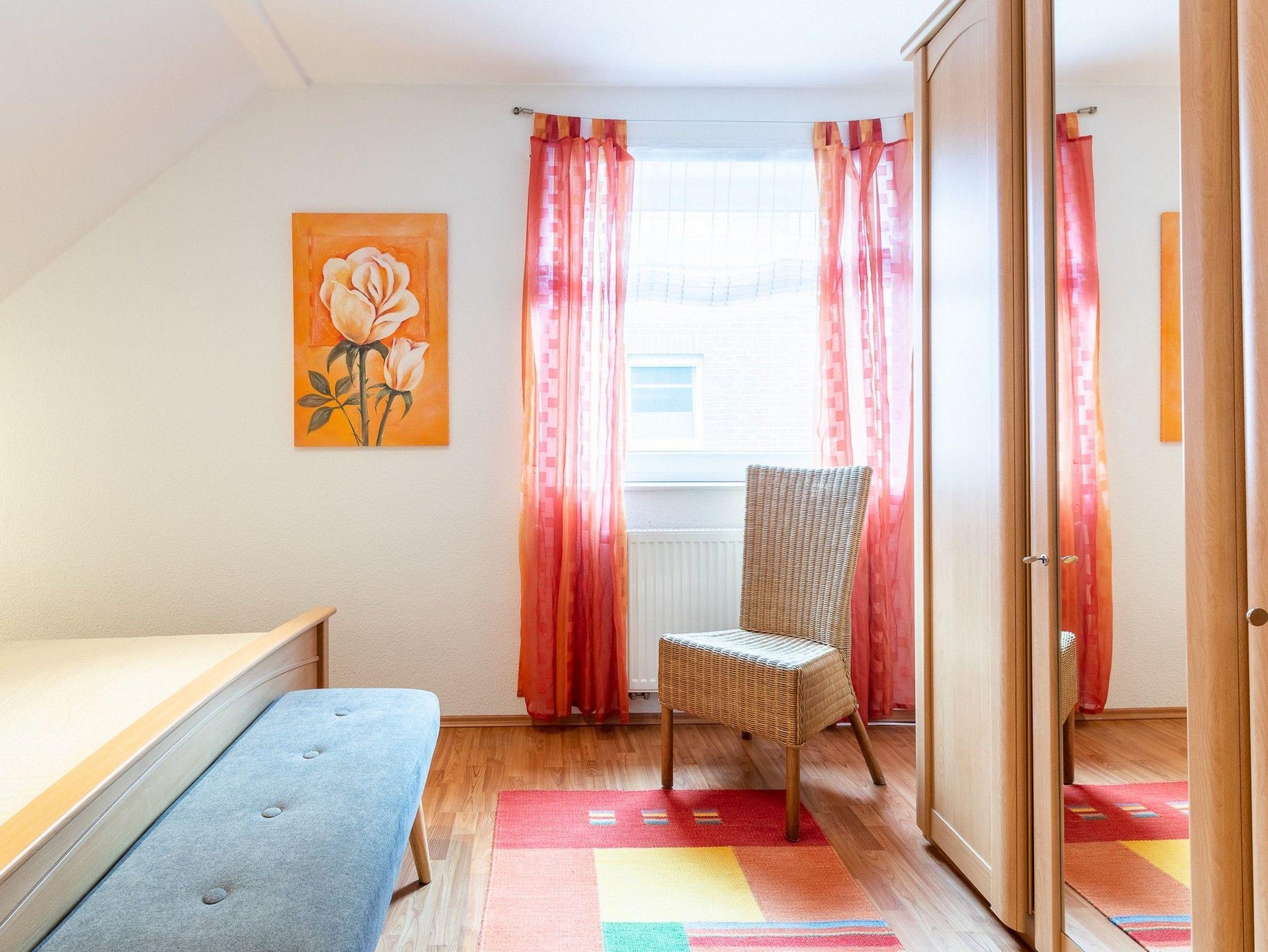 Im Dachgeschoss, der 2. Wohnebene sind die beiden Kinder-/ Gästezimmer eingerichtet. Eines davon ist mit einem Etagenbett und Kommode eingerichtet, das etwas größere Zimmer bietet 2 Einzelbetten, einen Kleiderschrank, Kommode und einen weiteren Fernseher. Hier ist auch Platz, um ein Reisebettchen aufzubauen.