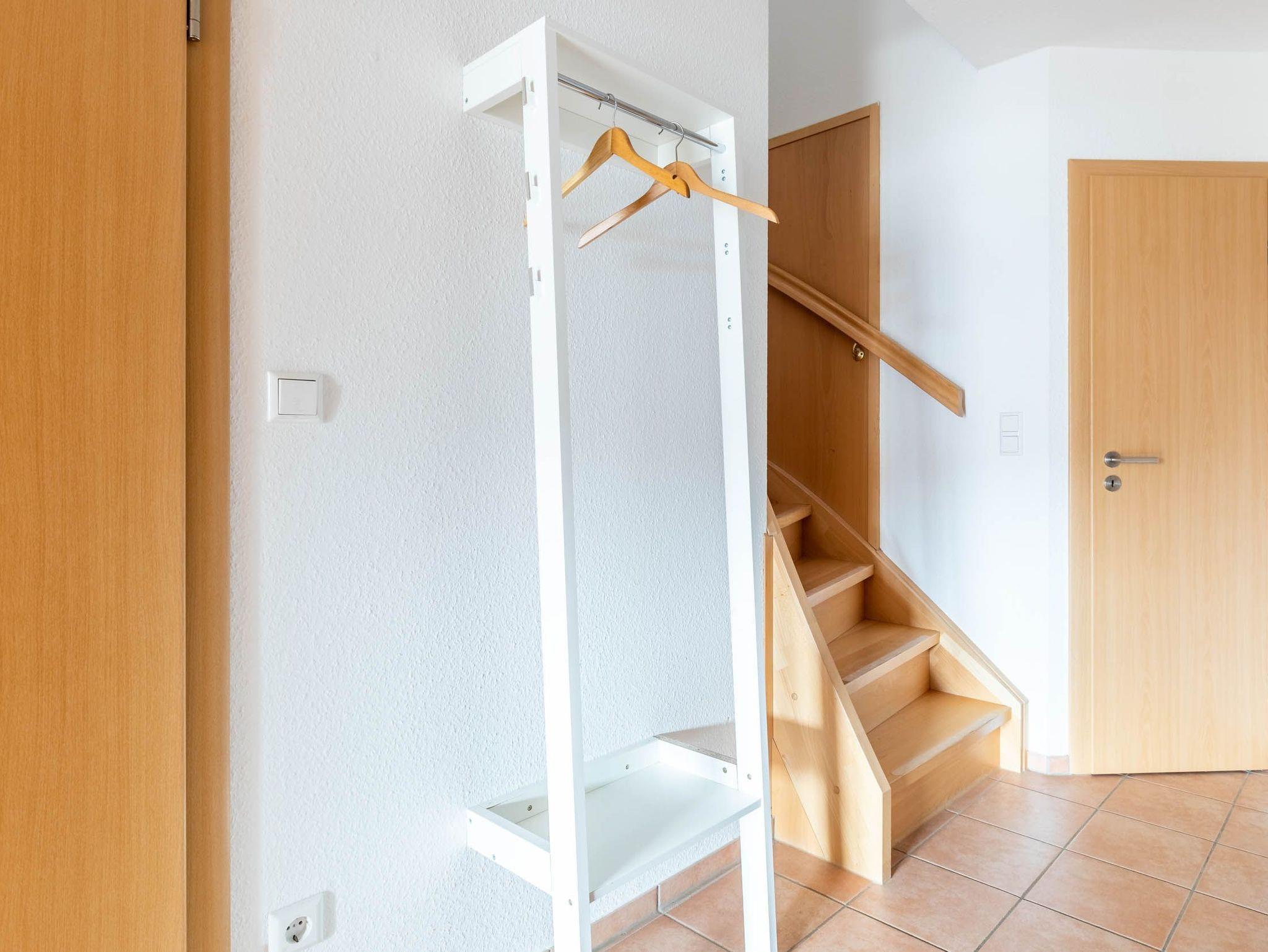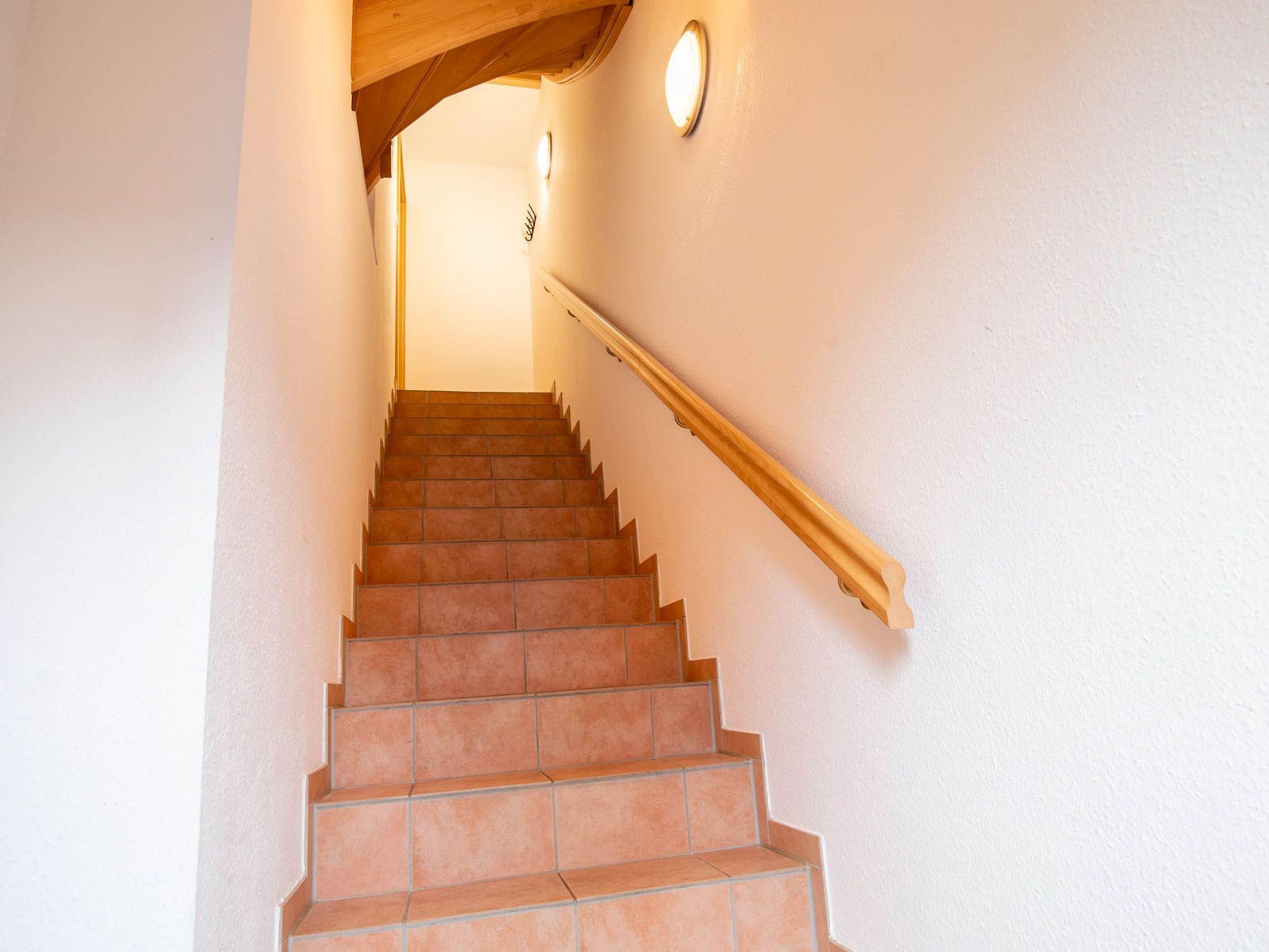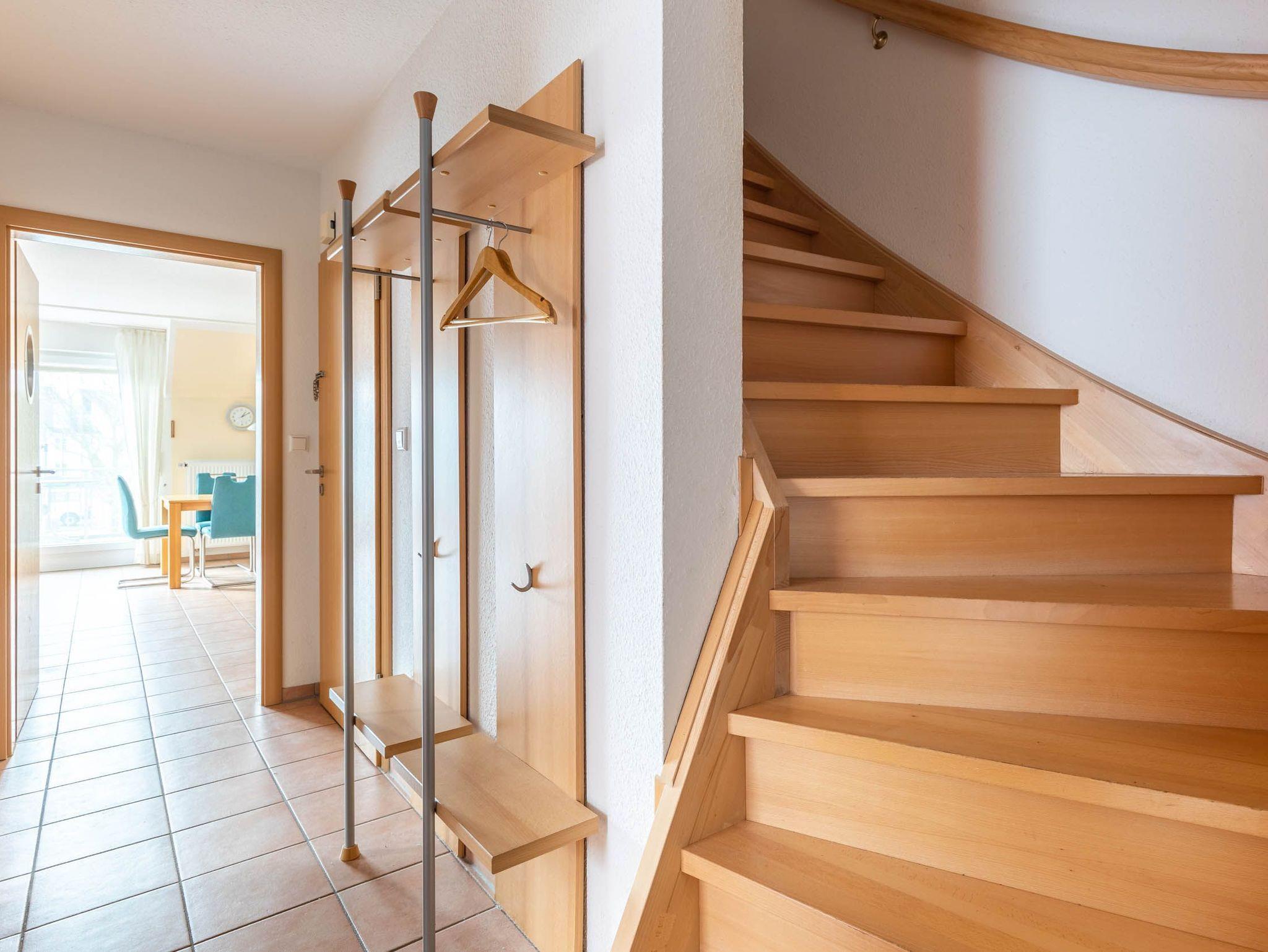 Vom Wohnungsflur aus führt eine Treppe ins Dachgeschoss. Am oberen Ende ist zur Sicherheit für unsere kleinen Gäste ein Treppenschutzgitter angebracht.