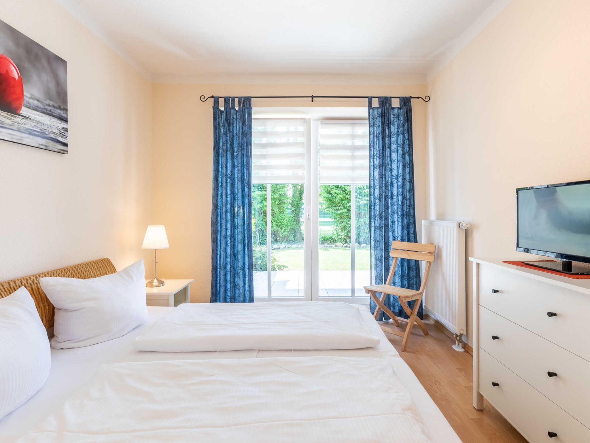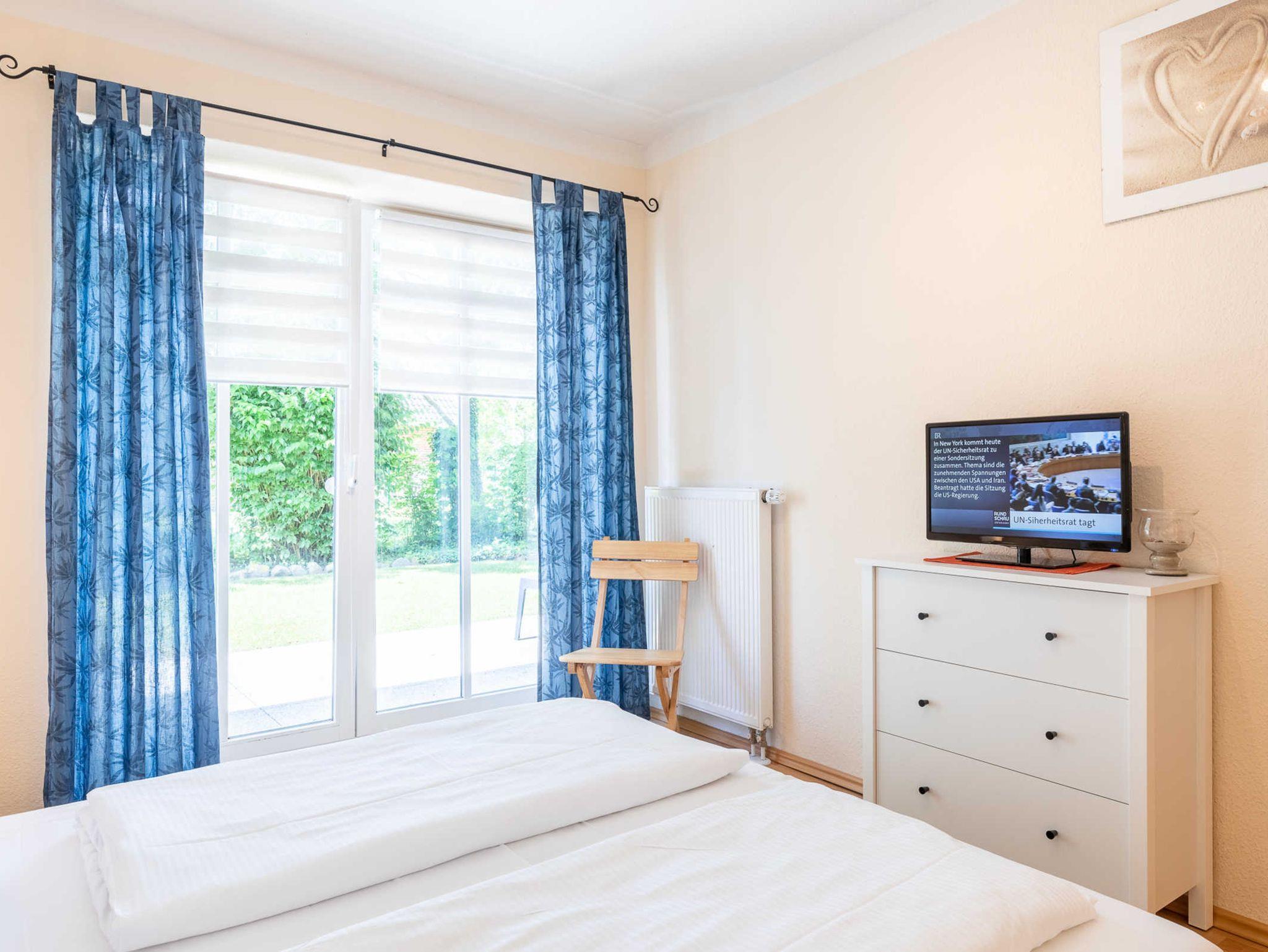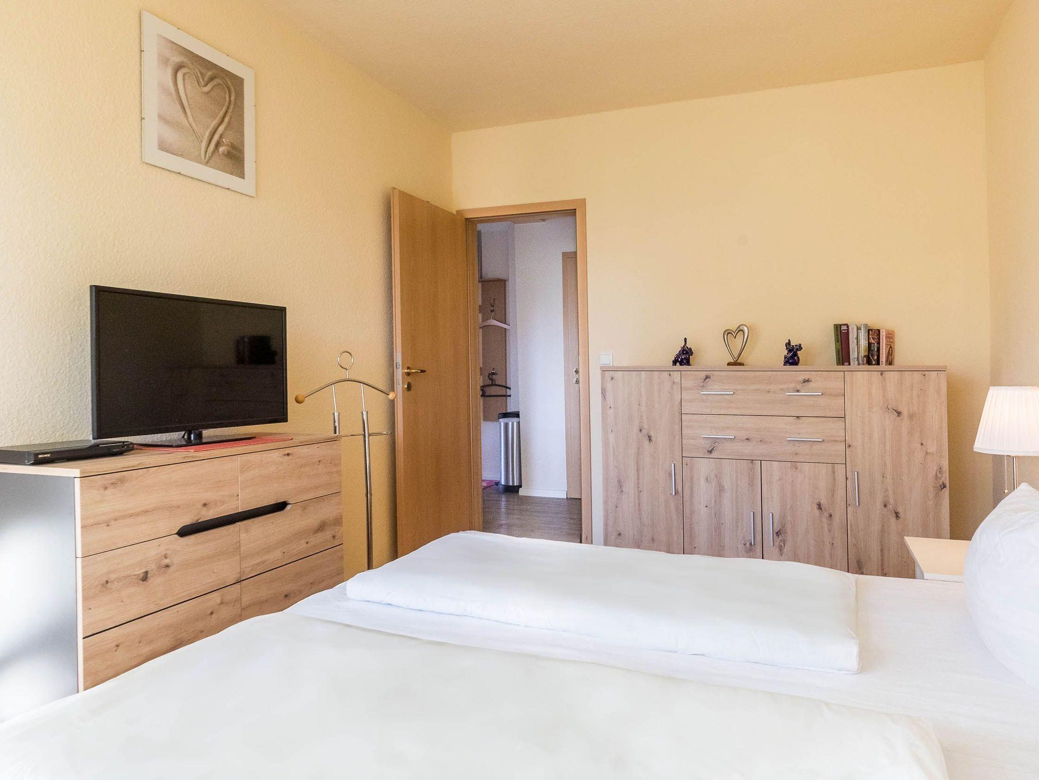Das Schlafzimmer ist mit einem komfortablen Doppelbett, Kommode und einem zweiten Fernseher ausgestattet.