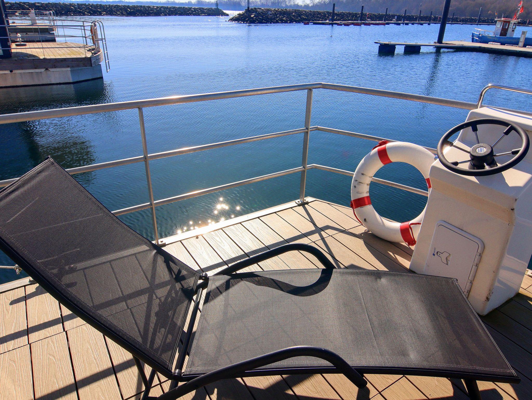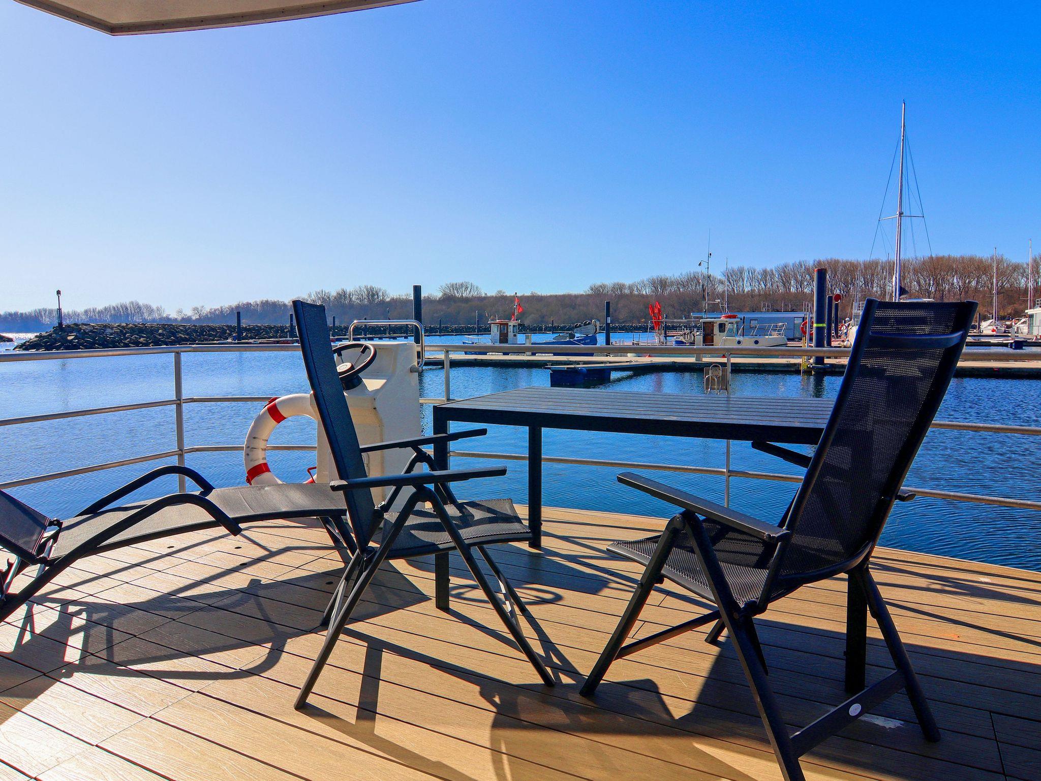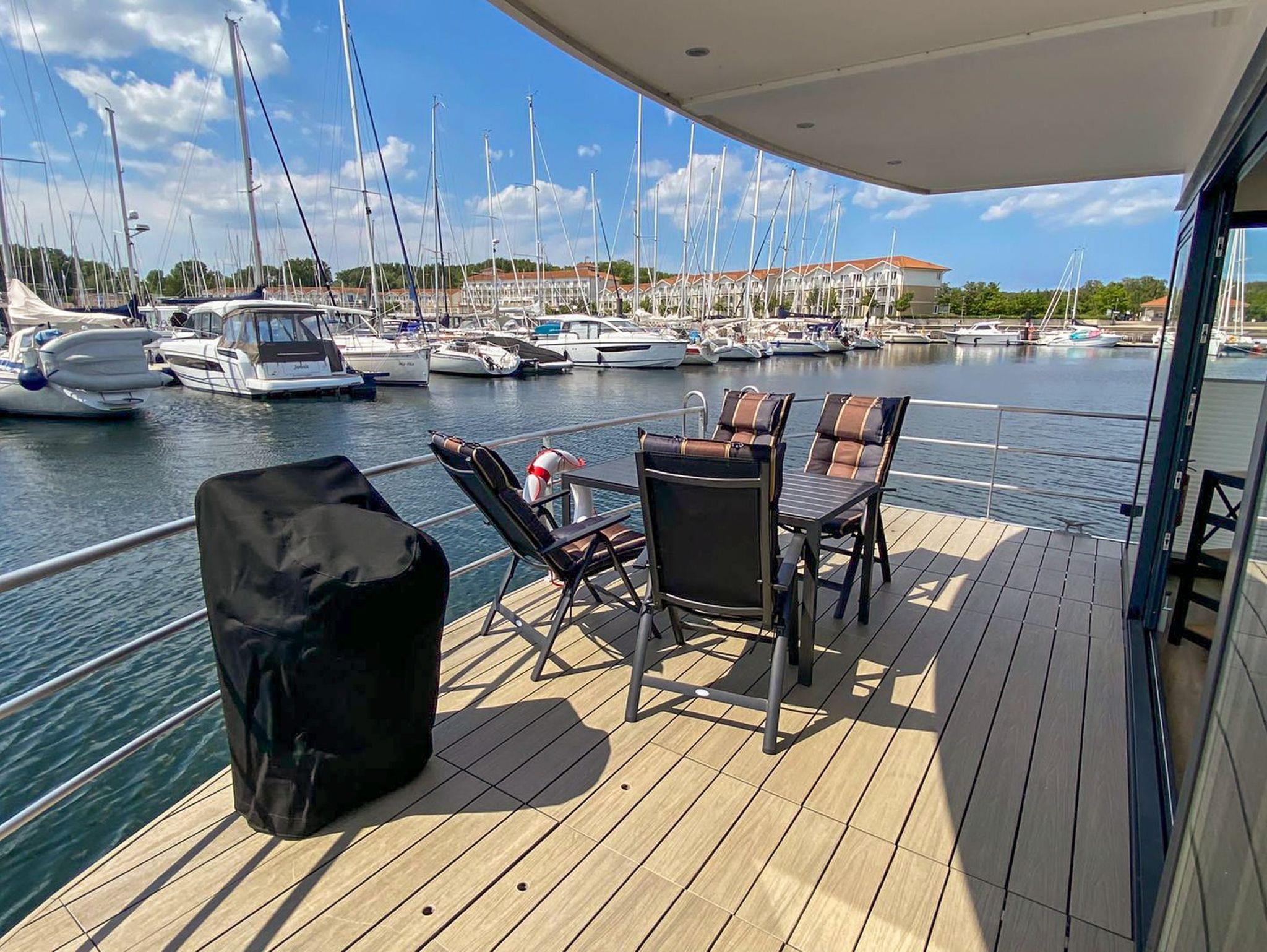 Erleben Sie maritimen Komfort auf dem Hausboot im Yachthafen Boltenhagen mit Terrasse und Dachterrasse.