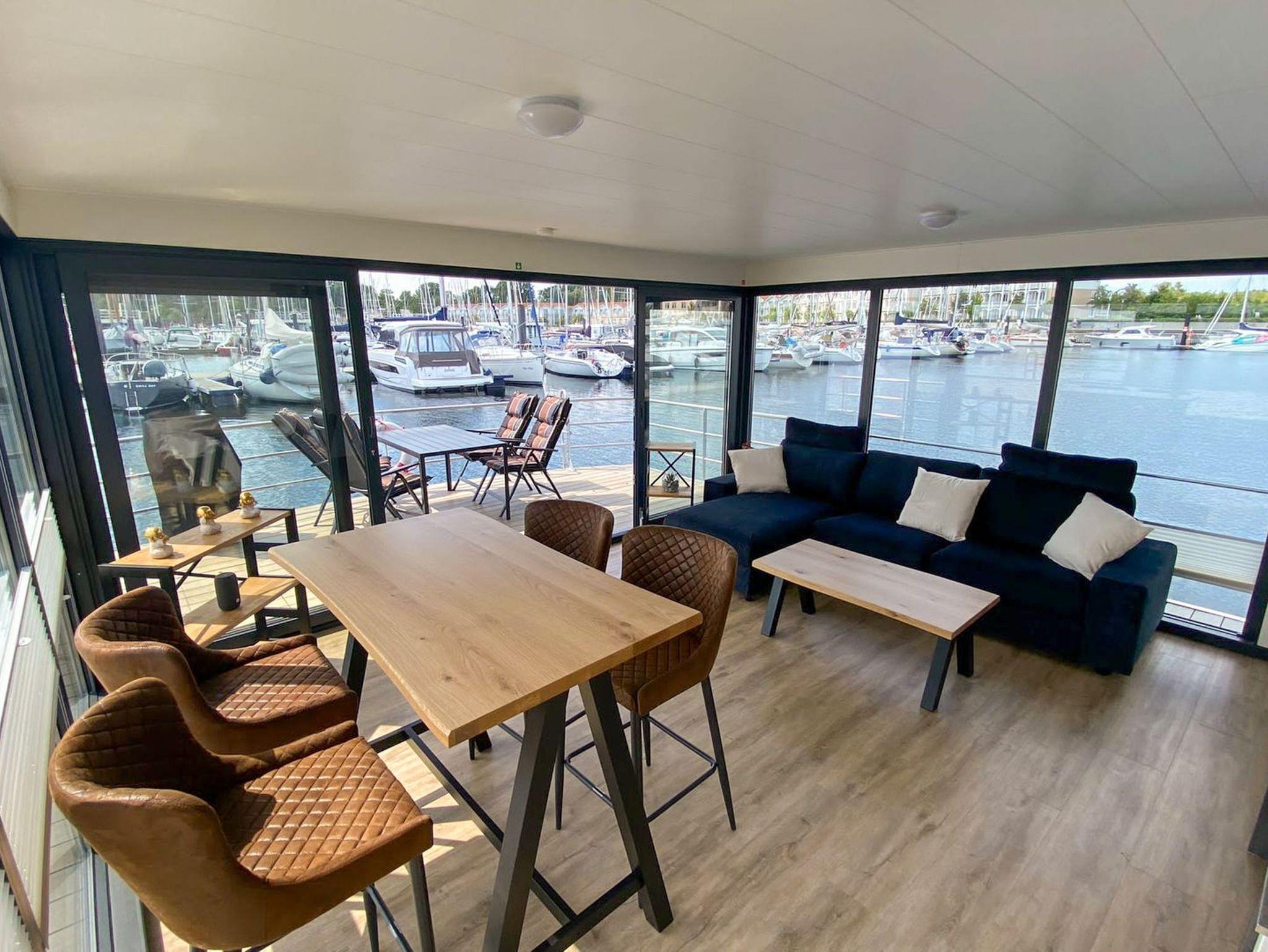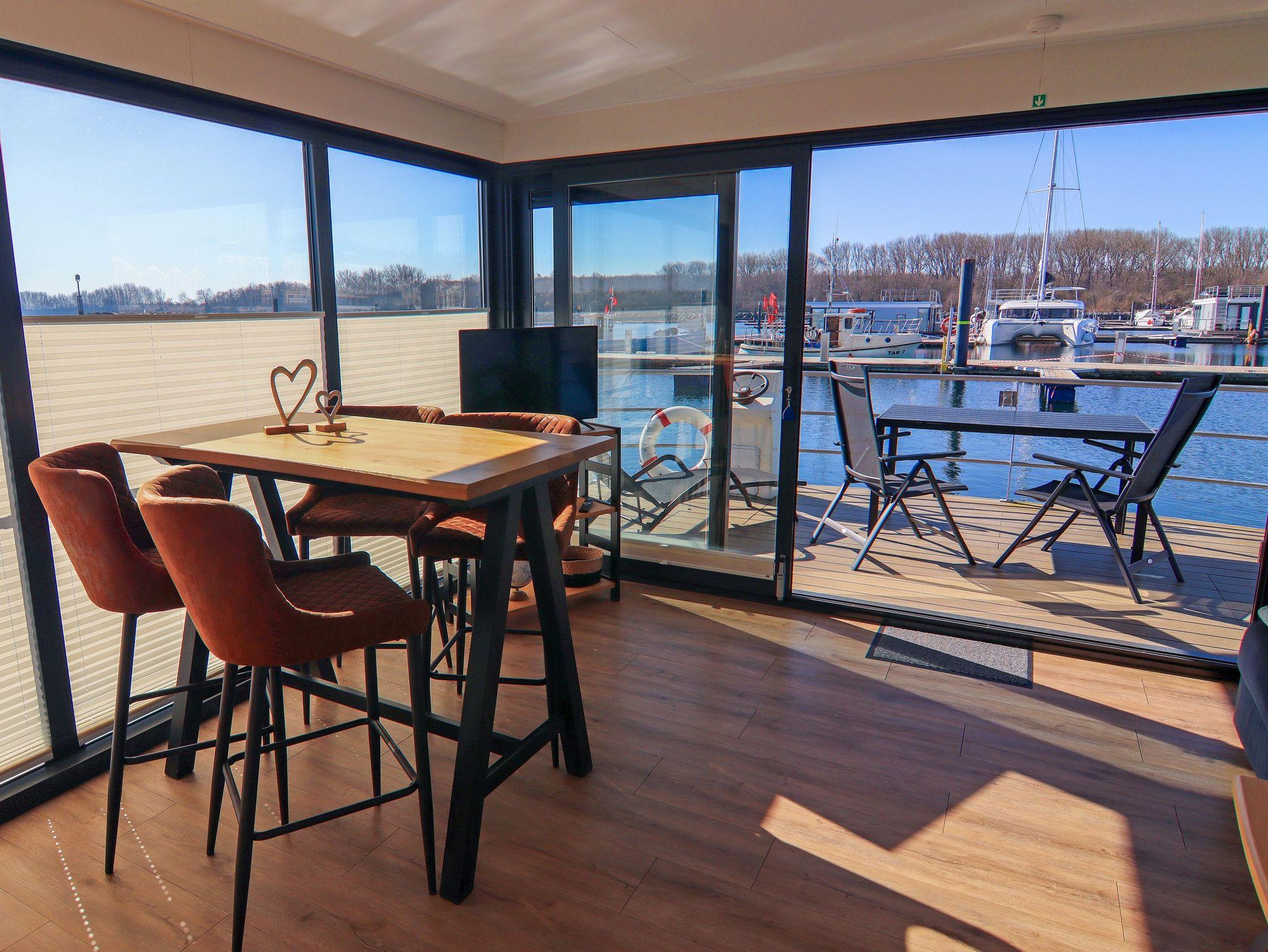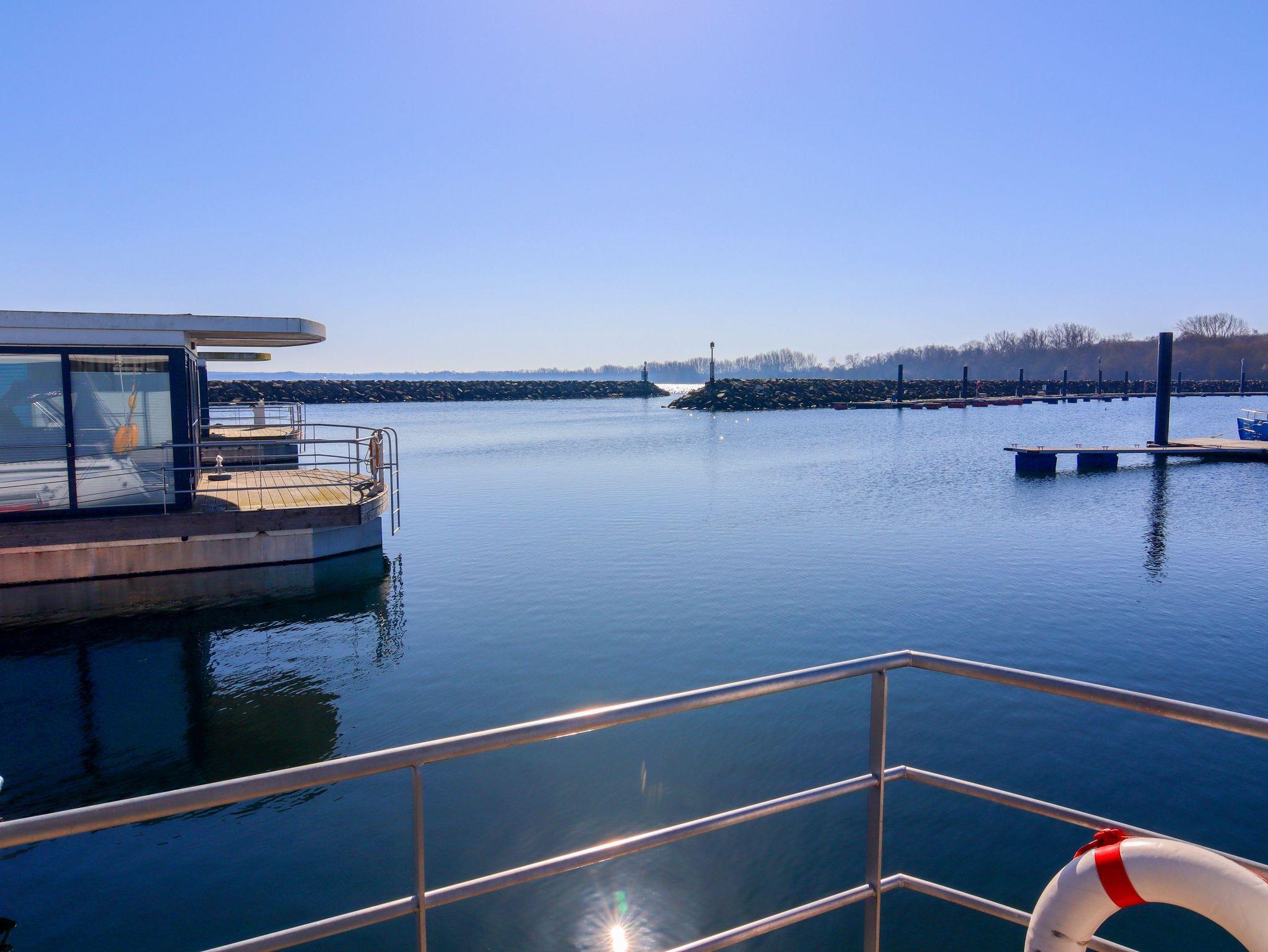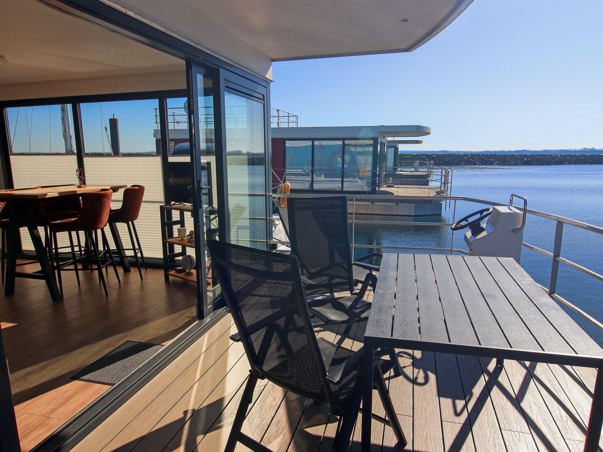 Erleben Sie maritimen Komfort auf dem Hausboot im Yachthafen Boltenhagen mit Terrasse und Dachterrasse.