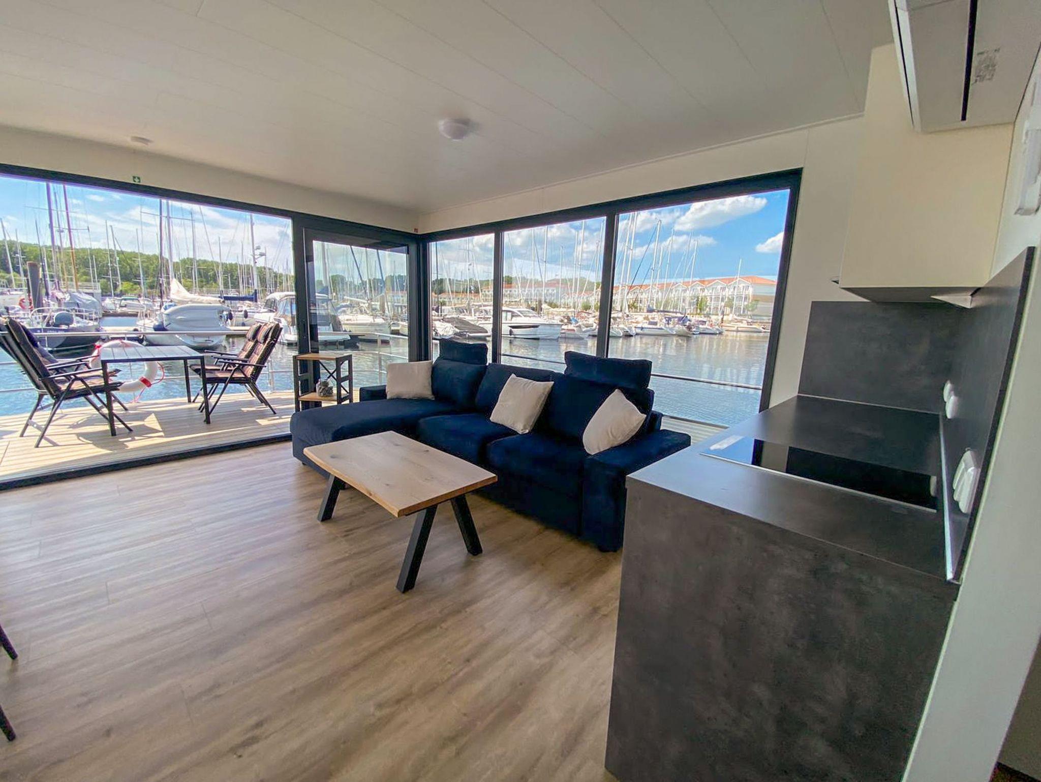 Floating Houses 44 im Ostseebad Boltenhagen bieten dir maritimes Urlaubsgefühl auf eine ganz besondere Art festliegend im Hafen und doch frei wie auf hoher See. Die modernen Hausboote sind für 3 bis 6 Personen geeignet und verbinden das ruhige Schaukeln des Wassers mit hochwertigem Wohnkomfort, viel Licht und ganz viel Luft zum Durchatmen. Jedes Hausboot verfügt über eine überdachte Terrasse am Bug und eine großzügige Dachterrasse ideal, um in den Tag zu starten, den Abend ausklingen zu lassen oder einfach die Sonne über dem Wasser zu genießen. Die Wohnbereiche sind offen gestaltet, mit gemütlicher Sofaecke, moderner Küchenzeile, Essplatz und großen Fensterfronten, die dir das Gefühl geben, direkt draußen zu sein. Ein bis zwei Schlafzimmer und ein hochwertiges Bad machen die Boote zum perfekten Rückzugsort für Paare, Familien oder Freunde. Ein Parkplatz pro Hausboot steht dir natürlich zur Verfügung.