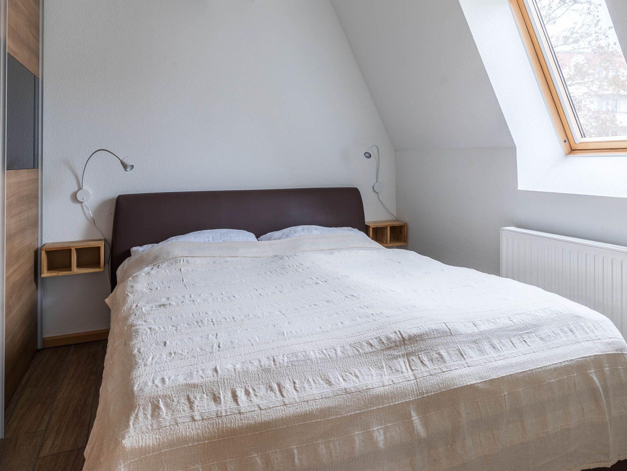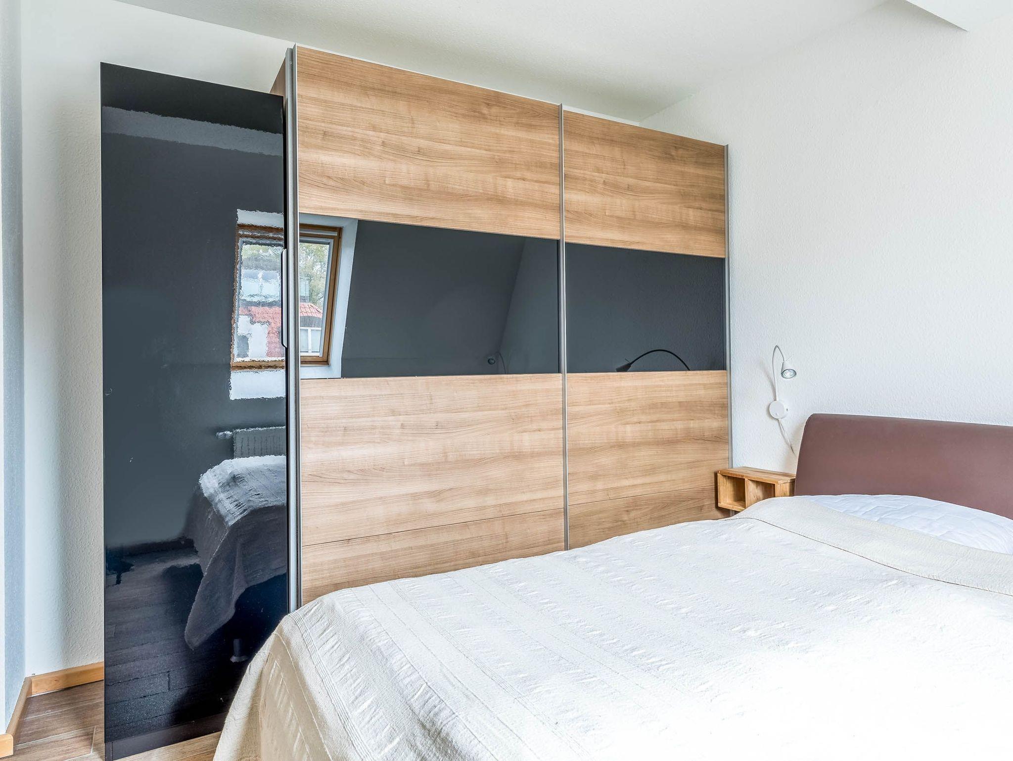 Auch eines der beiden Schlafzimmer ist im unteren Bereich der Wohnung mit einem Doppelbett und großem Kleiderschrank hergerichtet.