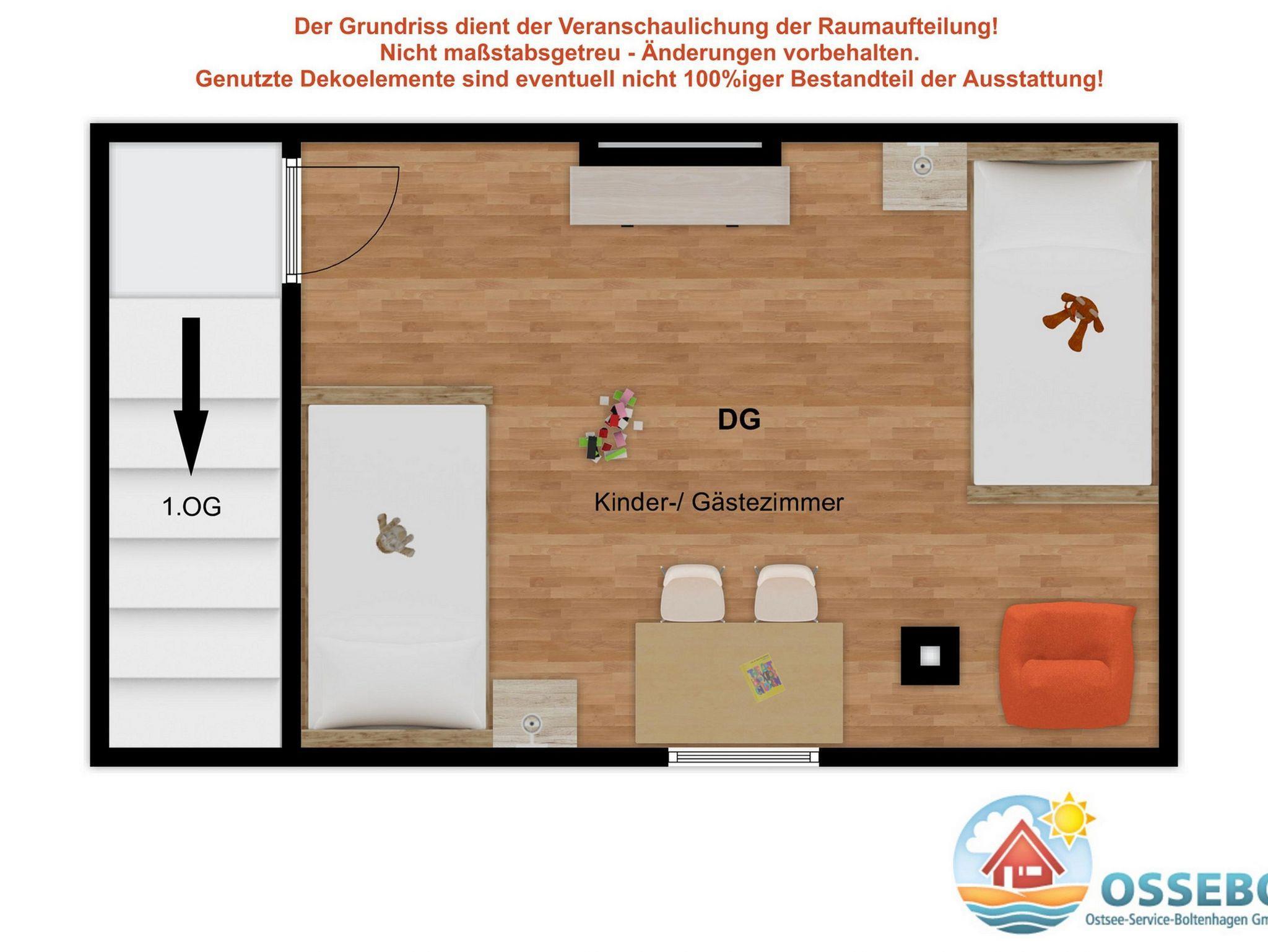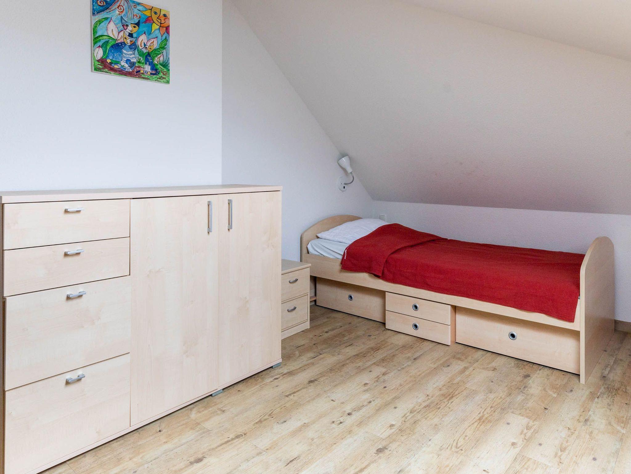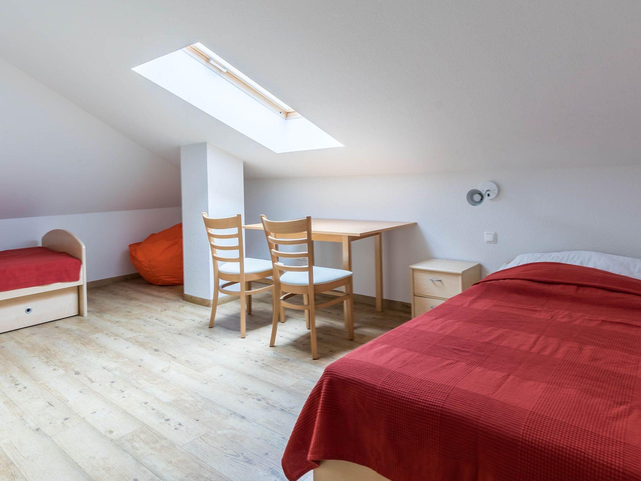 Das zweite Schlafzimmer/ Gästezimmer finden Sie in der 2. Wohnebene, im DG und bietet zwei Einzelbetten, wovon bei einem noch ein zusätzliches Bett ausgezogen werden kann und somit einen 5. Schlafplatz schafft. Weiterhin können hier an dem Schreibtisch z.B. Urlaubspost geschrieben oder tolle Urlaubsbilder gemalt werden.