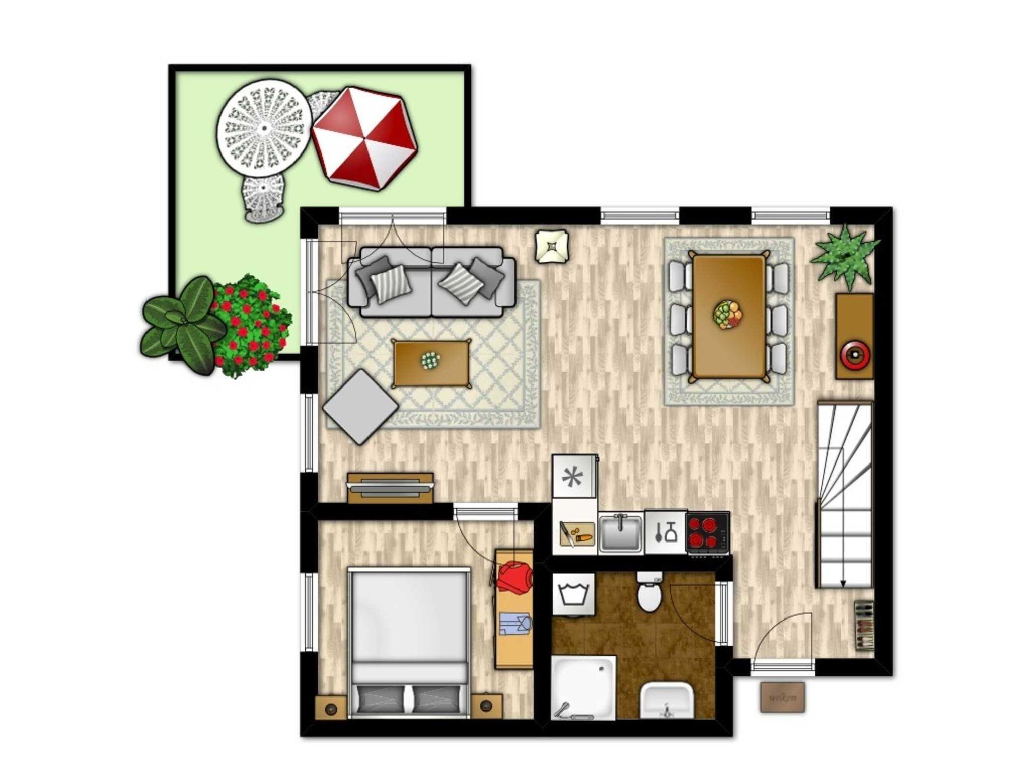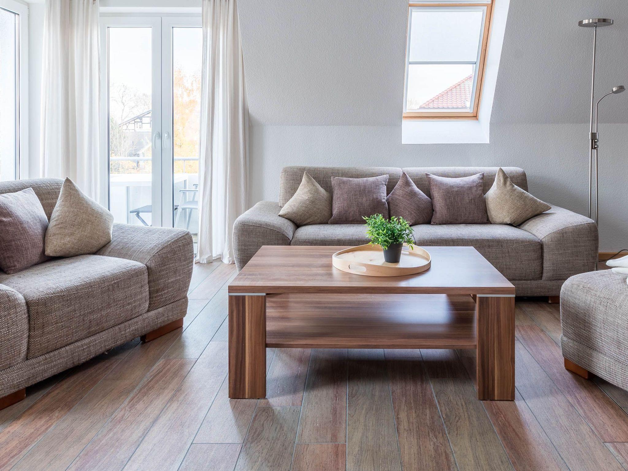 Der offene Wohn- und Essbereich in der 1. Wohnebene bildet das Zentrum. Hier sitzt man gemütlich bei den Mahlzeiten zusammen oder entspannt auf dem Sofa.