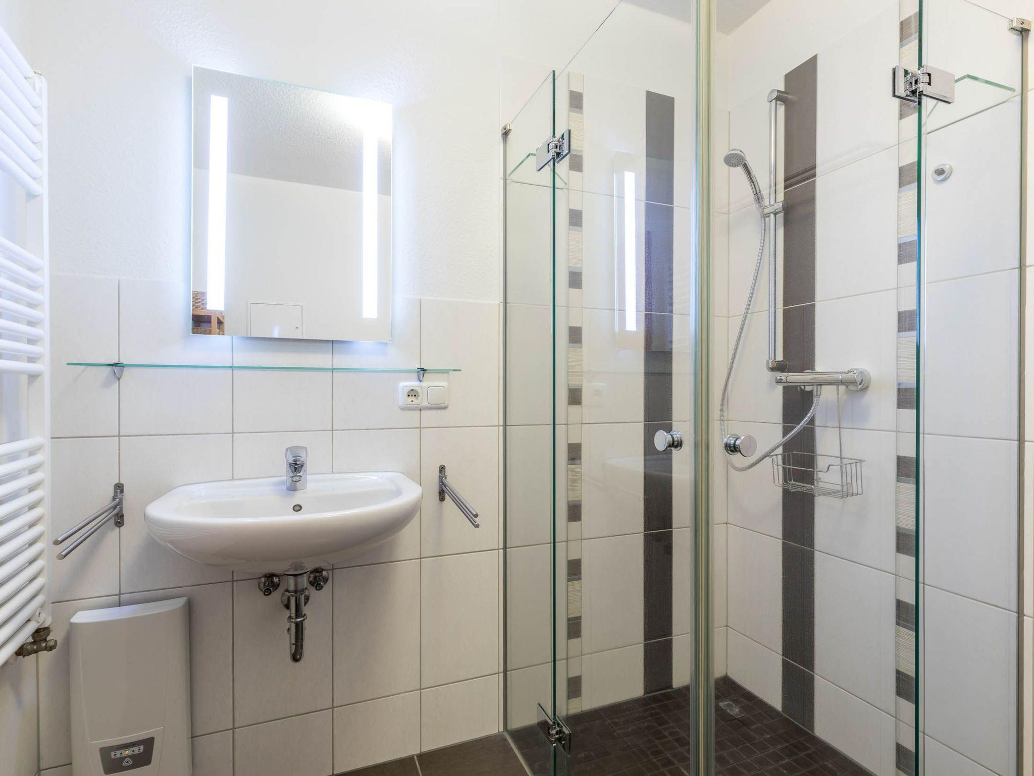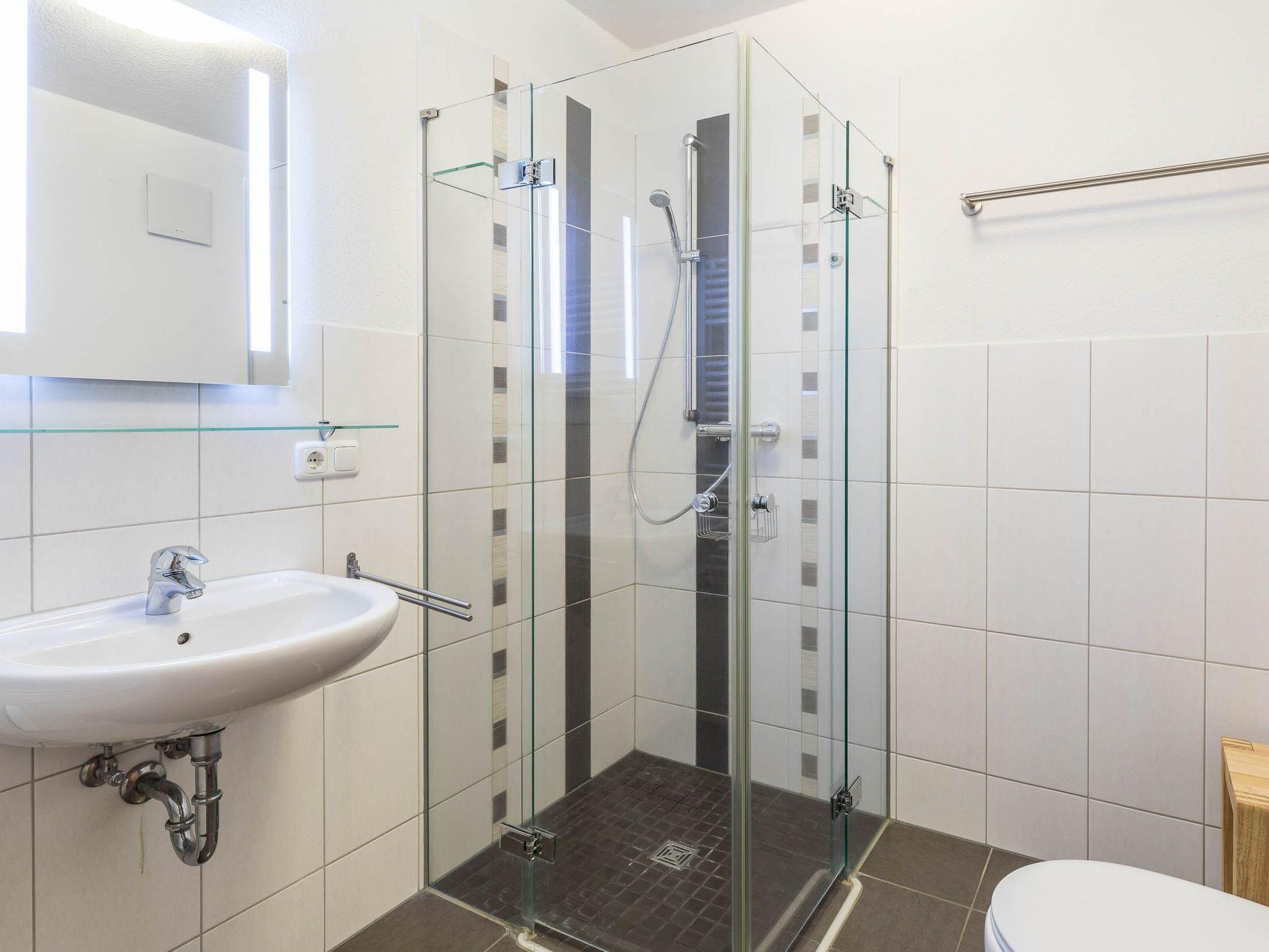 Ein modern eingerichtetes Duschbad auf selbiger Etage mit ebenerdiger Dusche komplettiert das geschmackvolle Quartier für den unvergesslichen Ostseeurlaub in Boltenhagen.
