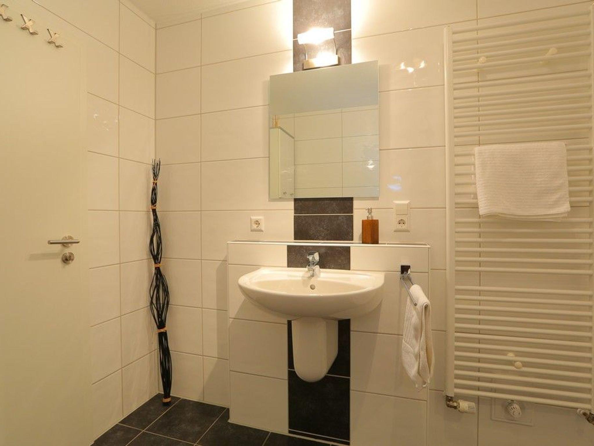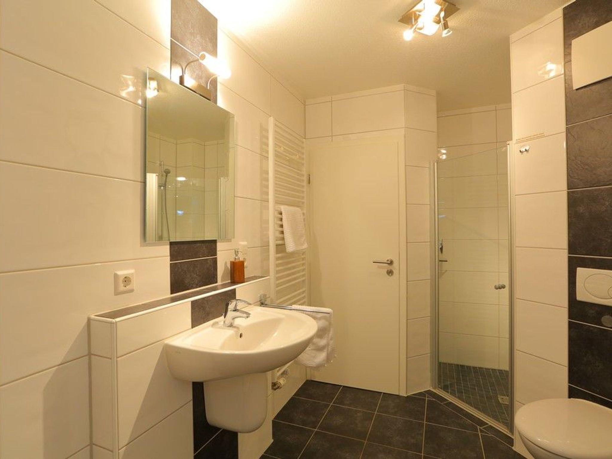 Das moderne Bad bietet eine ebenerdige Dusche, WC und Waschbecken.