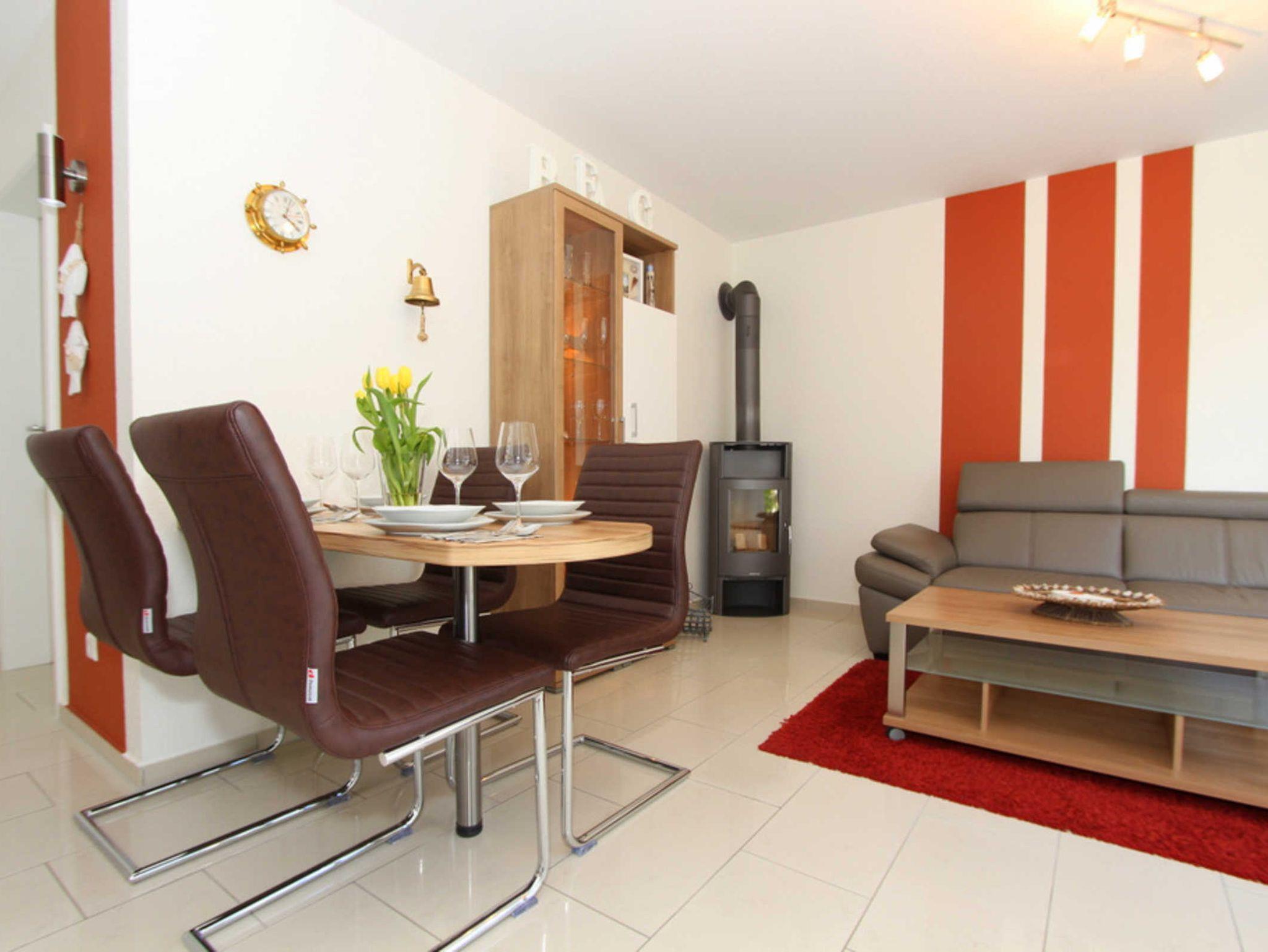 In dieser komfortablen 2-Zimmer-Ferienwohnung im EG finden Sie auf 50qm Wohnfläche für 4 Gäste einen großzügigen, kombinierten Wohn- und Essbereich mit Kamin.